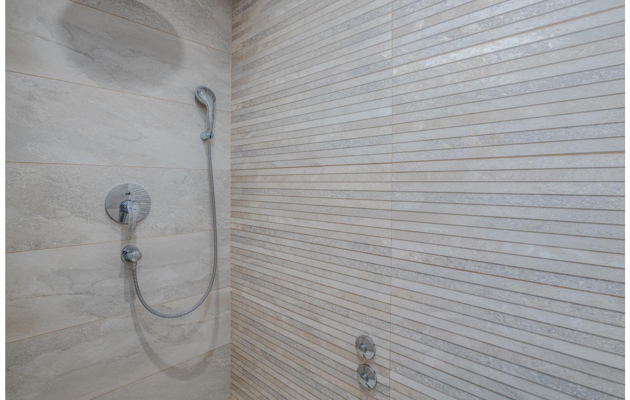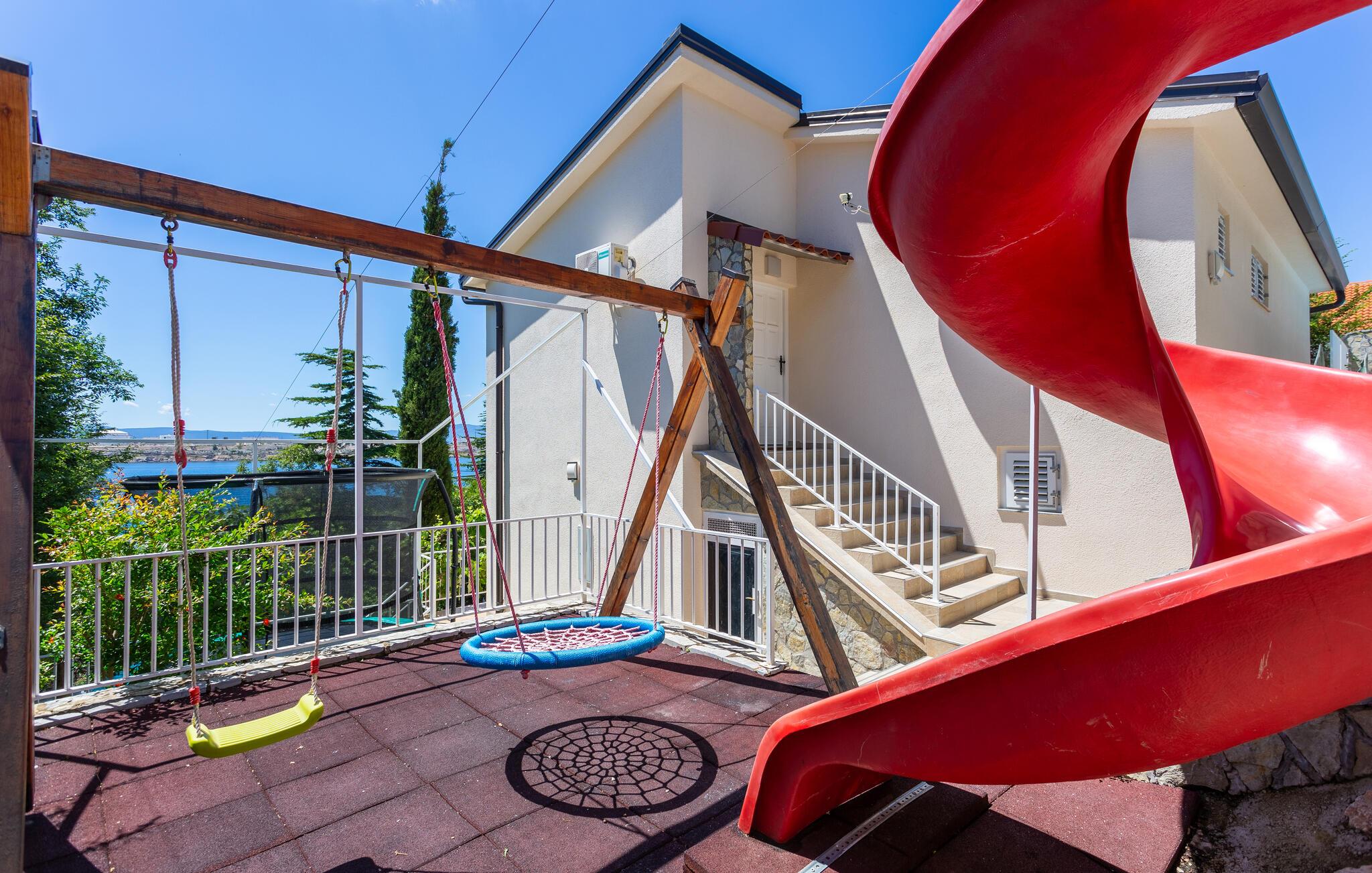 Den består af to boligenheder på to etager, der er forbundet med udvendige trapper. Slap af på terrassen, og nyd den vidunderlige udsigt over havet. Der er også et udendørs køkken til din rådighed, og du kan køle af i poolen på varme sommerdage. Der er faciliteter for børn på flere niveauer i haven, så børnene kan lege i sandkassen, på rutschebanen og gyngen eller hoppe rundt på trampolinen. Slap af i skyggen med en cocktail. Overdækkede parkeringspladser er også tilgængelige.