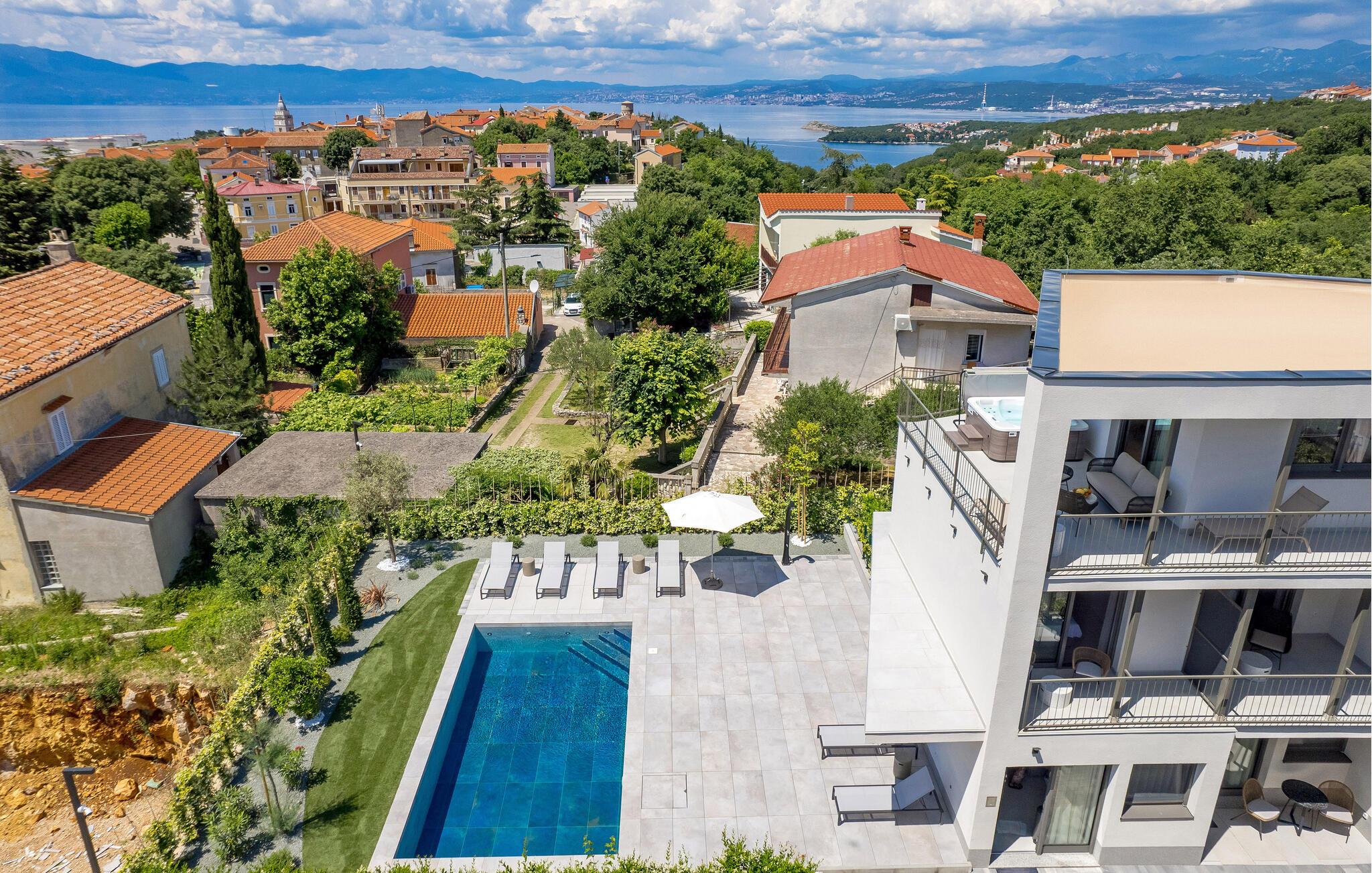 Træd ud på den store terrasse, og nyd panoramaudsigten over havet, og bad også i jeres private udendørs spabad, hvilket kan blive en aftenrutine under jeres ferie. Yderligere forfriskning finder I i den opvarmede swimmingpool i fælleshaven, der takket være liggestolene også indbyder til solbadning.