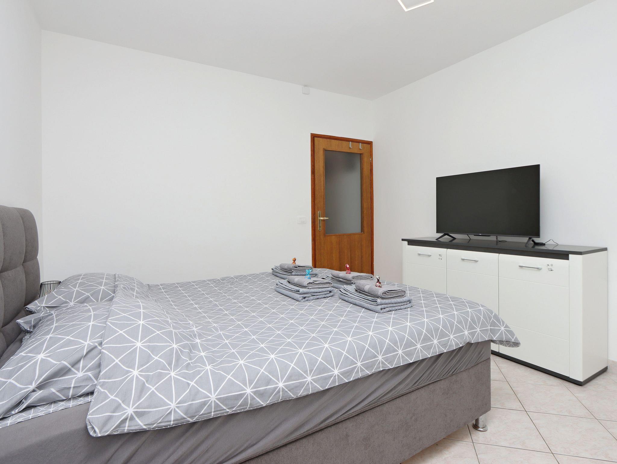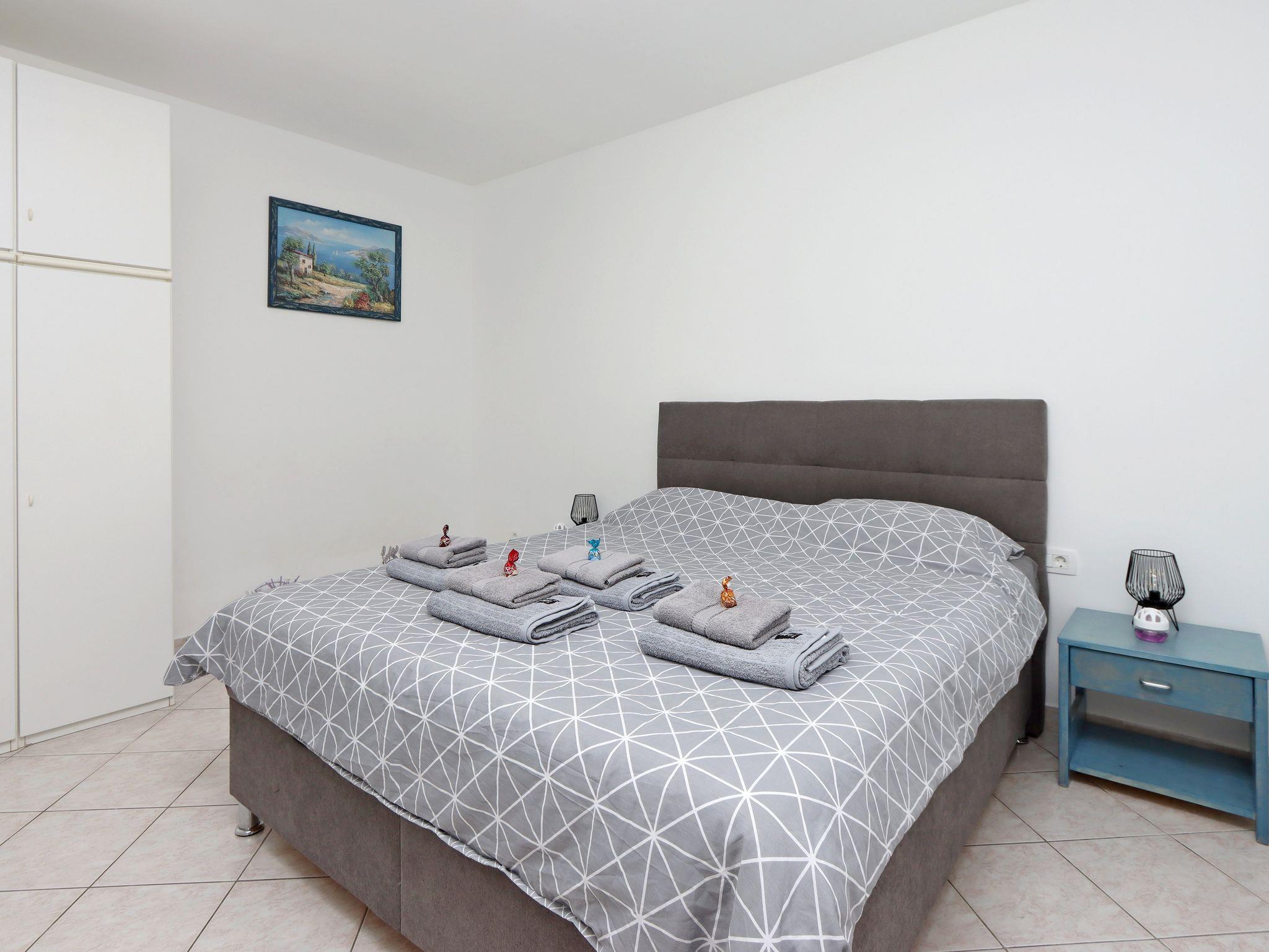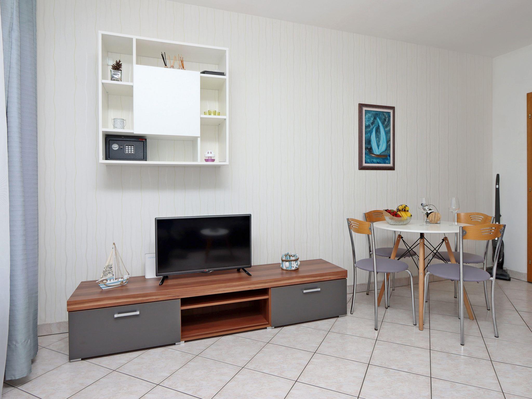 Ferienwohnung bietet Platz für 5 Gäste. Die Betten sind in Schlafzimmern, die es 1 gibt, und in Wohnzimmer, innerhalb einer Gesamtfläche von 39m2, angeordnet. Die Gäste haben eine eigene Terrasse zur Verfügung, auf der sie in warmen Sommernächten genießen können. Das Apartment bietet Meerblick. Es ist erlaubt, Speisen auf dem Gemeinschafts-Grill vorzubereiten. IM PREIS INBEGRIFFEN: Kurtaxe, Endreinigung, Klimatisierung, Parkplatz, Internet, Bügeleisen, Bügelbrett, Föhn, tragbarer Grill, Liegestühle. VERBINDLICHE ZUSÄTZLICHE KOSTEN: Aufzahlung für Kurzaufenthalte (prozentualer Zuschlag pro Nächtigungsanzahl: 30% - 1, 20% - 2, 10% - 3). Die Verfügbarkeit zusätzlicher Dienstleistungen in Ihrem reservierten Termin und die Preise derselben (falls nicht aufgeführt) müssen im Voraus überprüft werden. Zusätzliche Dienstleistungen die in der Zahlungsaufforderung nicht aufgeführt sind werden direkt beim Vermieter bezahlt, angenommen der Gast nutzt auch diese.