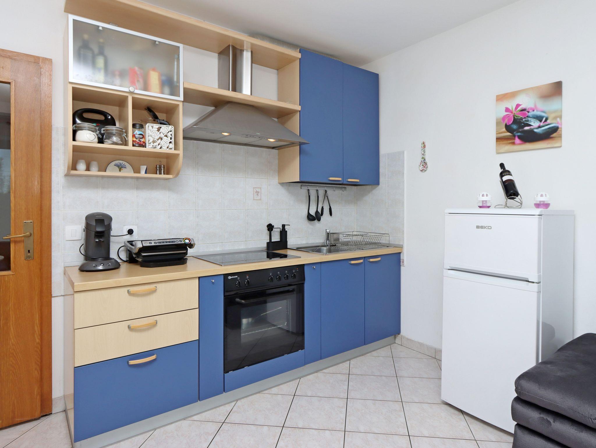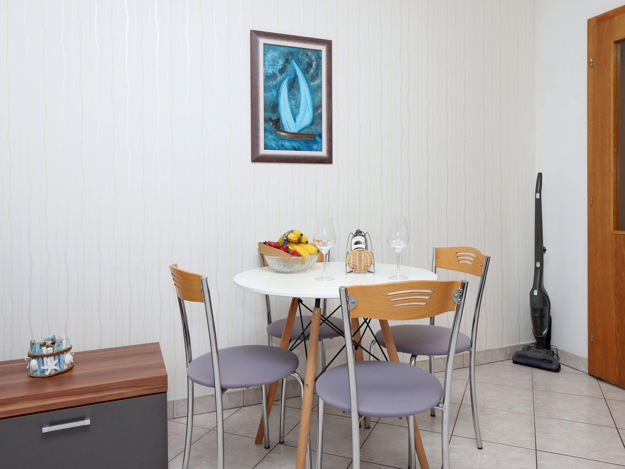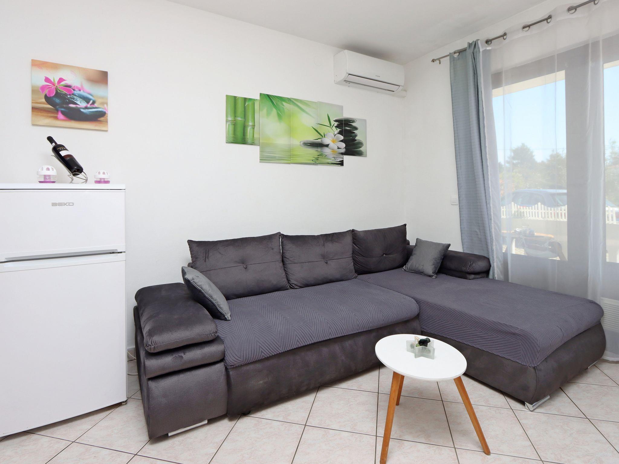 Ferienwohnung bietet Platz für 5 Gäste. Die Betten sind in Schlafzimmern, die es 1 gibt, und in Wohnzimmer, innerhalb einer Gesamtfläche von 39m2, angeordnet. Die Gäste haben eine eigene Terrasse zur Verfügung, auf der sie in warmen Sommernächten genießen können. Das Apartment bietet Meerblick. Es ist erlaubt, Speisen auf dem Gemeinschafts-Grill vorzubereiten. IM PREIS INBEGRIFFEN: Kurtaxe, Endreinigung, Klimatisierung, Parkplatz, Internet, Bügeleisen, Bügelbrett, Föhn, tragbarer Grill, Liegestühle. VERBINDLICHE ZUSÄTZLICHE KOSTEN: Aufzahlung für Kurzaufenthalte (prozentualer Zuschlag pro Nächtigungsanzahl: 30% - 1, 20% - 2, 10% - 3). Die Verfügbarkeit zusätzlicher Dienstleistungen in Ihrem reservierten Termin und die Preise derselben (falls nicht aufgeführt) müssen im Voraus überprüft werden. Zusätzliche Dienstleistungen die in der Zahlungsaufforderung nicht aufgeführt sind werden direkt beim Vermieter bezahlt, angenommen der Gast nutzt auch diese.