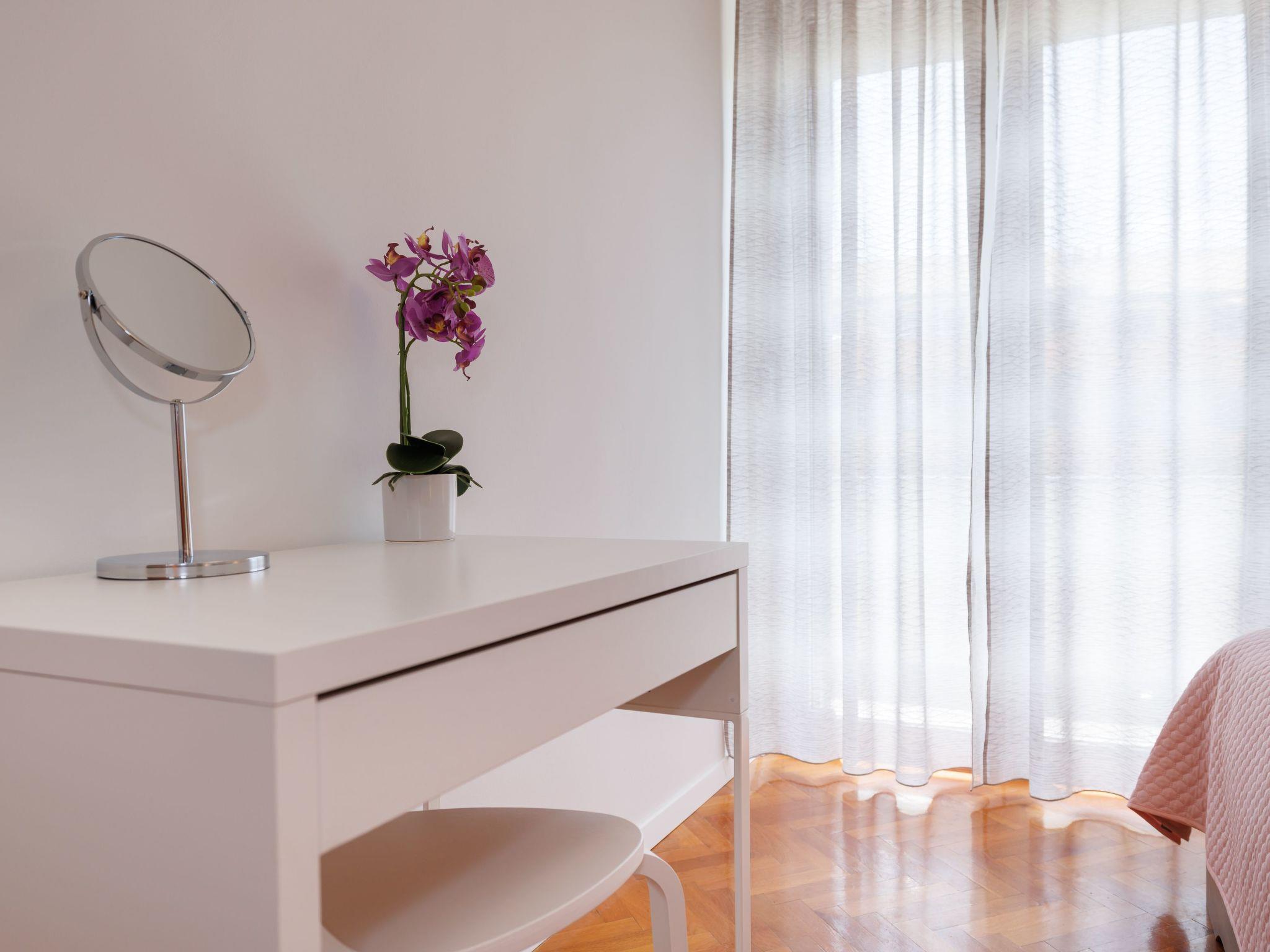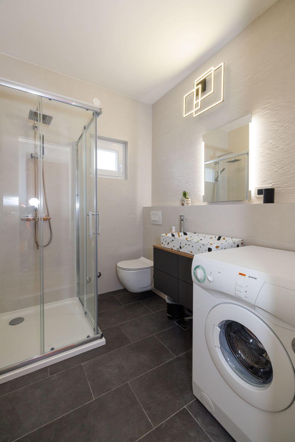 There are 2 bedrooms. Bedroom 1 has large bed (1,60 x 2.00 cm) and own private bathroom inside room, total size 16m2. There is also exit on main balcony. Bedroom 2 has large bed (1,60 x 2.00 cm) and small balcony 5m2. Apartment has 2 bathrooms with shower. One bathroom has also washing machine.