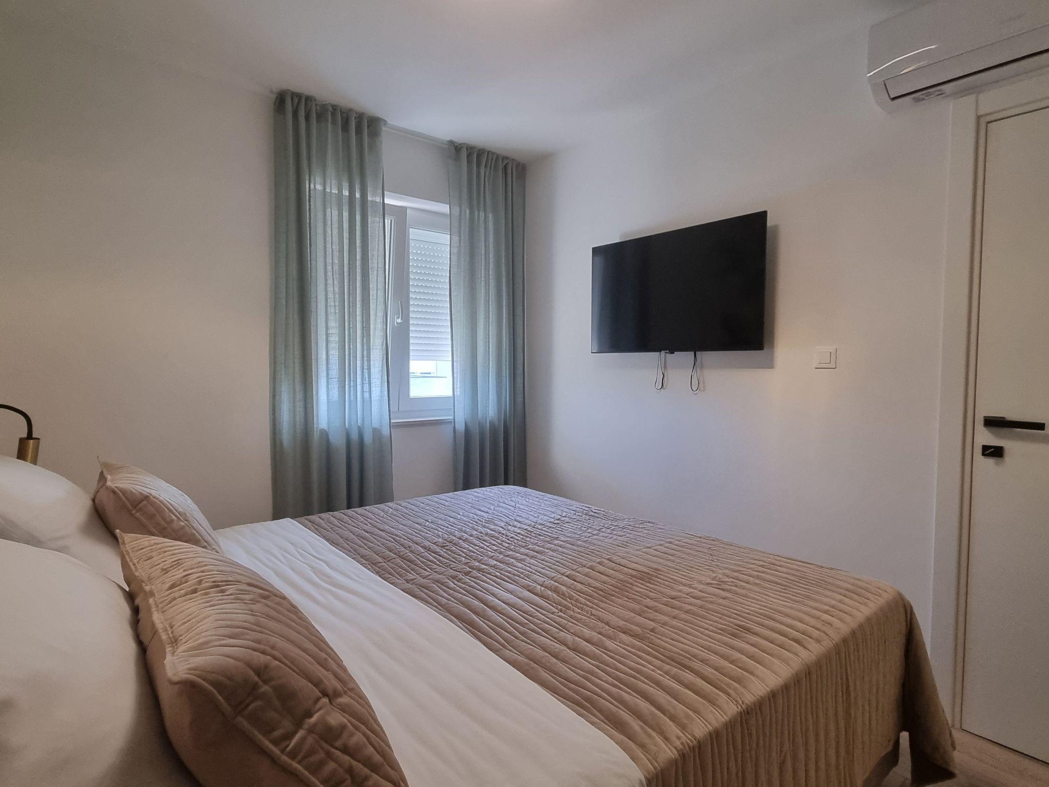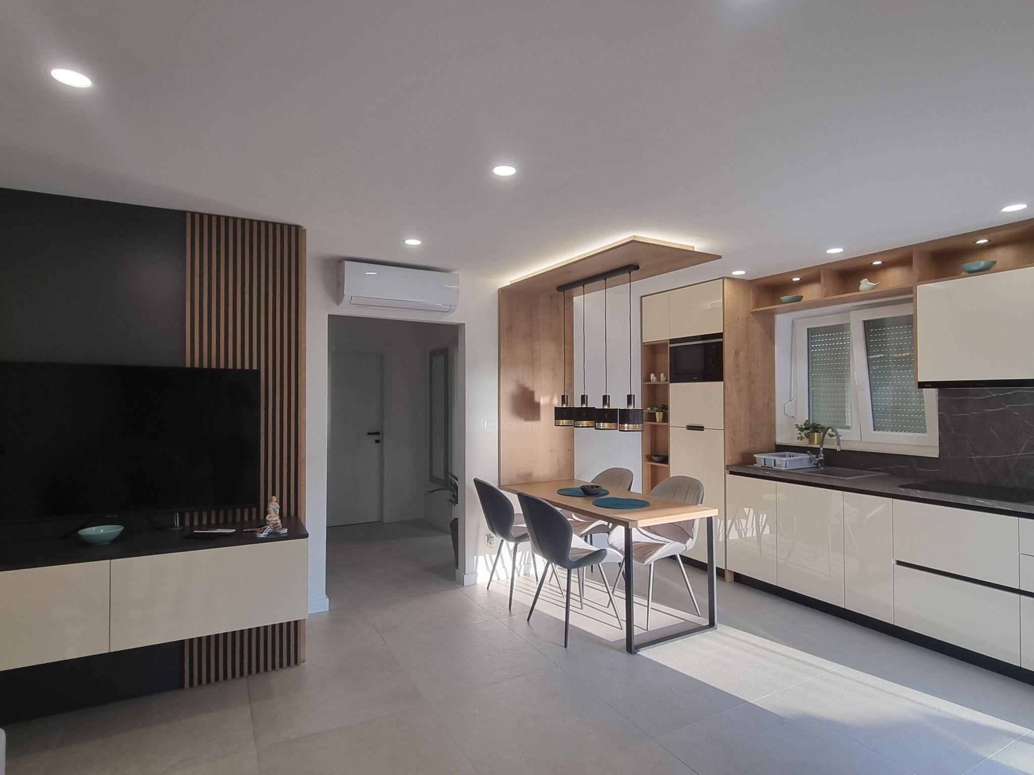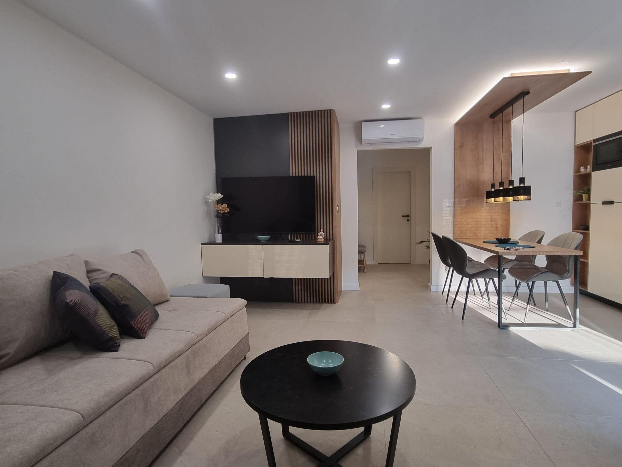 This luxurious and modern flat is located in a quiet apartment complex just 30 metres from the sea, surrounded by nature, many bays, pebble beaches and hiking trails. It offers a communal saltwater pool (36 m2), which is open from May to October and whose temperatures usually reach 20-26 °C. The flat is located on the 2nd floor and has a bedroom with a double bed, a modern kitchen with induction hob, fridge-freezer, kettle, coffee machine, toaster, microwave and dishwasher. The bathroom has a shower and toilet. The dining area and living room offer a cosy space with a sofa and smart TV, while free WiFi is available throughout the building.