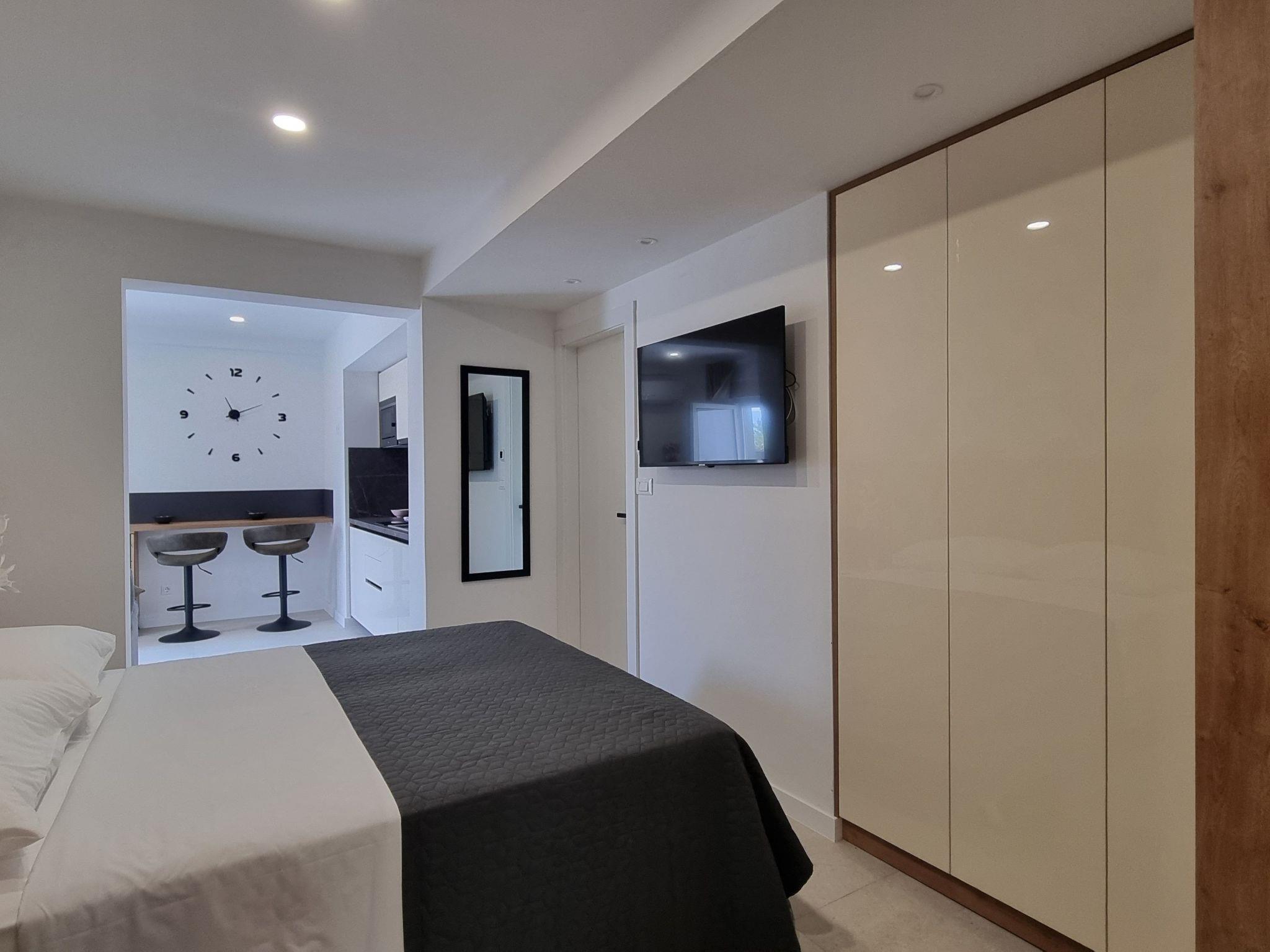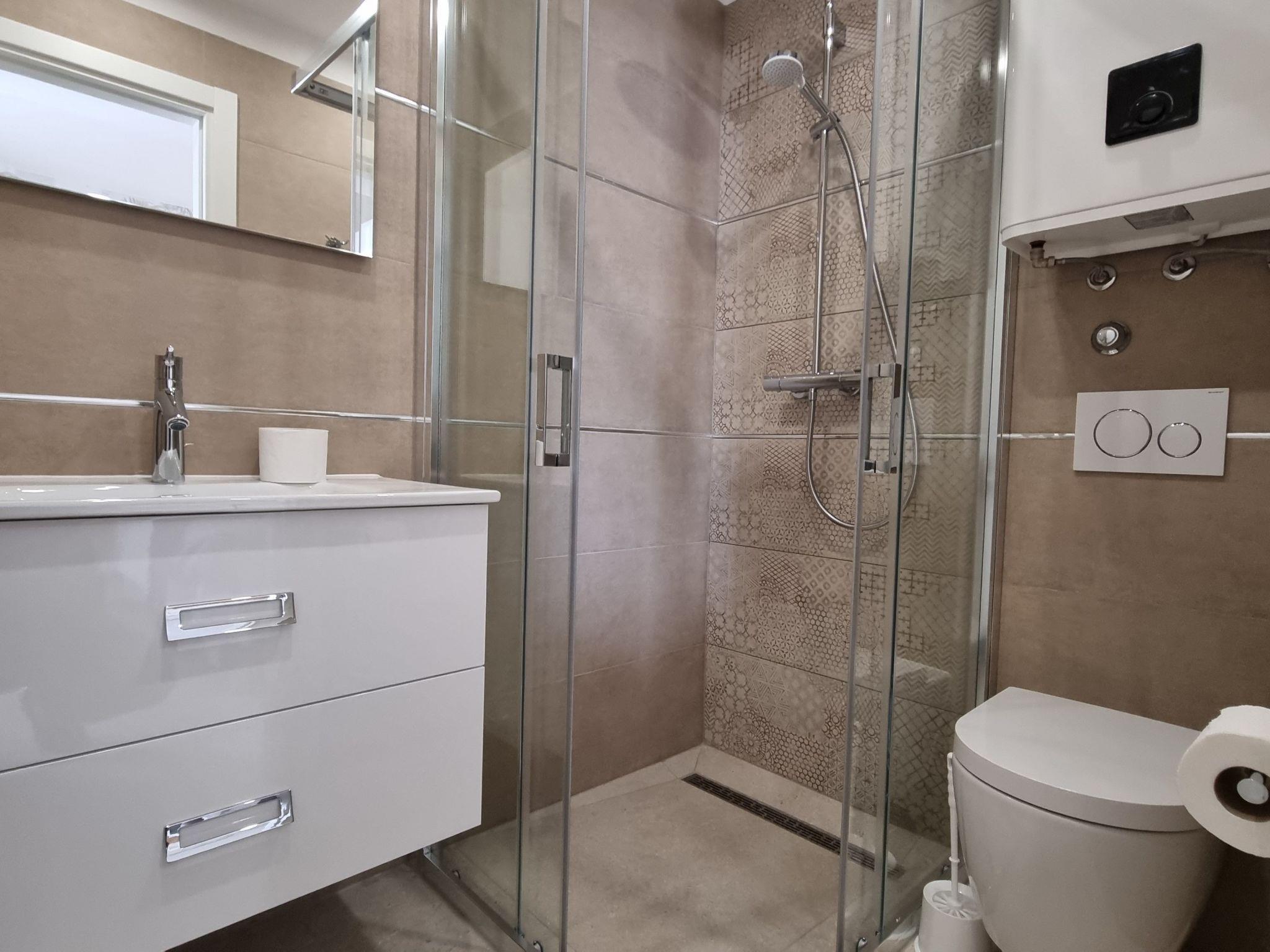 This luxurious, modern studio flat right by the sea is located in a quiet apartment complex just 30 metres from the sea, surrounded by nature, secluded bays, pebble beaches and hiking trails. It offers a shared saltwater pool (36 m2), which is open from May to October and where the temperature is usually between 20 and 26 °C. The studio flat is located on the ground floor and has a queen-size bed, a Smart TV, a well-equipped kitchen/dining and sitting area with induction hob, fridge and freezer, kettle, coffee machine, toaster, microwave and dishwasher. The bathroom has a shower and toilet. Free WiFi is available throughout the building.