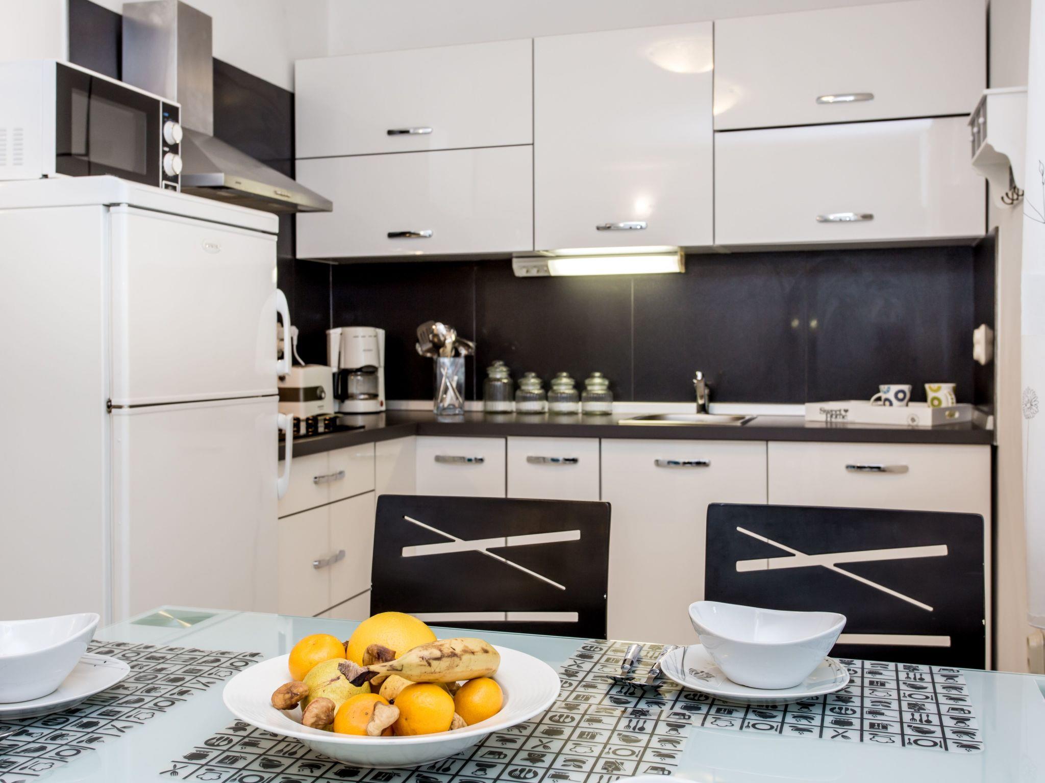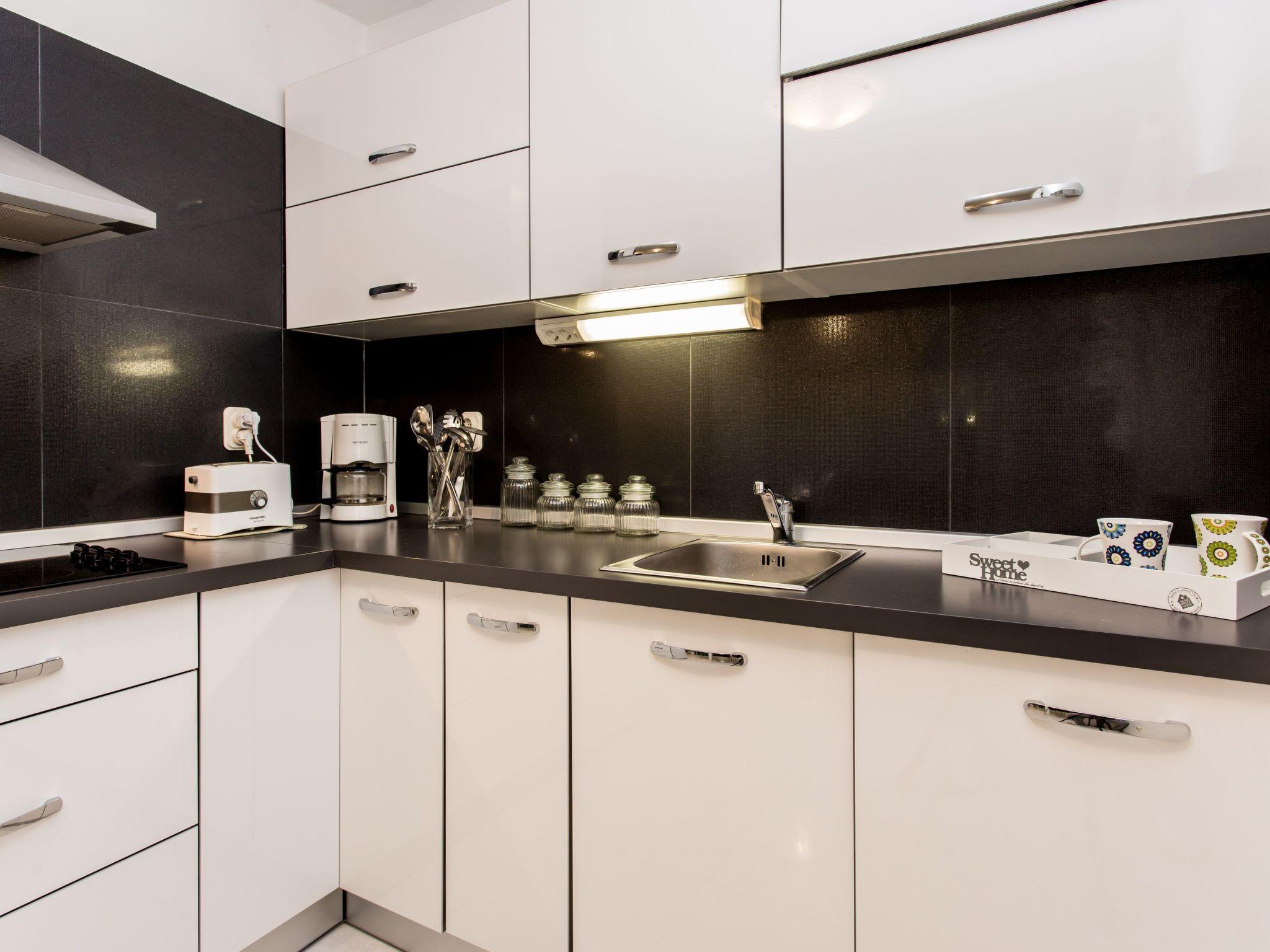 The kitchen is fully and modernly equipped, including a 4-burner ceramic hob, a fridge with freezer compartment, a coffee machine, a kettle, a microwave, a toaster, a hand blender and a dishwasher. The kitchen also has a dining area connected to the living area, where you will find a TV with satellite and cable channels and air conditioning for your comfort.