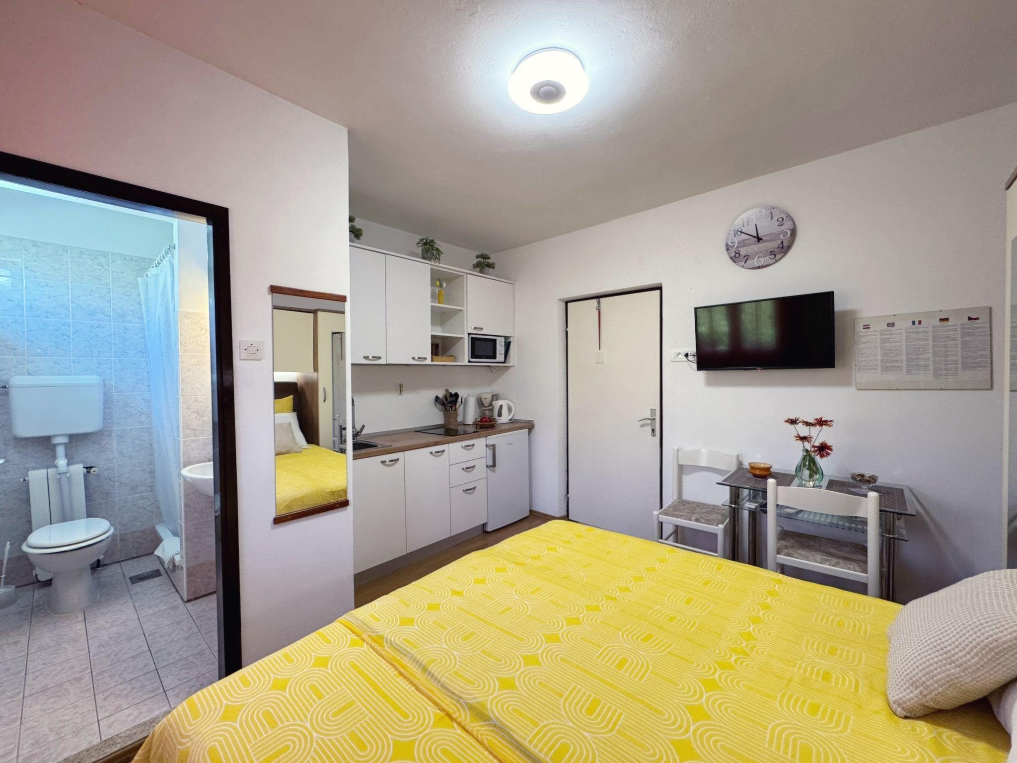 Enjoy your holiday in this charming studio flat for two on the island of Krk in the town of Šilo, known for its beautiful sandy and pebble beaches, natural bays and picturesque hiking trails. The studio offers everything you need in one room, with a bed, kitchen and dining area as well as a separate bathroom with toilet and shower. The kitchen is well equipped with an electric cooker, mini fridge, coffee maker, kettle, microwave and toaster.
