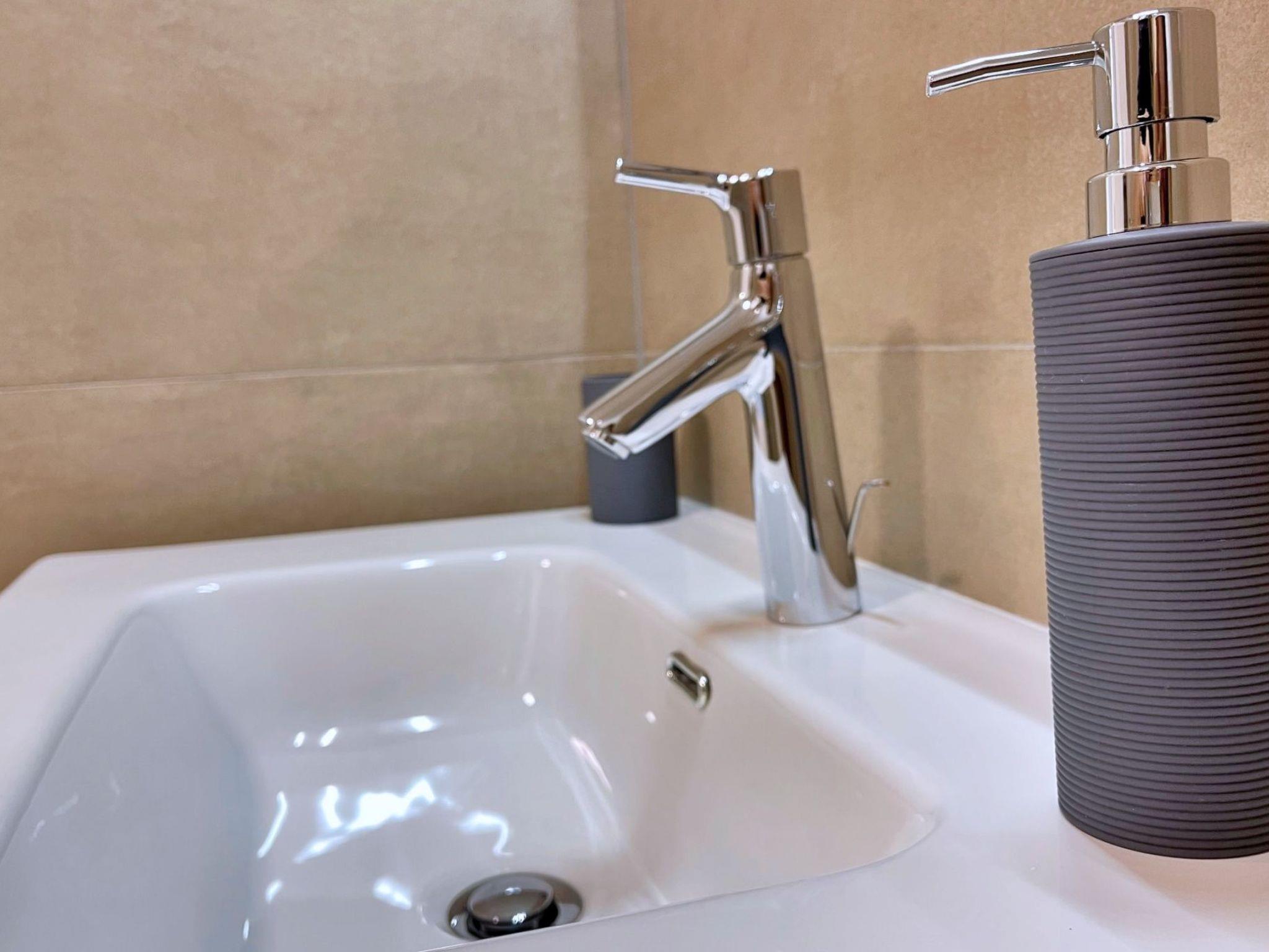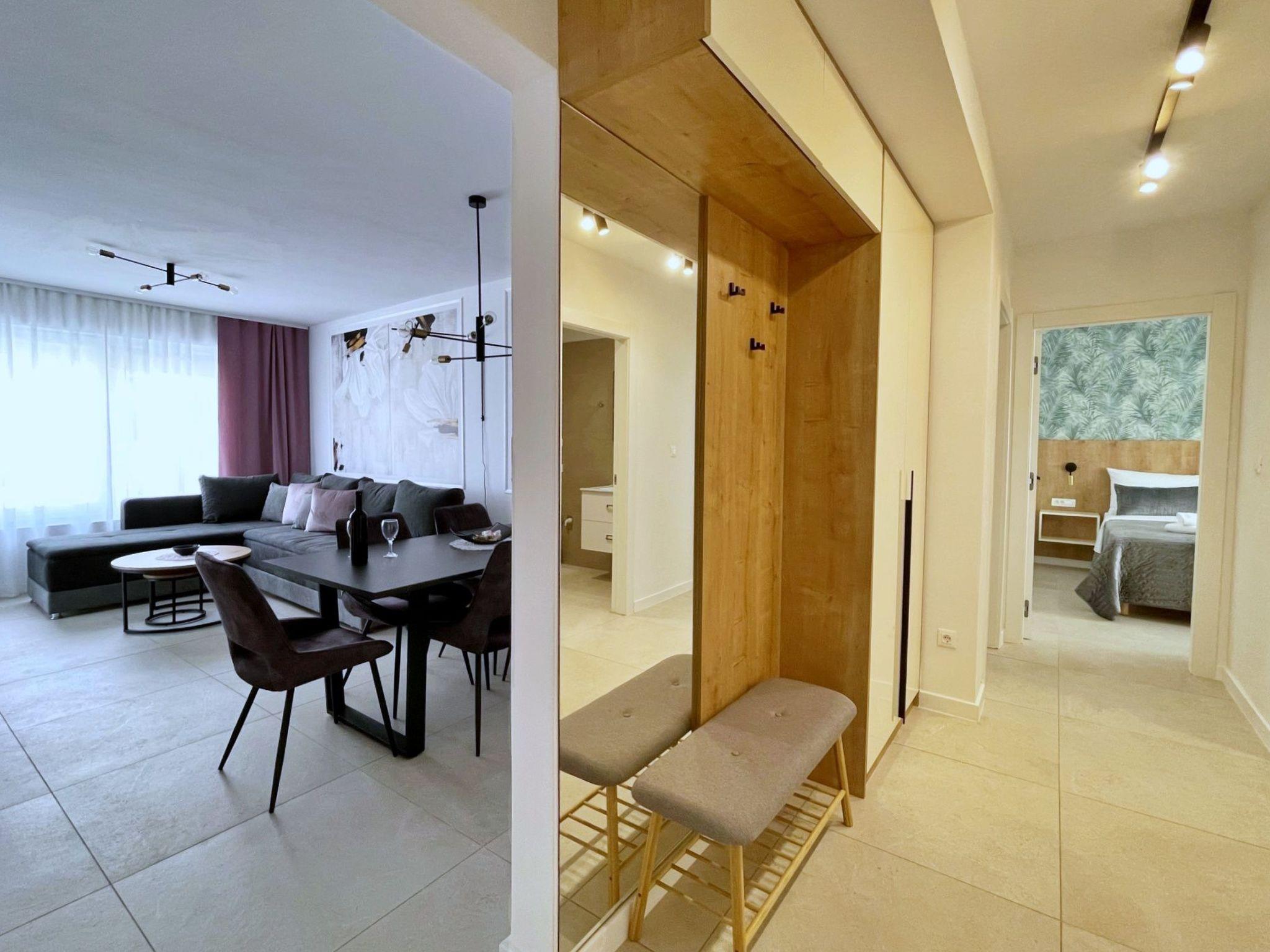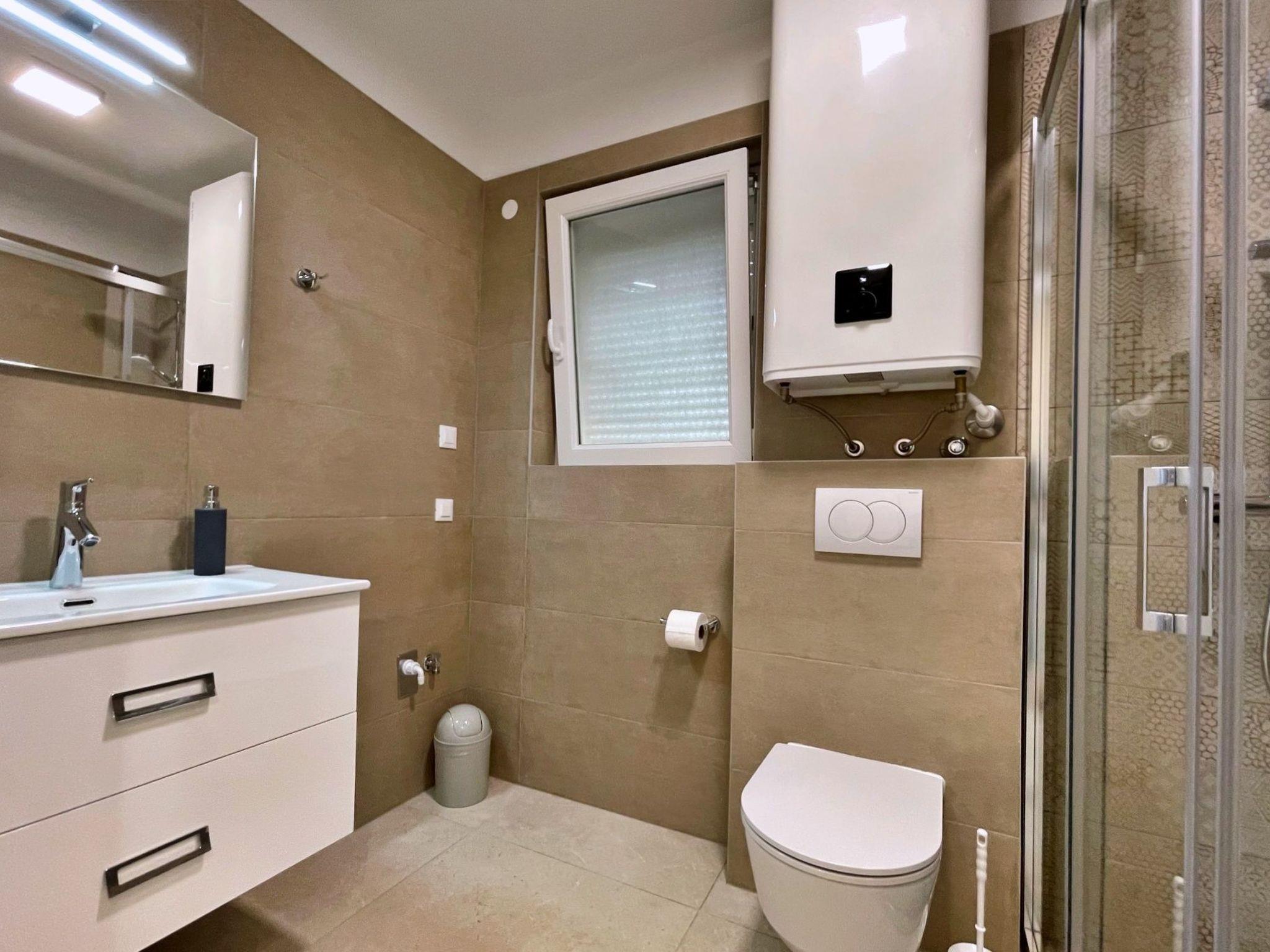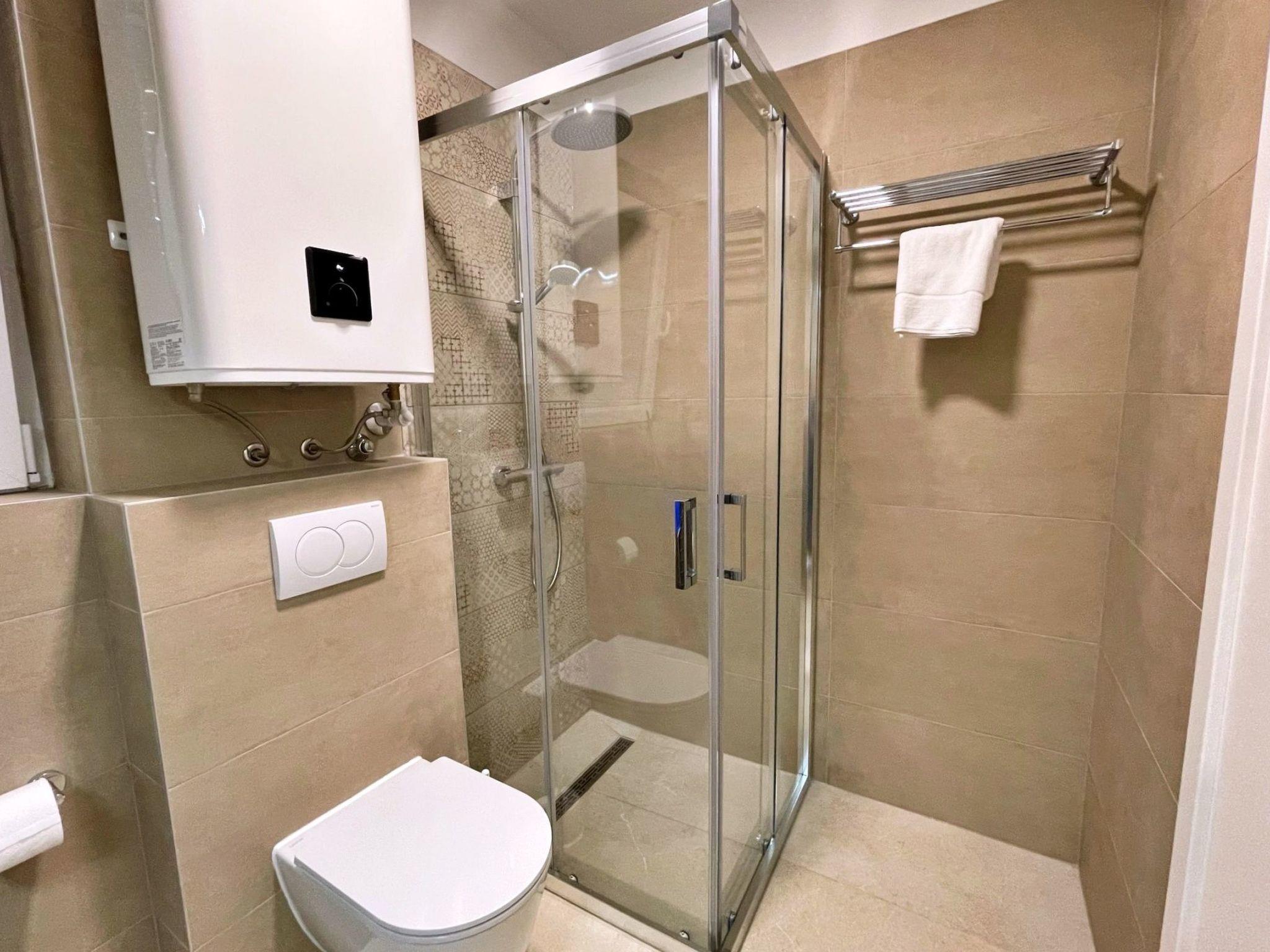 This luxurious, modern seafront flat is located in a quiet apartment complex just 30 metres from the sea, surrounded by nature, secluded coves, pebble beaches and hiking trails. It offers a communal saltwater pool (36 m2), which is open from May to October and whose temperatures usually reach 20-26 °C. The flat is located on the 1st floor and has two bedrooms, each with a double bed, a modern kitchen with induction hob, fridge-freezer, kettle, coffee machine, toaster, microwave and dishwasher. The bathroom has a shower and toilet. The dining area and living room offer a cosy space with a sofa and smart TV, while free WiFi is available throughout the building.