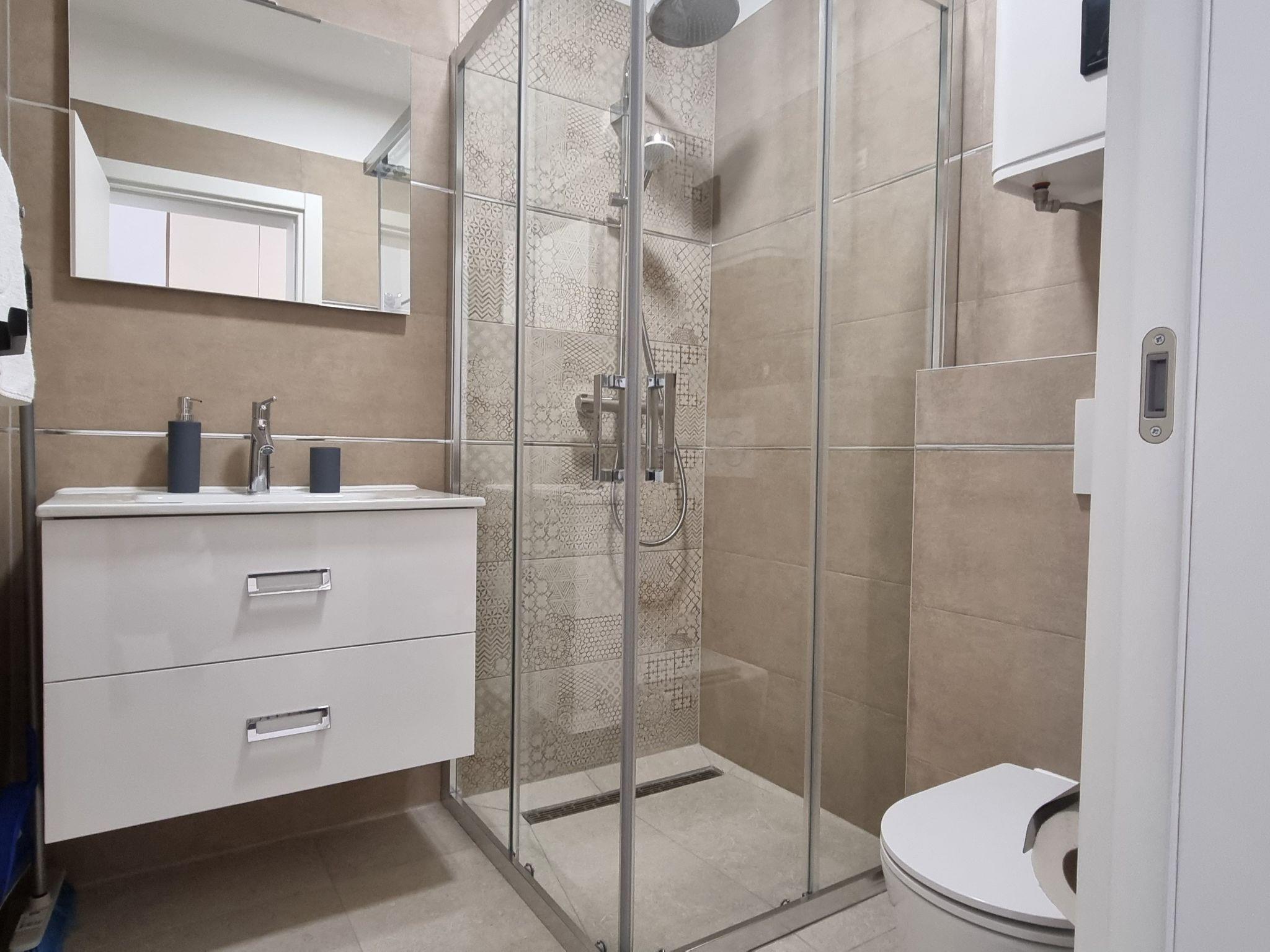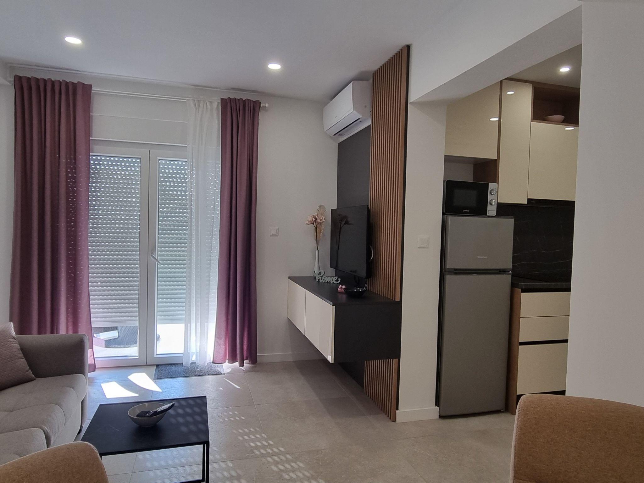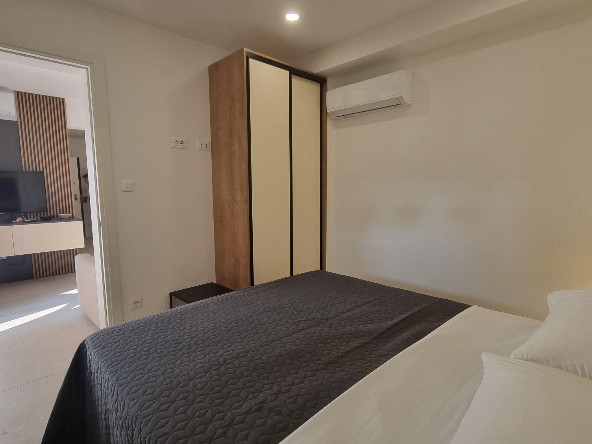 This luxurious and modern flat is located in a quiet apartment complex just 30 metres from the sea, surrounded by nature, many bays, pebble beaches and hiking trails. It offers a communal saltwater pool (36 m2), which is open from May to October and whose temperature usually reaches 20-26 °C. The flat is located on the ground floor and has a bedroom with a double bed, a modern kitchen with induction hob, fridge-freezer, kettle, coffee machine, toaster, microwave and dishwasher. The bathroom has a shower and toilet. The dining area and living room offer a cosy space with a sofa and smart TV, while free WiFi is available throughout.