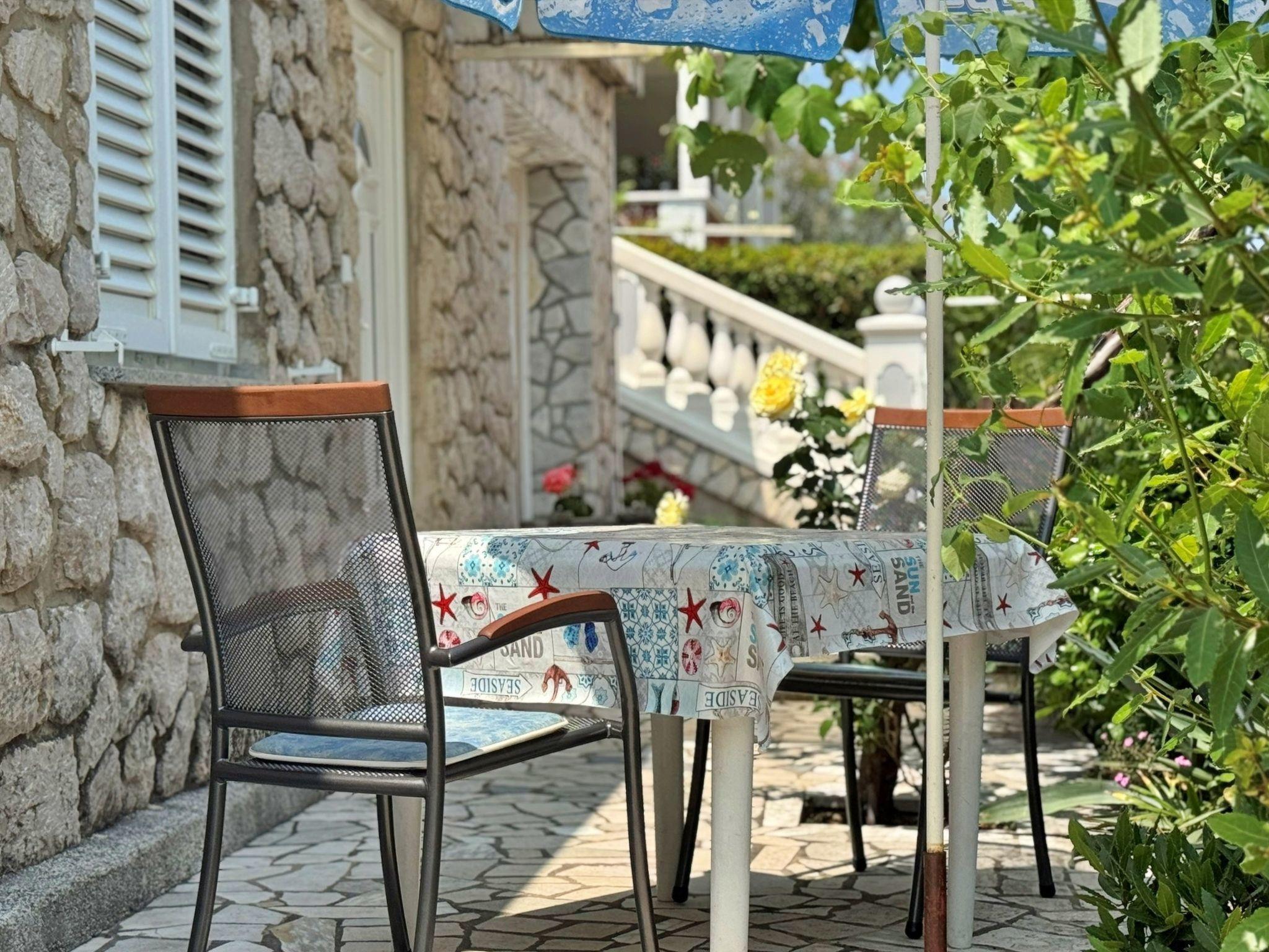 This ground floor flat, just 530 m from the sea and the city centre, offers a comfortable stay with two bedrooms, each with a double bed. The living room has a dining table, satellite TV and air conditioning. The fully equipped kitchen has a 4-burner induction hob, an oven, a fridge with freezer compartment, a coffee machine, a kettle, a toaster and a dishwasher. Outside, you can relax on the 20 m2 covered terrace with garden view, which you share with the neighbouring flat. Other amenities include a shared barbecue, free parking and bed linen and towels.