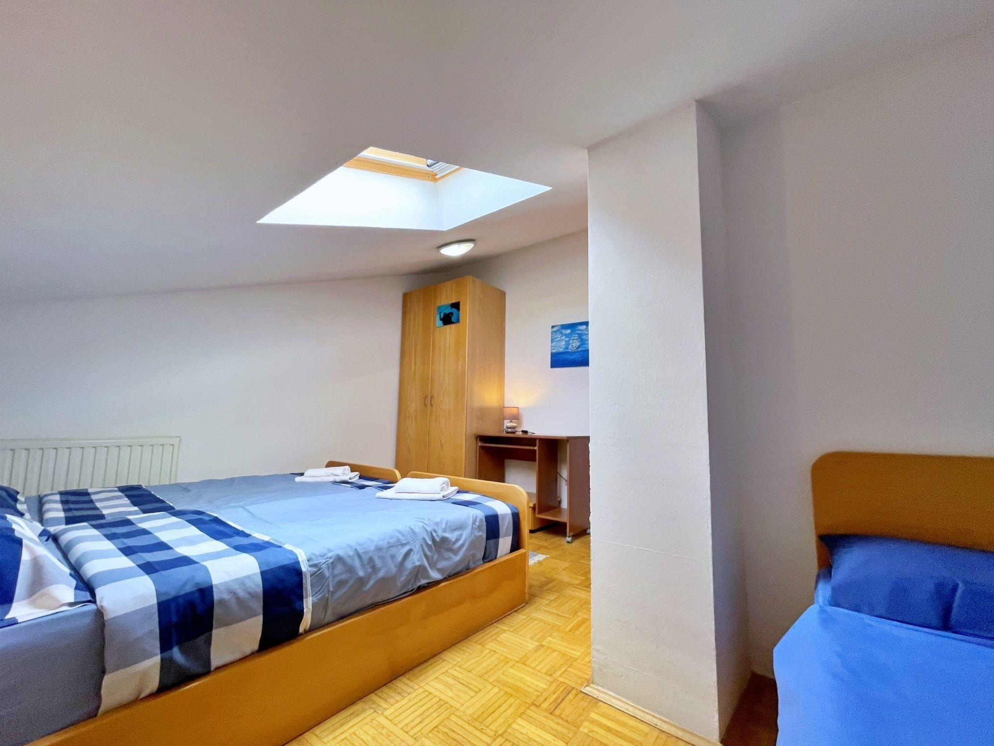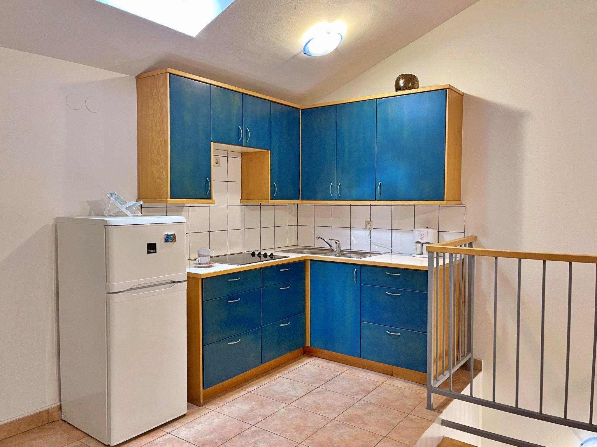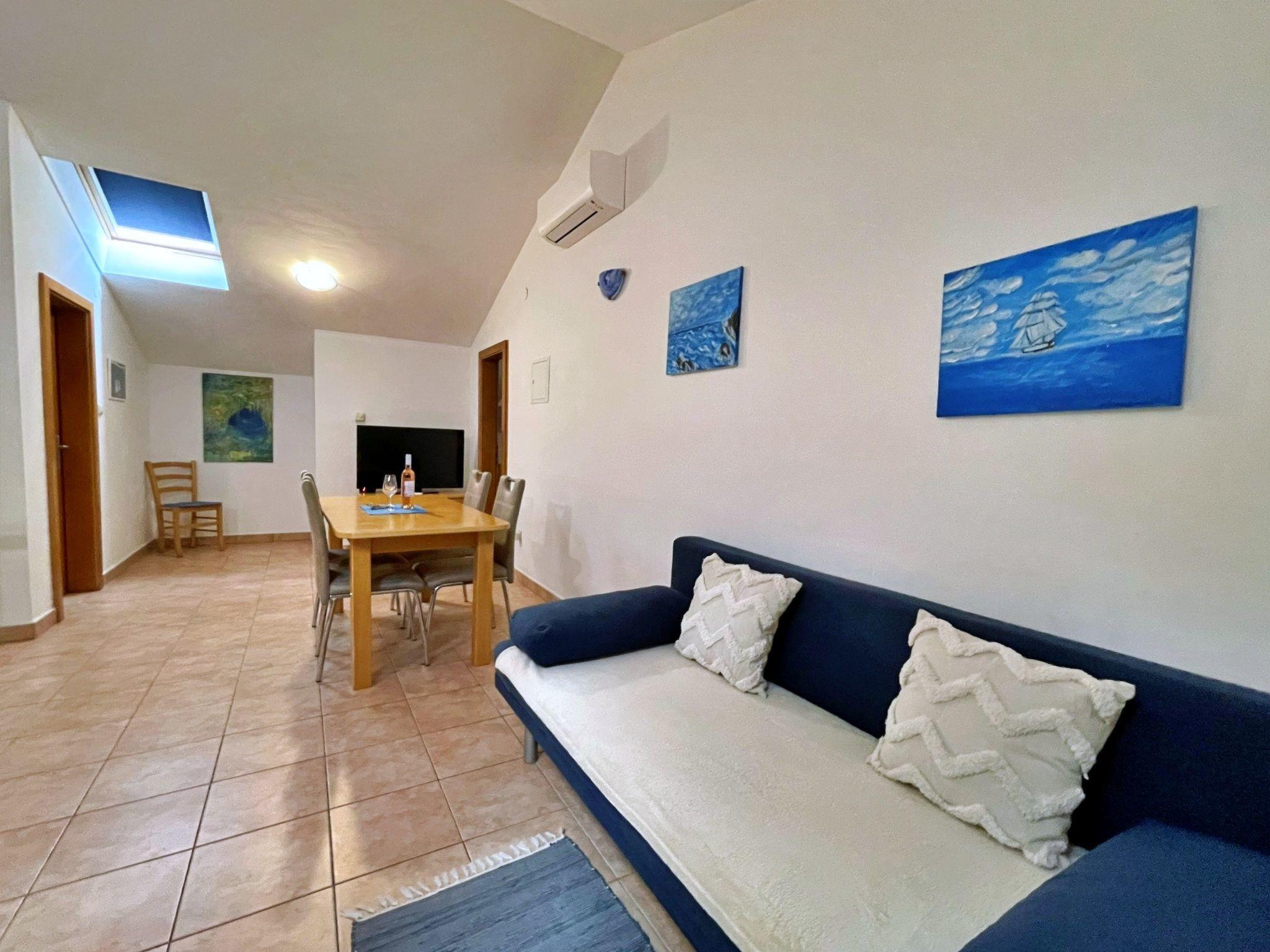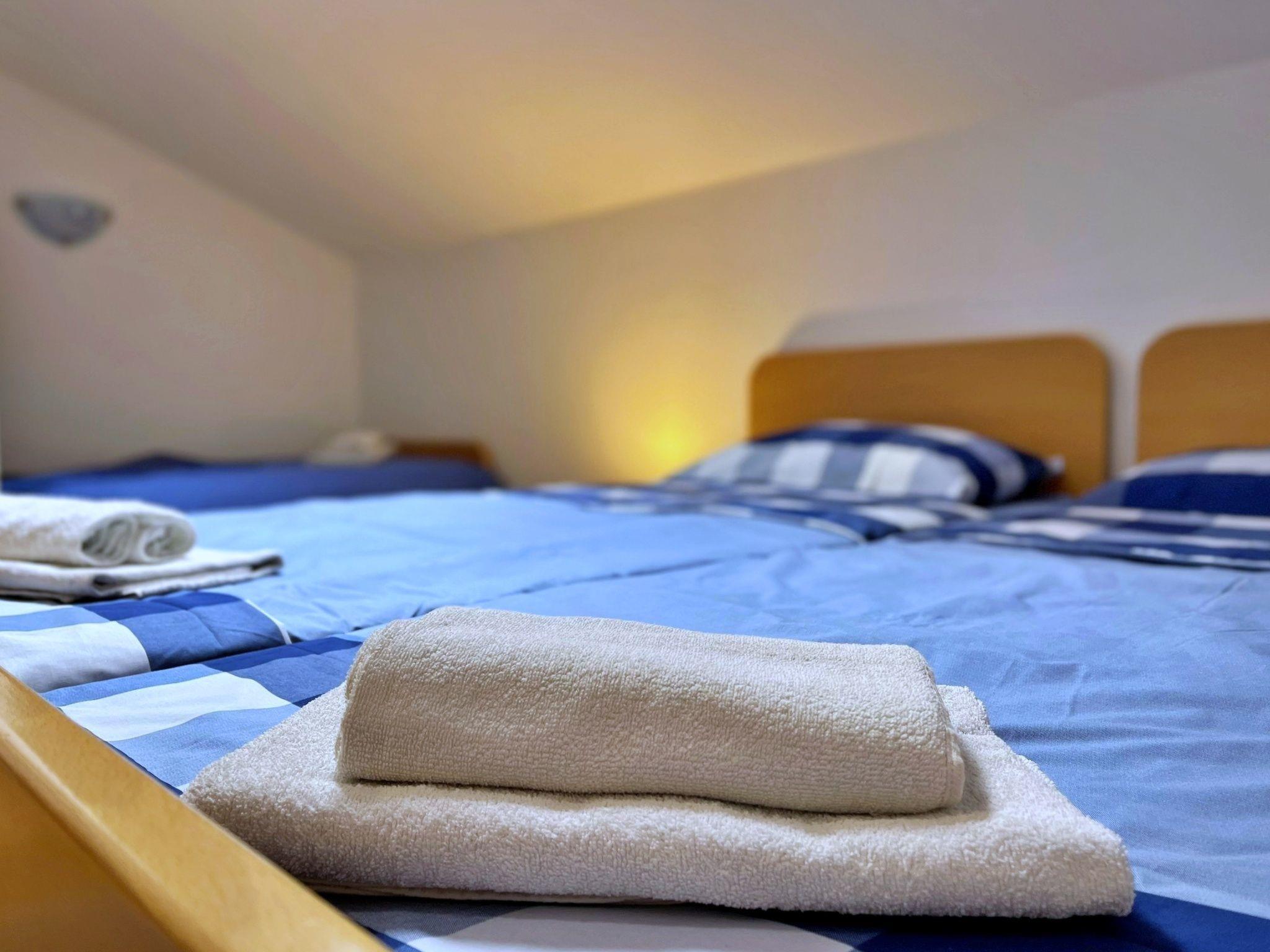 This flat, just 20 metres from the sea and beach, is located on the top floor and has a bedroom with three single beds. The open-plan living, dining and kitchen area includes a dining table, a pull-out sofa bed for one person, air conditioning and satellite/cable TV. The kitchen is equipped with a 4-burner electric hob, a fridge with freezer compartment, a coffee machine, a kettle and a toaster. The bathroom has a shower and a toilet. Bed linen, towels, free Wi-Fi and a car park are provided. A popular local bistro and a diving centre are located directly on the ground floor and offer traditional Mediterranean cuisine and underwater adventures. At the diving centre you can arrange a dive from the boat or from the shore.