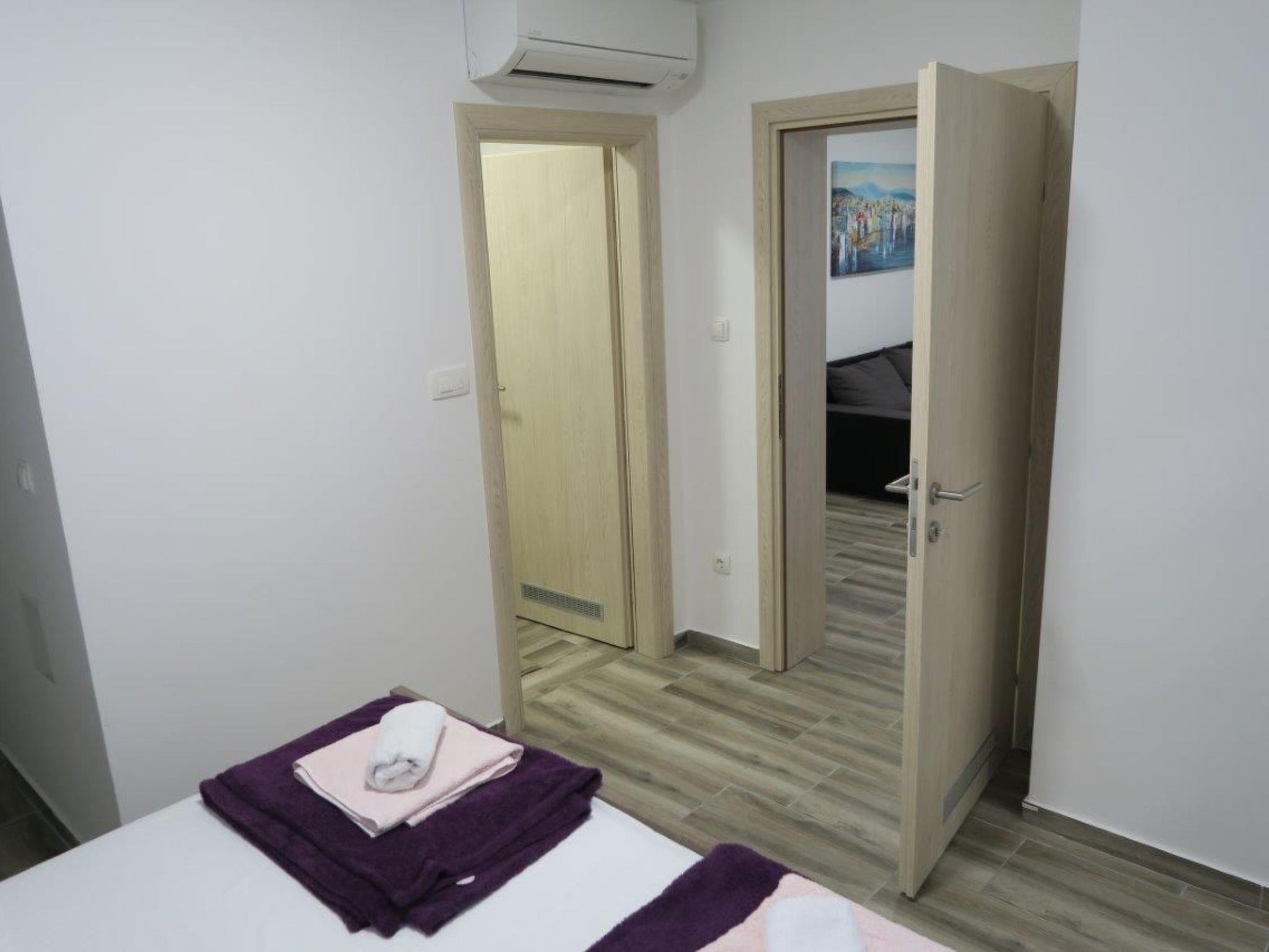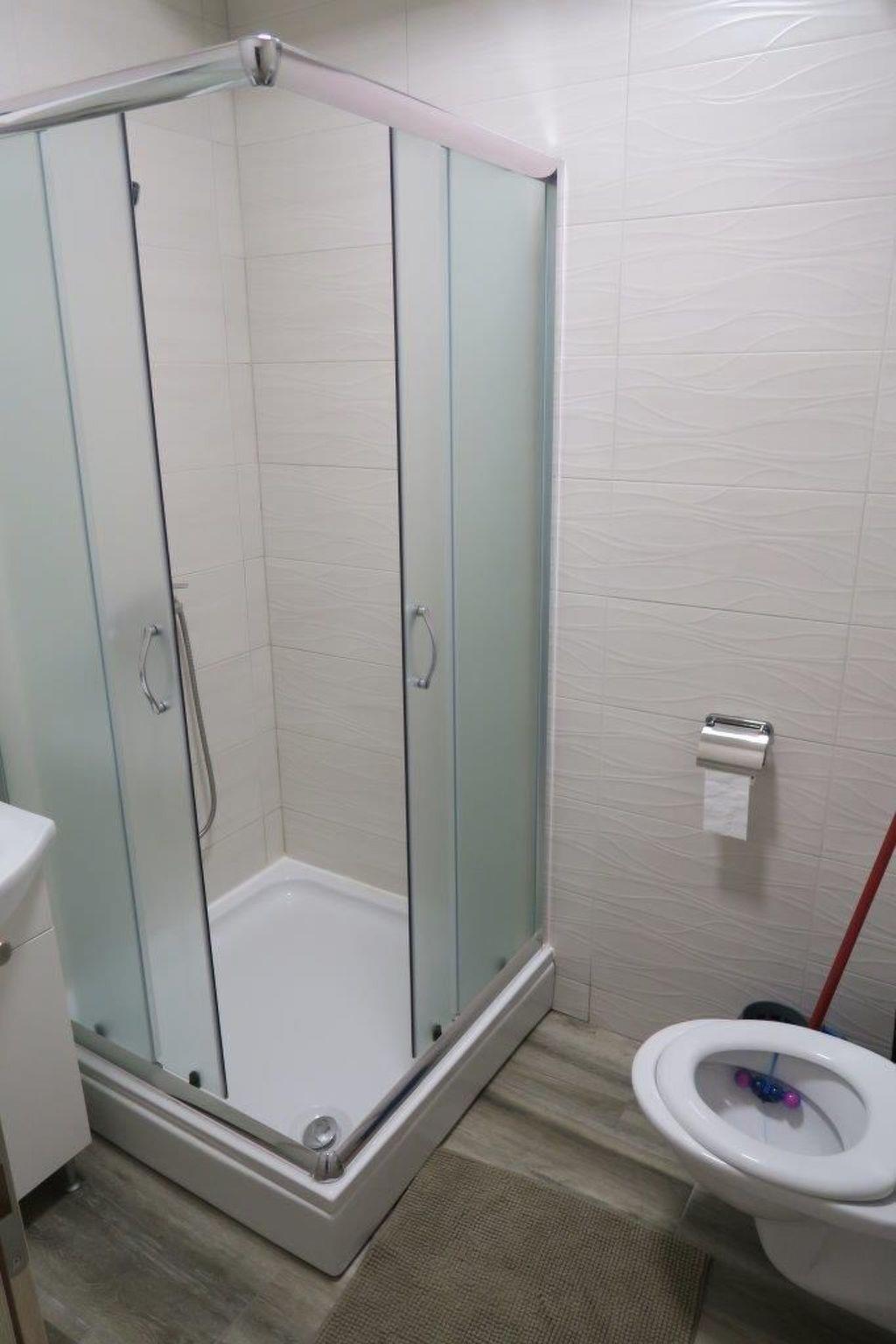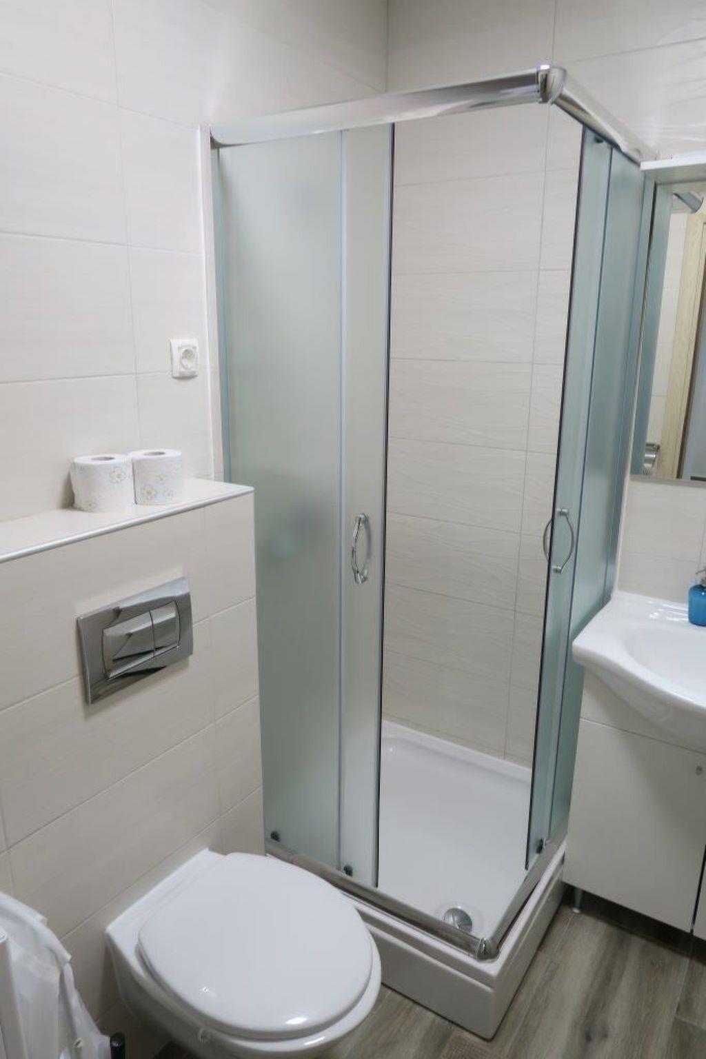 2 bathrooms with a shower, WC, hairdryer and washbasin with a cupboard underneath and washingmachine. The apartment has a 1 big bedroom with a double bed (180 x 200cm) and one bedroom with 2 beds measuring 90 x 200cm. In all roomsm are cupboards. All the rooms in the apartment have air conditioning. Internet access is available in whole apartment.