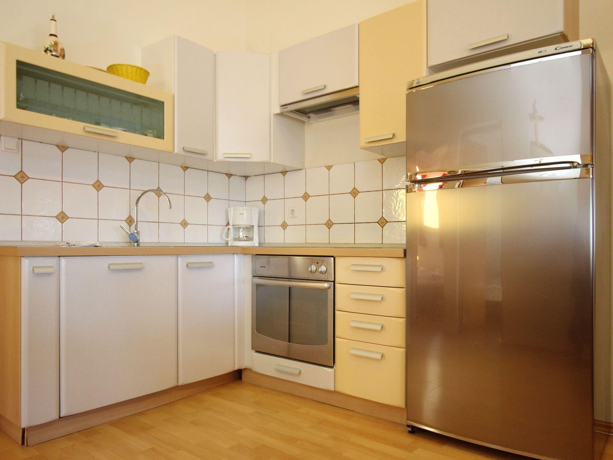 No. of persons: 5 Places: 45 m2 (1st floor) Balcony : a private balcony, covered, tables and chairs for the balcony are available, partial sea view. Info: Satellite TV, bed linen is provided once a week, towels available (1 large, 1 small / per person and week), use of air conditioning is included in the price of the accommodation, pets are not allowed, dishwasher. Equipment holiday flat: bedroom no.1 : double room , laminate , french bed bedroom no.2 : double room , laminate , french bed Living area living room, dining room and kitchen are one unit ; one additional sleeping possibility on a sofa bed ; with balcony