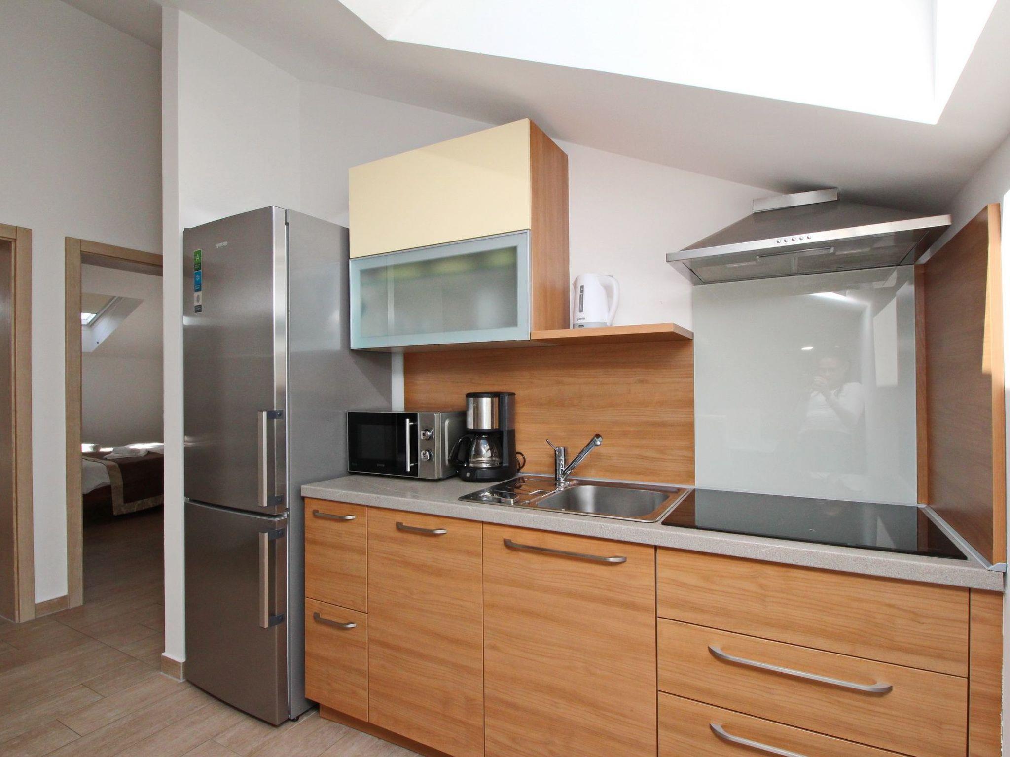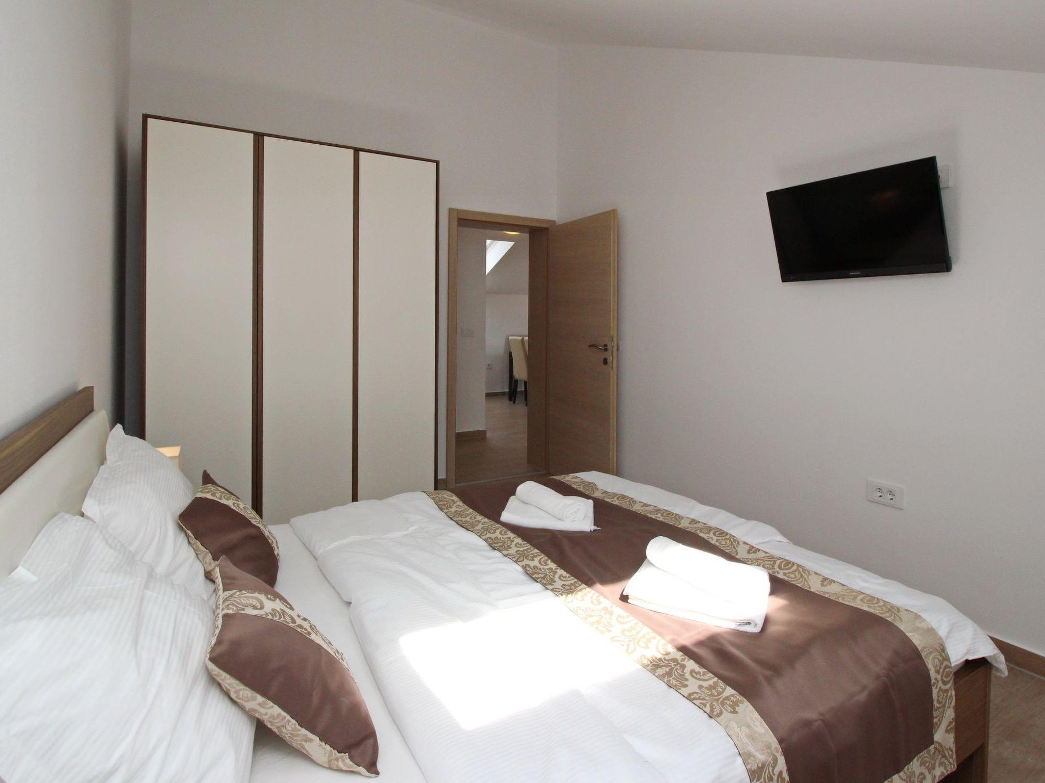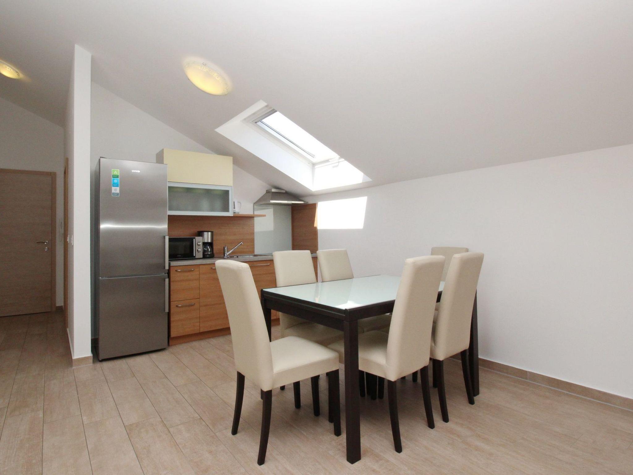 No. of persons: 4-6 Places: 65 m2 (2nd floor) Terrace: private balcony, partly covered, tables and chairs for balcony are available. Info: satellite TV, bed linen is provided once a week, towels available (1 large, 1 small / per person and week), use of air conditioning is included in the price of the accommodation, free Wi-Fi, pets are allowed. Flat facilities: Bedroom no.1 : double room , double bed , exit to balcony, tiled, LCDtv Bedroom no.2 : double room , double bed , tiled, LCDtv Living area : living room, dining room and kitchen are one unit ; one additional sleeping possibility on a sofa bed ; exit to the balcony; tiled Kitchen : kitchenette, dishes, cooking pots, cutlery etc. are available, dish towels available, electric cooker, number of hotplates: 4, refrigerator with freezer compartment, coffee machine, dishwasher Bathroom : bathroom with toilet, with shower Each flat has its own parking space.