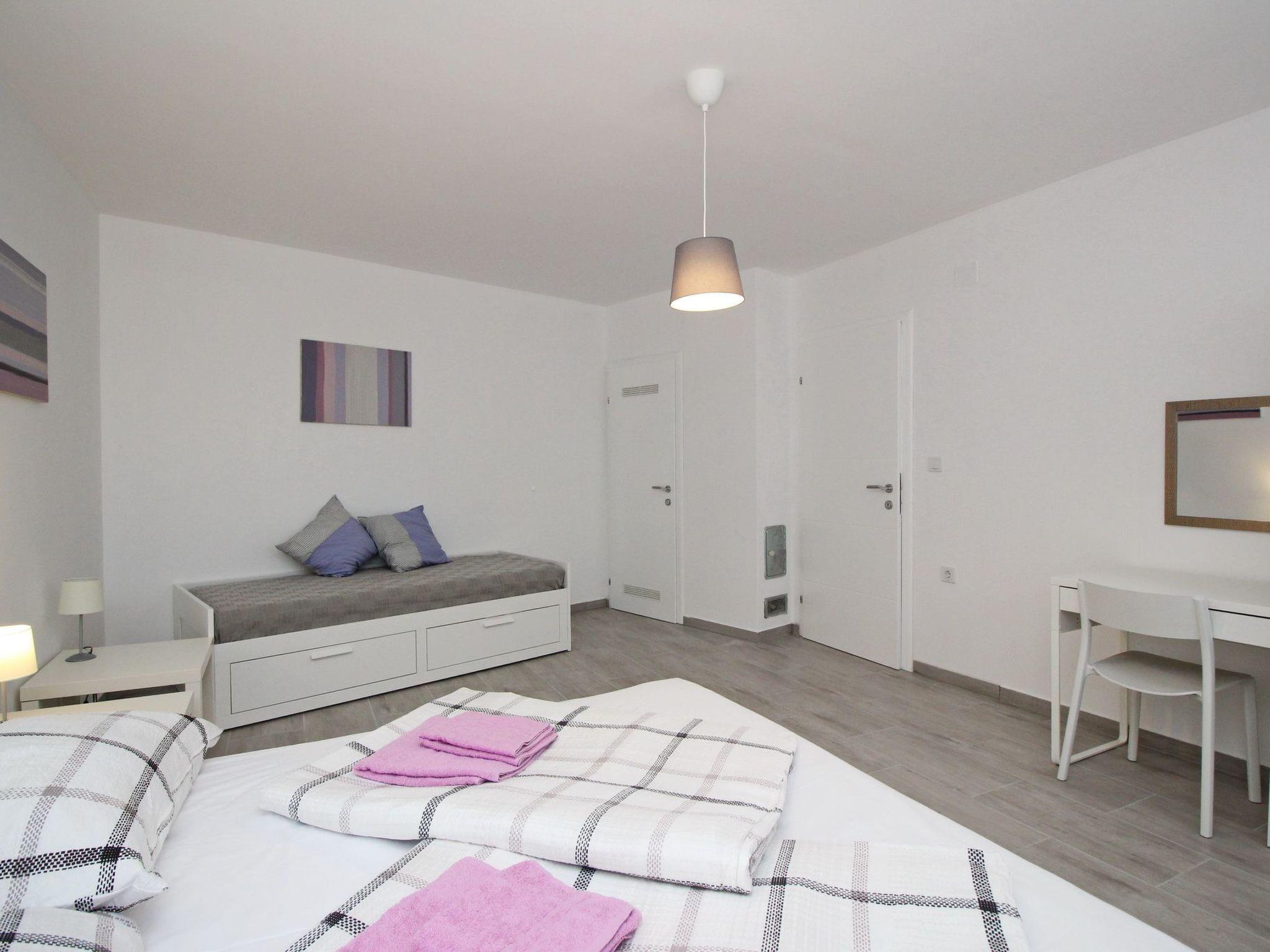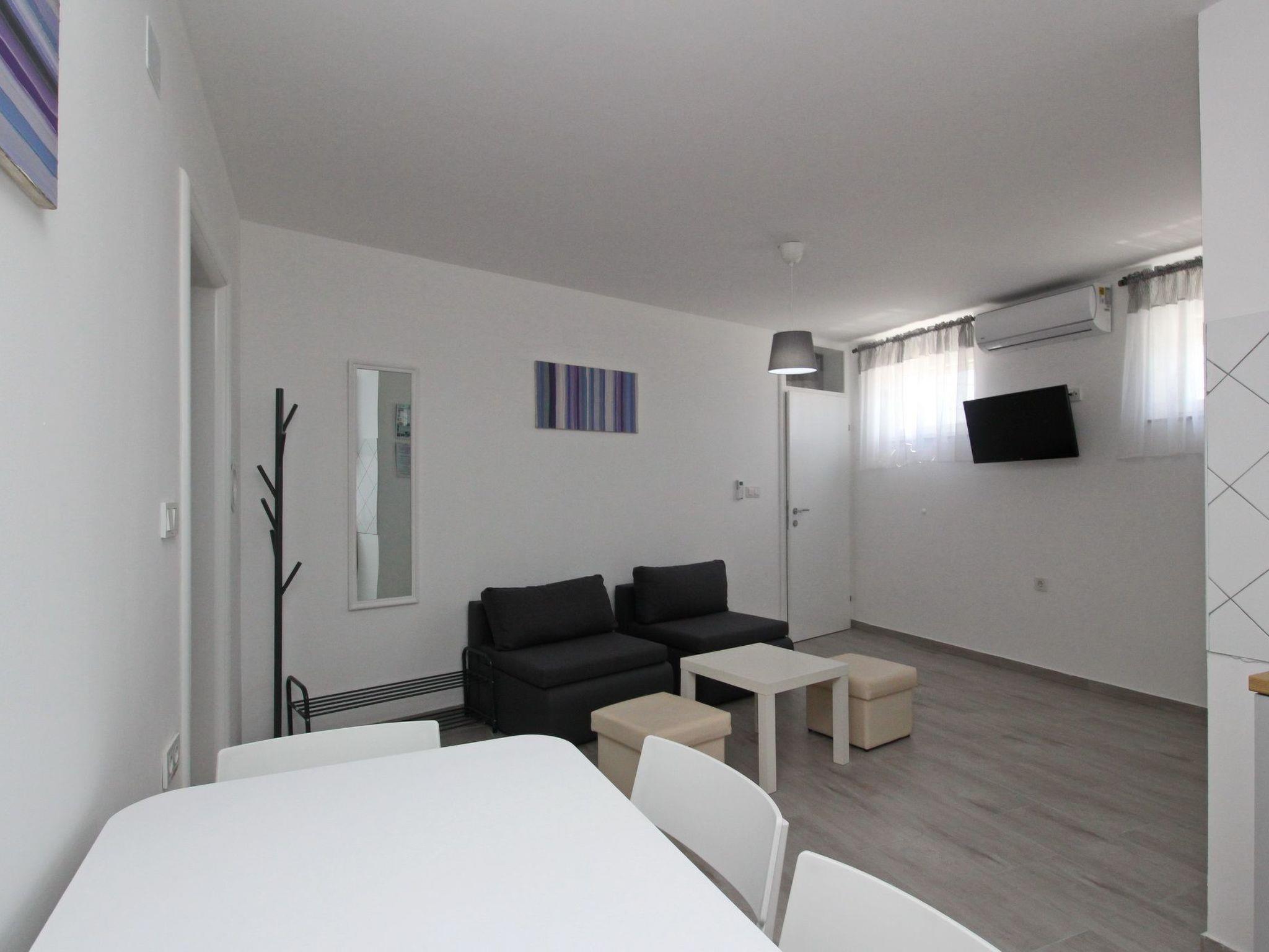 The flat has a cosy bedroom with a comfortable double bed and a single bed, creating an optimal sleeping environment for three people. There is a sofa bed in the living area for an additional person. The flat is also equipped with air conditioning, which ensures pleasant temperatures on warm days, as well as Wi-Fi to stay connected while on holiday.