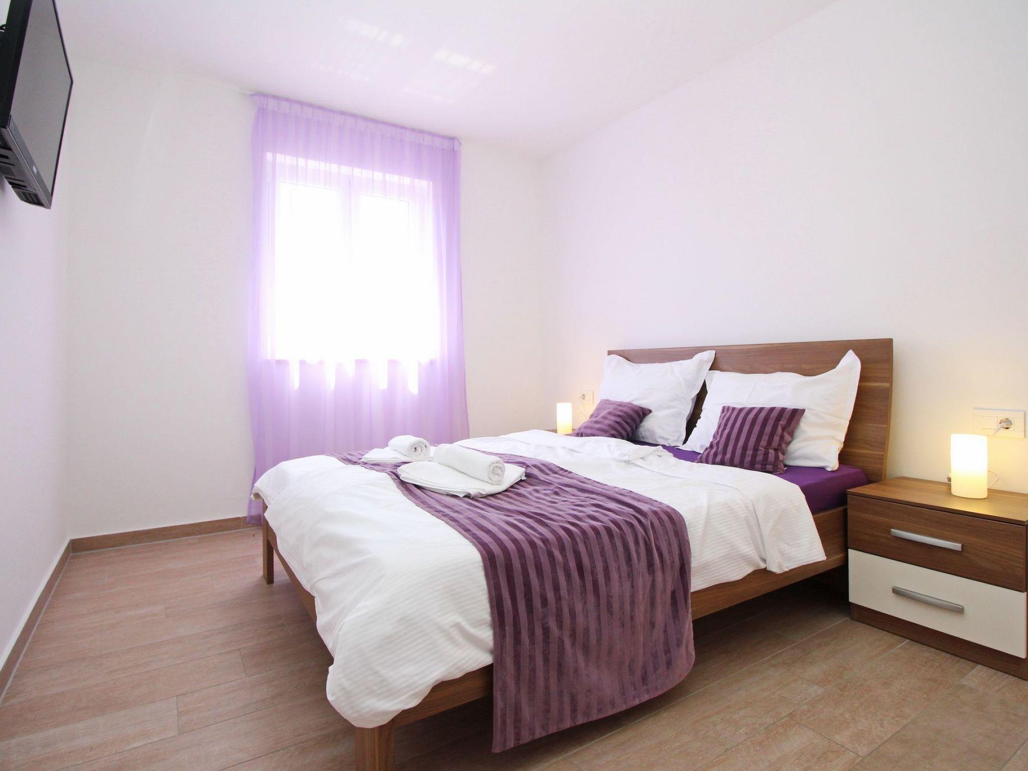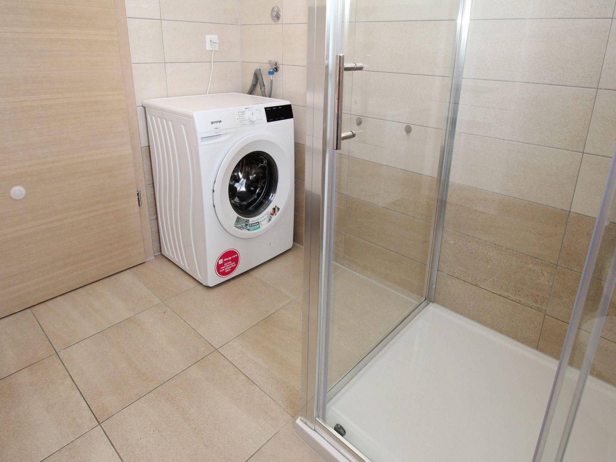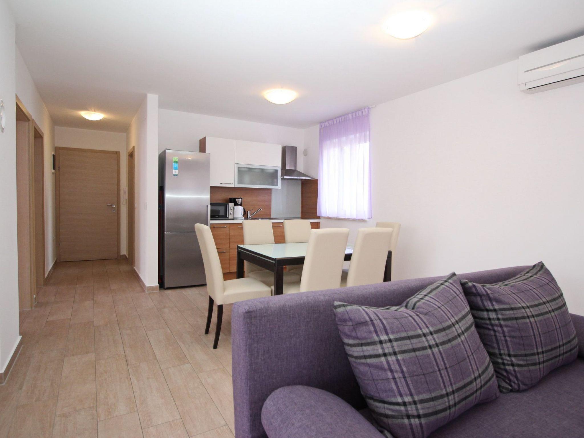 No. of persons: 4-6 Places: 65 m2 (1st floor) Terrace: private balcony, partly covered, tables and chairs for balcony are available. Info: satellite TV, bed linen is provided once a week, towels available (1 large, 1 small / per person and week), use of air conditioning is included in the price of the accommodation, free Wi-Fi, pets are allowed. Flat facilities: Bedroom no.1 : double room , double bed , exit to balcony, tiled, LCDtv Bedroom no.2 : double room , double bed , tiled, LCDtv Living area : living room, dining room and kitchen are one unit ; one additional sleeping possibility on a sofa bed ; exit to the balcony; tiled Kitchen : kitchenette, dishes, cooking pots, cutlery etc. are available, dish towels available, electric cooker, number of hotplates: 4, refrigerator with freezer compartment, coffee machine, dishwasher Bathroom : bathroom with toilet, with shower Each flat has its own parking space.