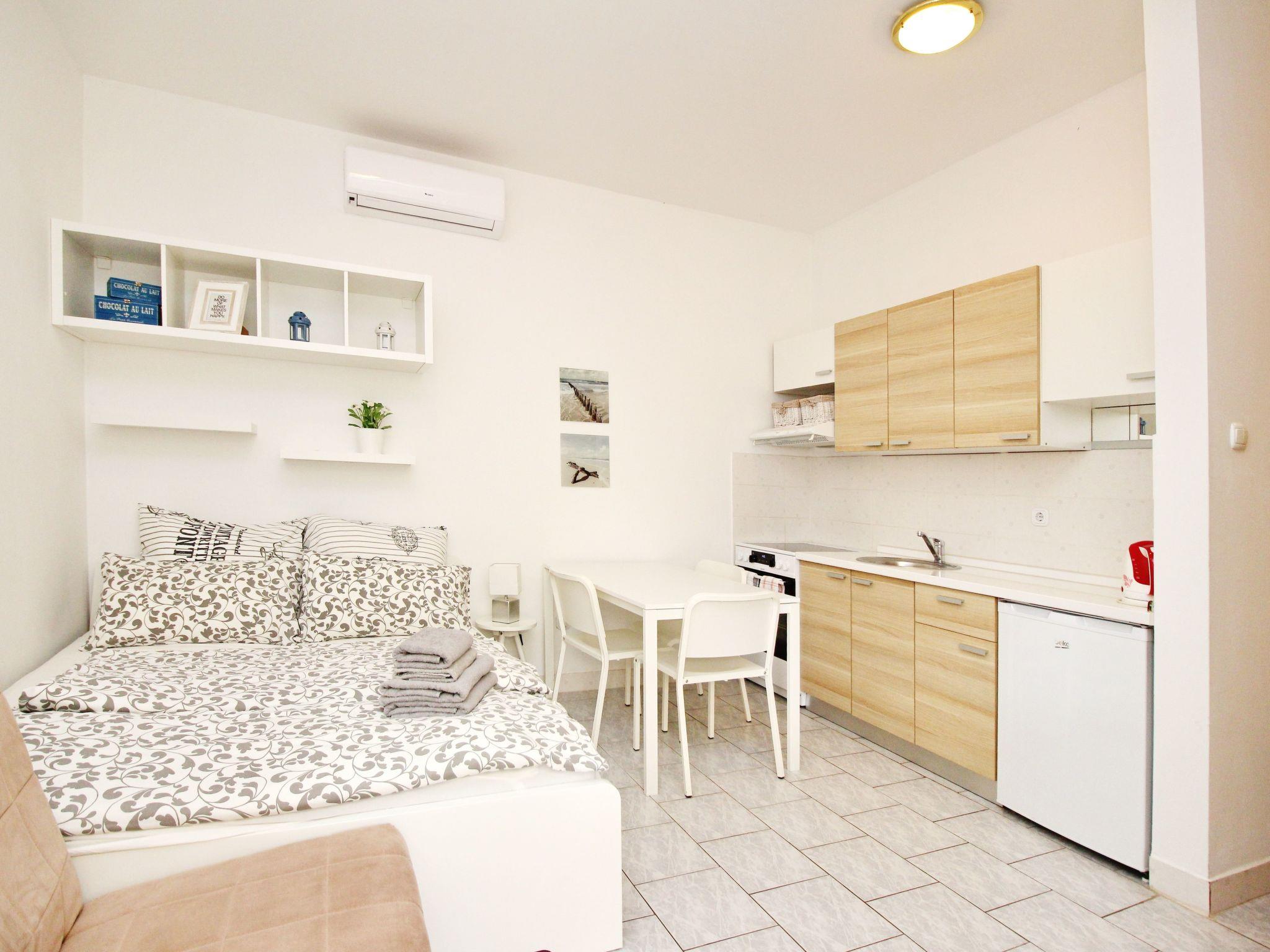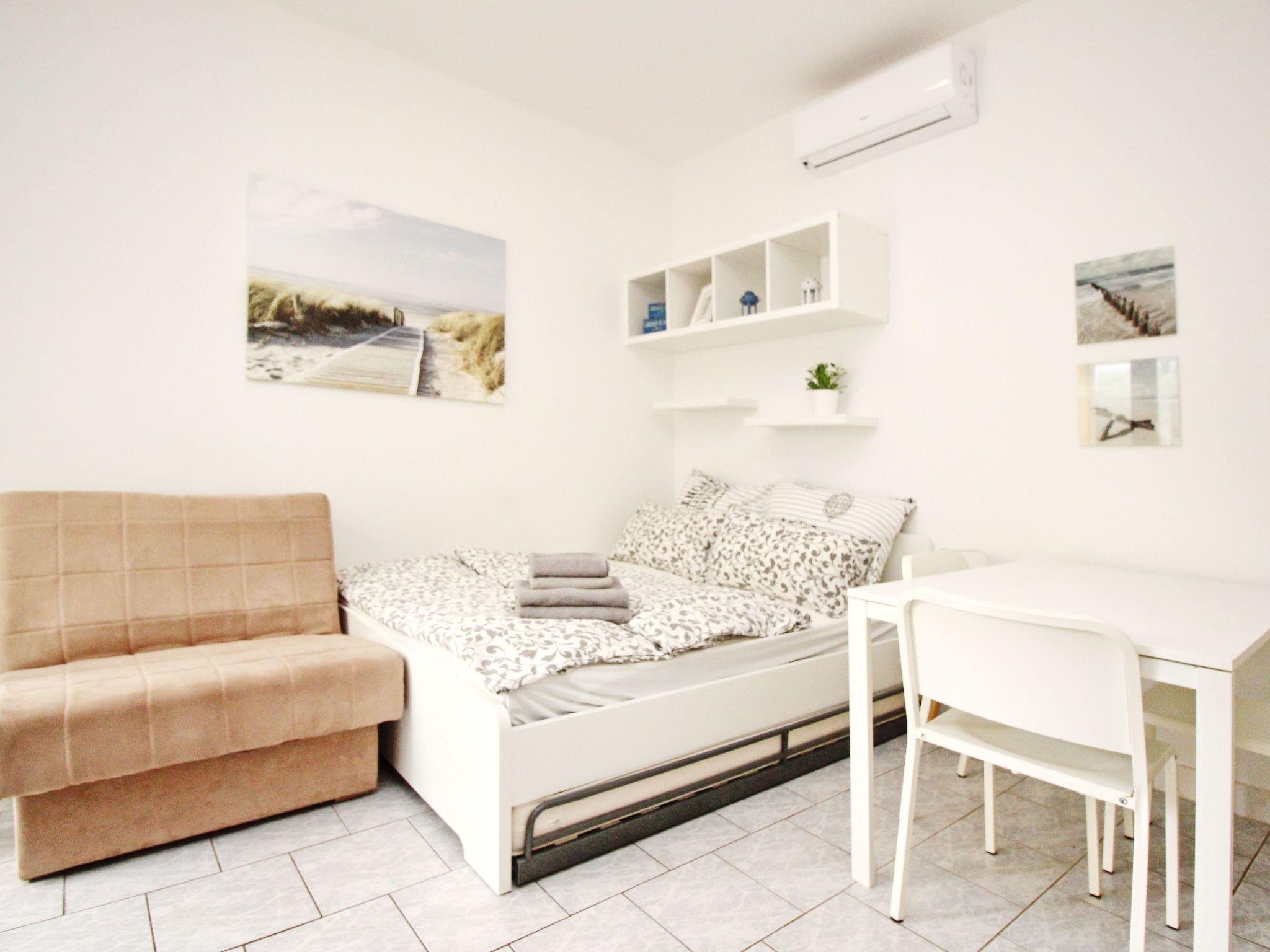 Studio flat / No. of persons: 2 Apartment facilities: Studio flat: (sleeping, living and cooking area are one room), with terrace, tiled, French bed Kitchenette:Dining table and seating for all persons, crockery, pots and pans, cutlery etc. available, dish towels available, electric cooker, number of hotplates: 4, oven, fridge with freezer compartment, coffee machine, kettle Bathroom : Bathroom with WC, with shower Special features of the accommodation unit : Air conditioning, air conditioning included in price: Anzahl 1, Sat-TV, Bed linen provided in weekly change, Towels provided (2 small/person and week), One pet allowed. Terrace : private terrace, table and chairs for the terrace are available, terrace surface: 15sqm Environment: car park secured nearby without additional charges. Other options: Pets are allowed on request.
