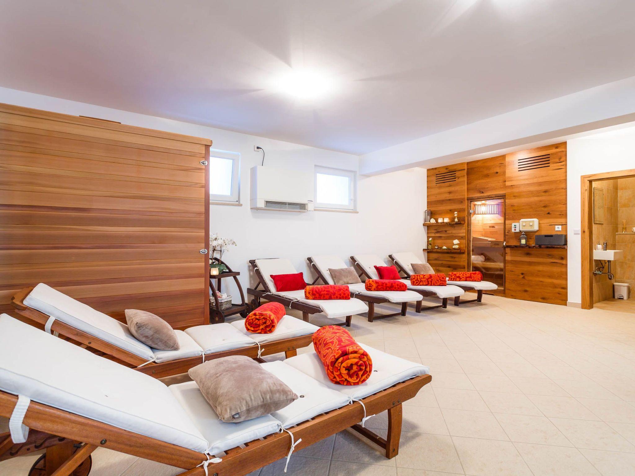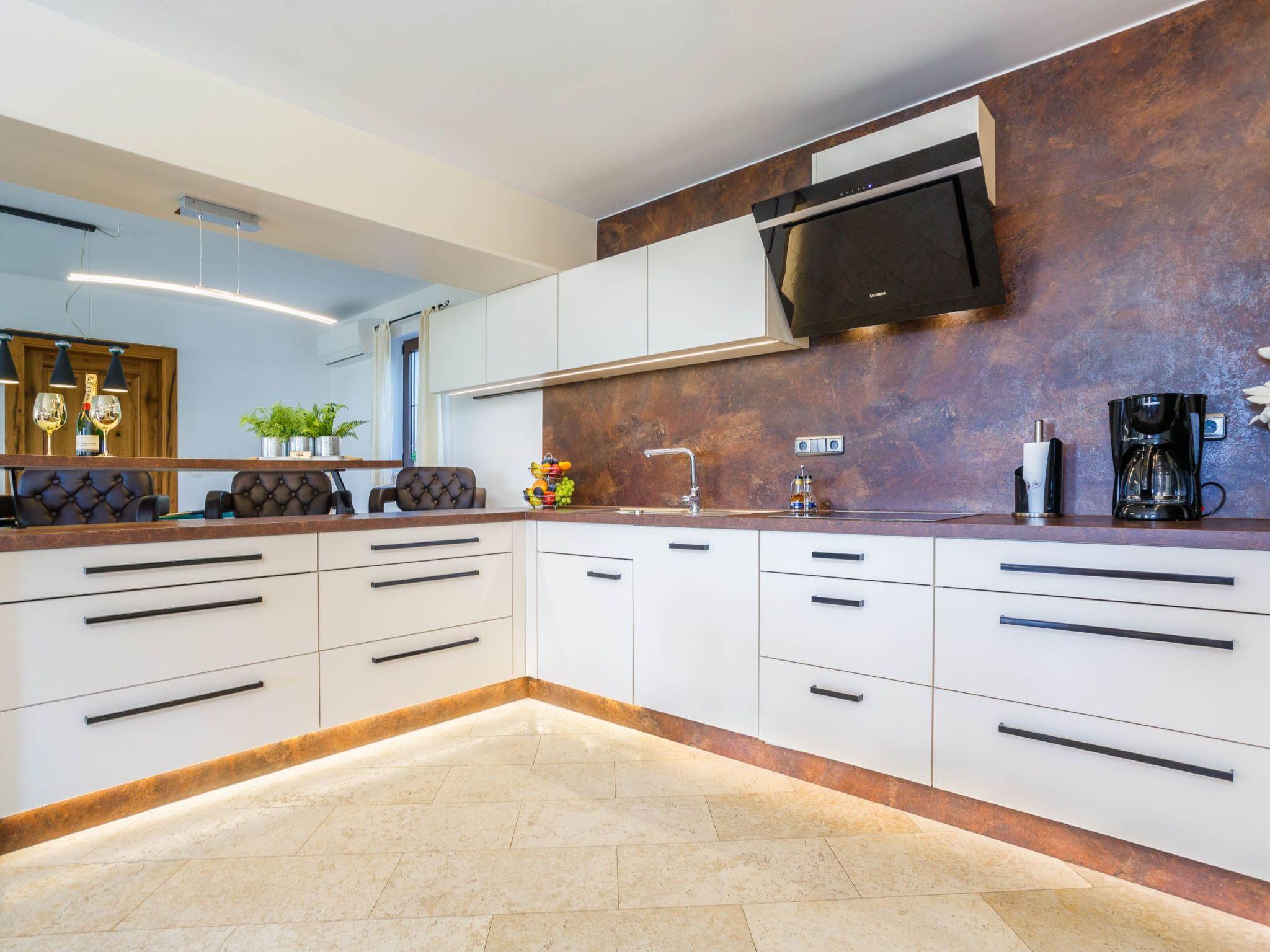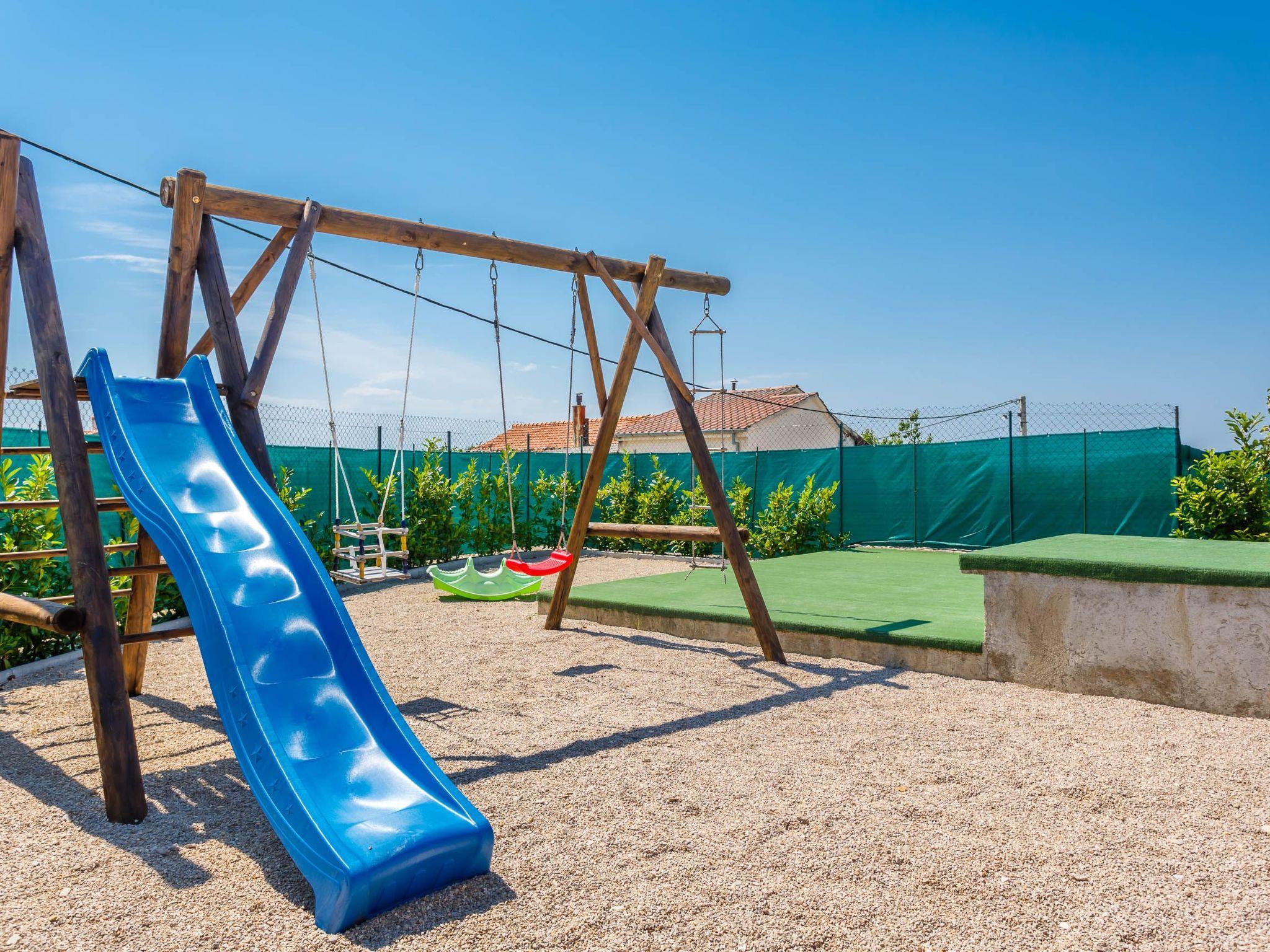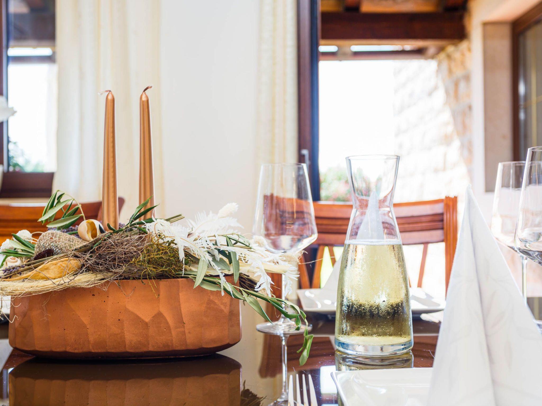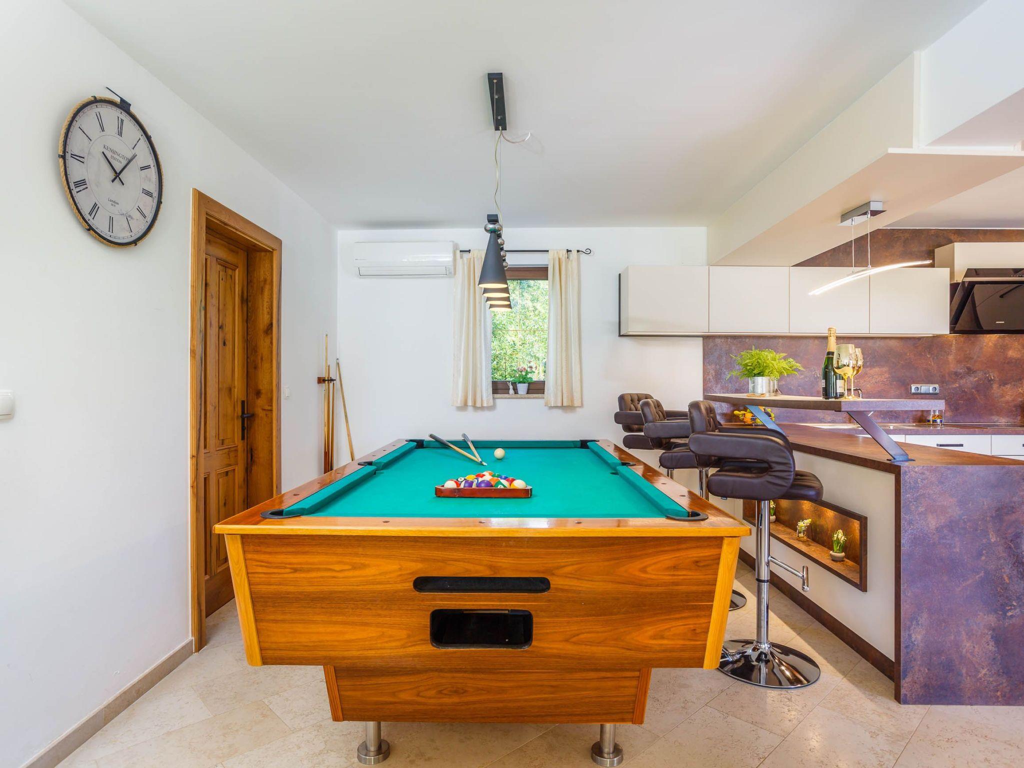 The indoor and outdoor pool have massage jets and a counterflow system. The play area is fenced. There are four parking spaces on site. The free wireless Internet connection works both in the house and outside in the garden. Very close to the house, just 100 metres away, you can find a little grocery shop. There is a supermarket 3km away. The fact that you are on an island has the advantage that the sea is never far away. It is 4km to the nearest sandy beach in Soline, 6km to the sandy beach at Malinska, and the largest sandy beach on the Adriatic coast is in Baska 15km away.