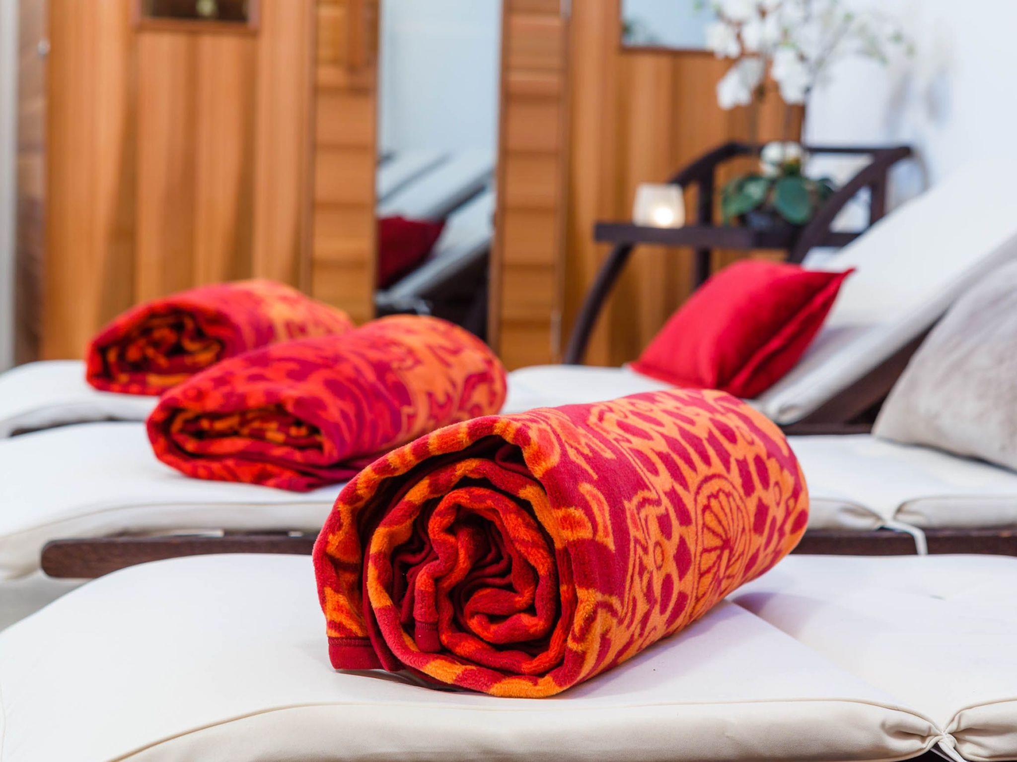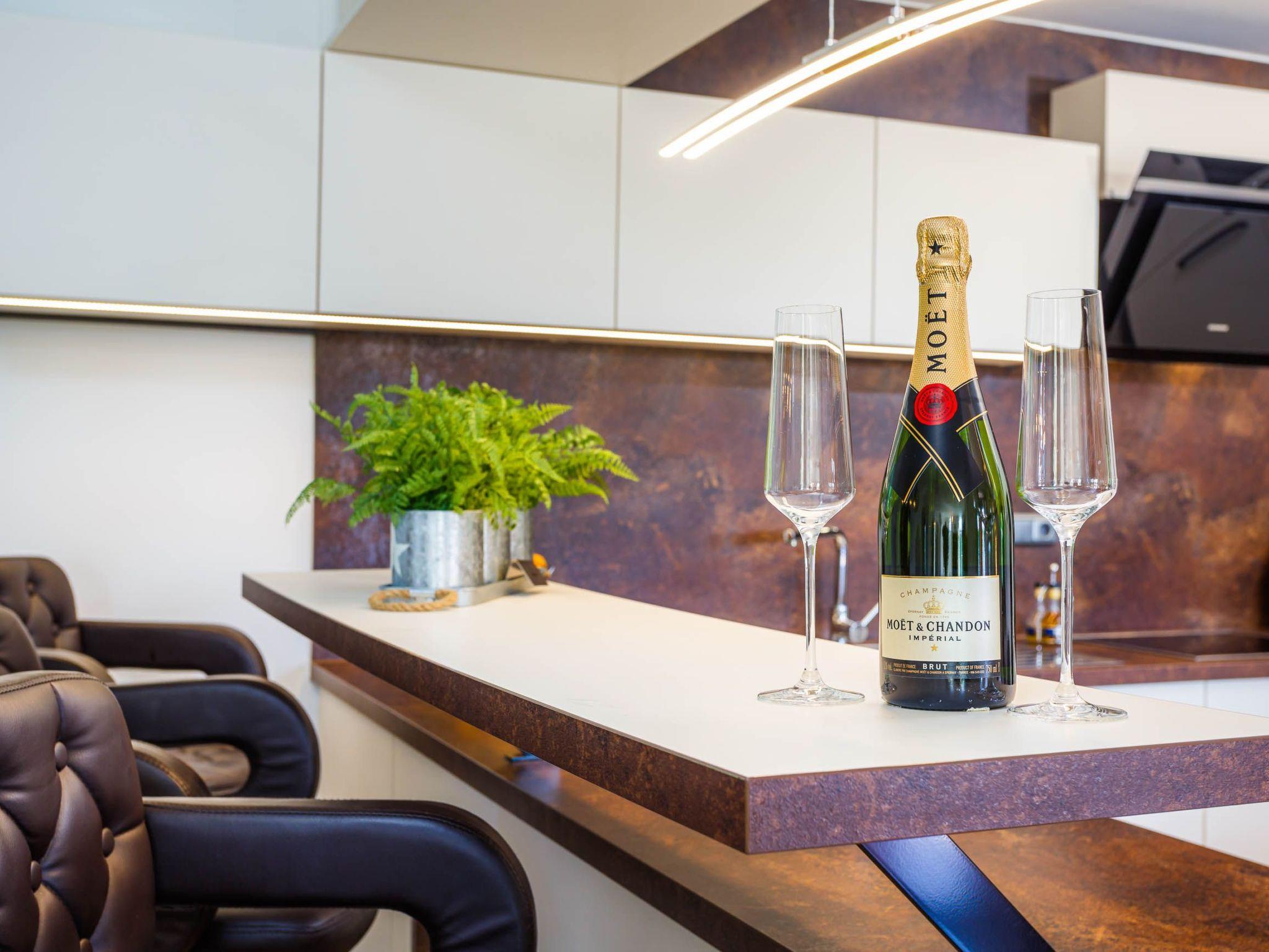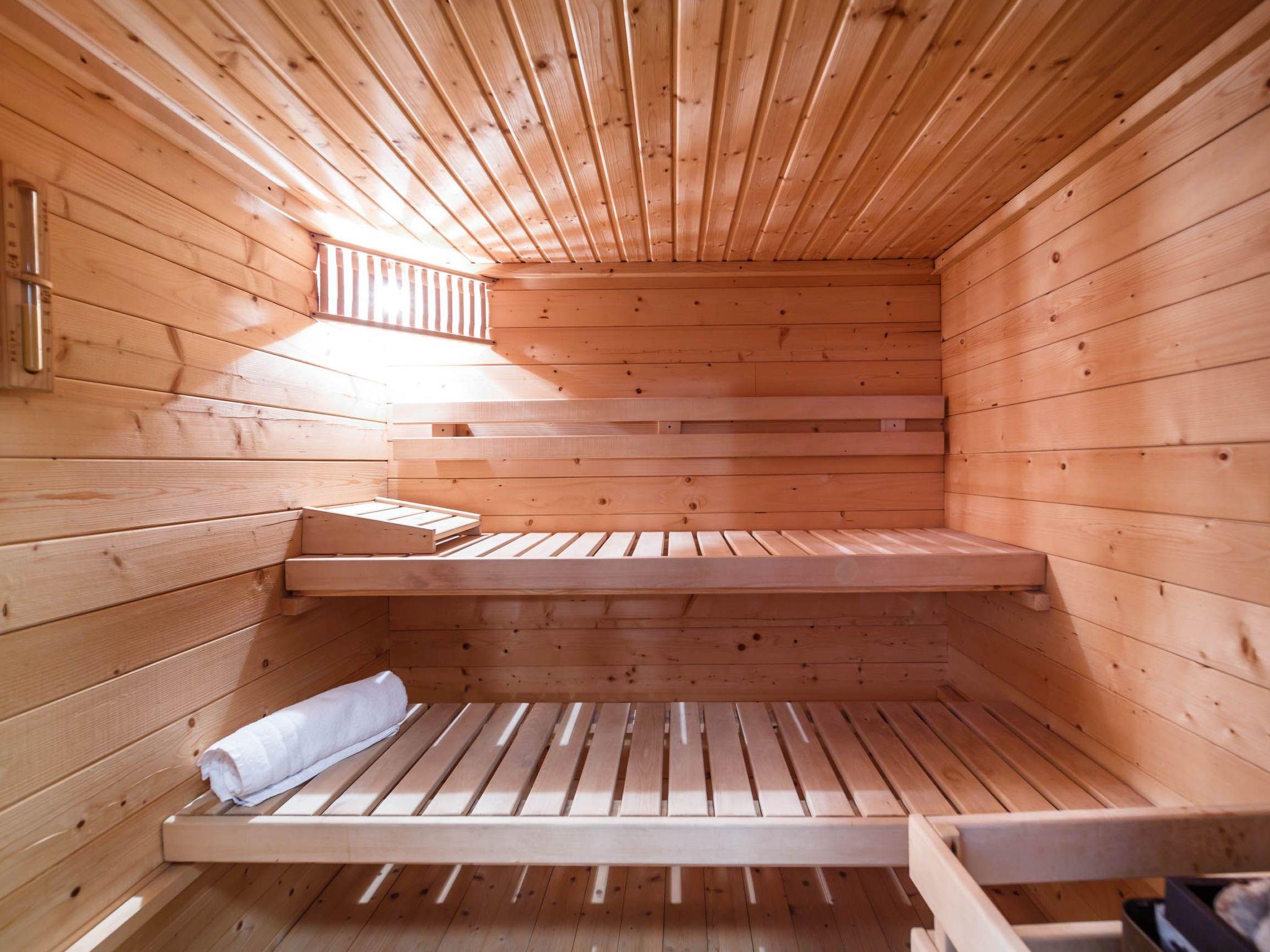 The basement has a fully-equipped wellness centre with a heated 17m² pool, a sauna for four people, a relaxation area with loungers and a shower room with a WC. The centrepiece of the house is the spacious living room on the first floor, where there is also a bathroom. The living room comprises an open, fully-equipped kitchen with a dining space and a cosy sitting area with comfortable sofas.