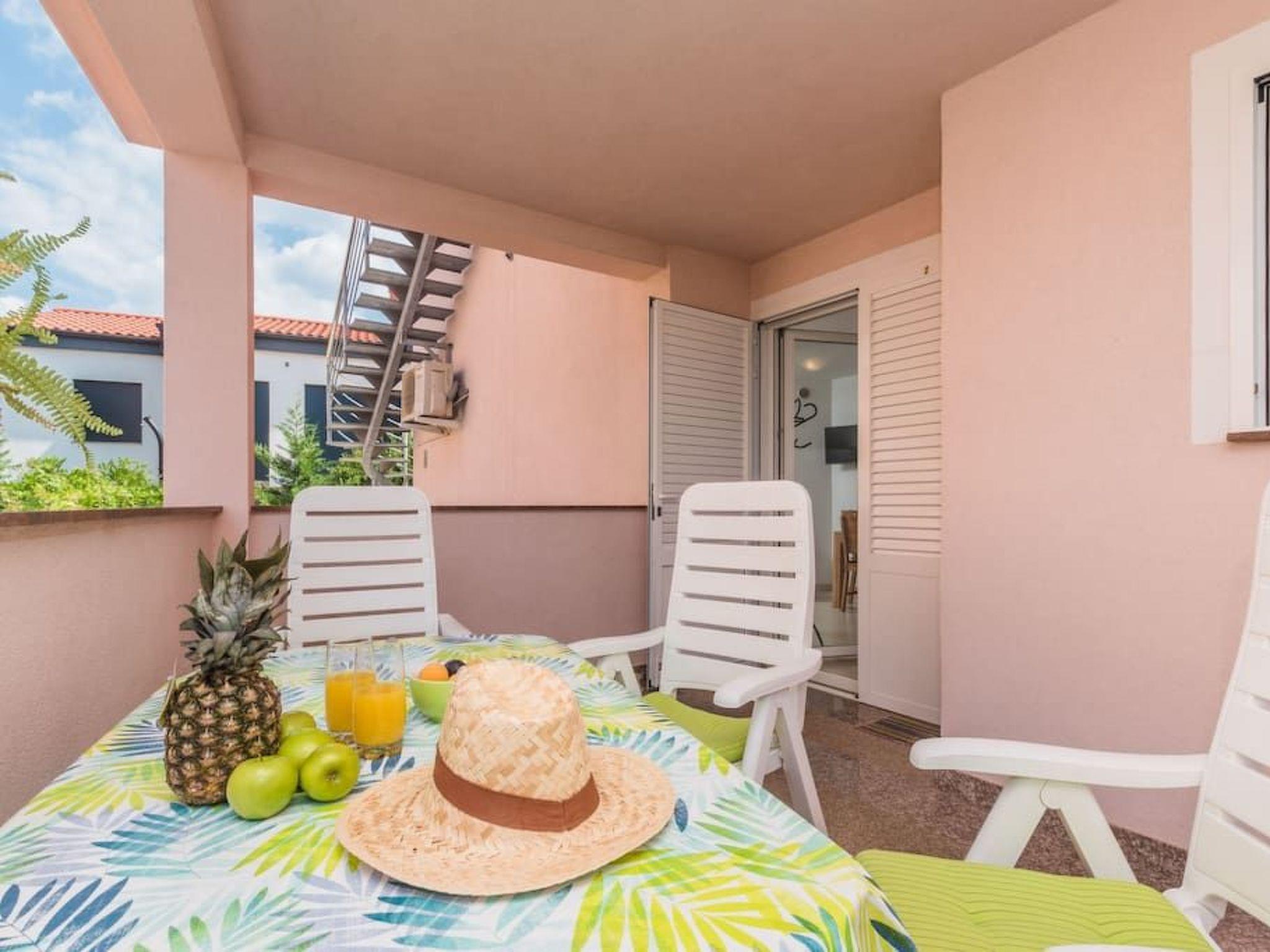Outside, the furnished balcony invites you to spend cosy hours with a view over the village and the glittering sea. The garden, intended for communal use, offers green recreational spaces that invite you to relax outdoors. Practical additions such as the barbecue area, the car park on the property and the outdoor shower increase the comfort of your stay.