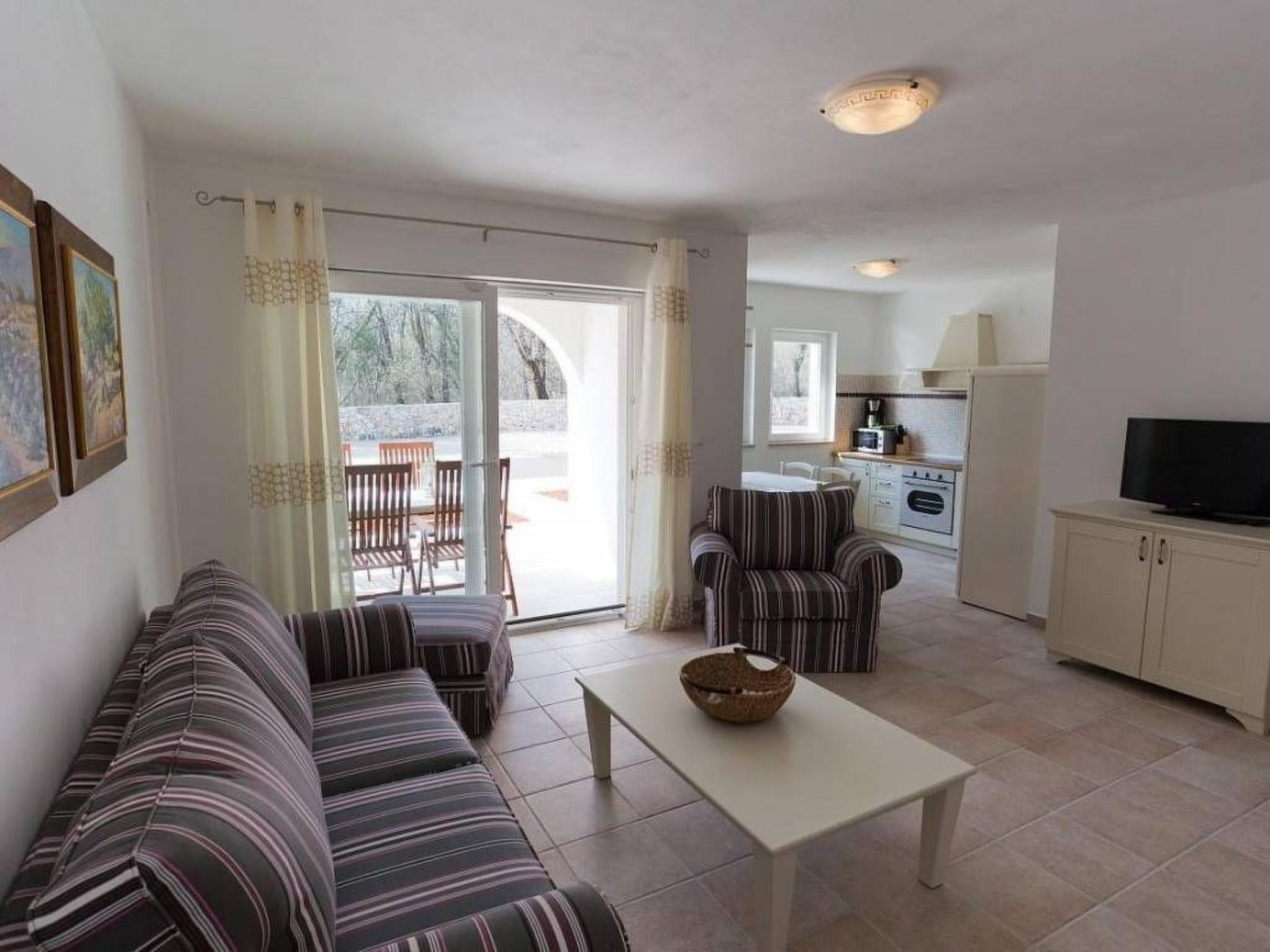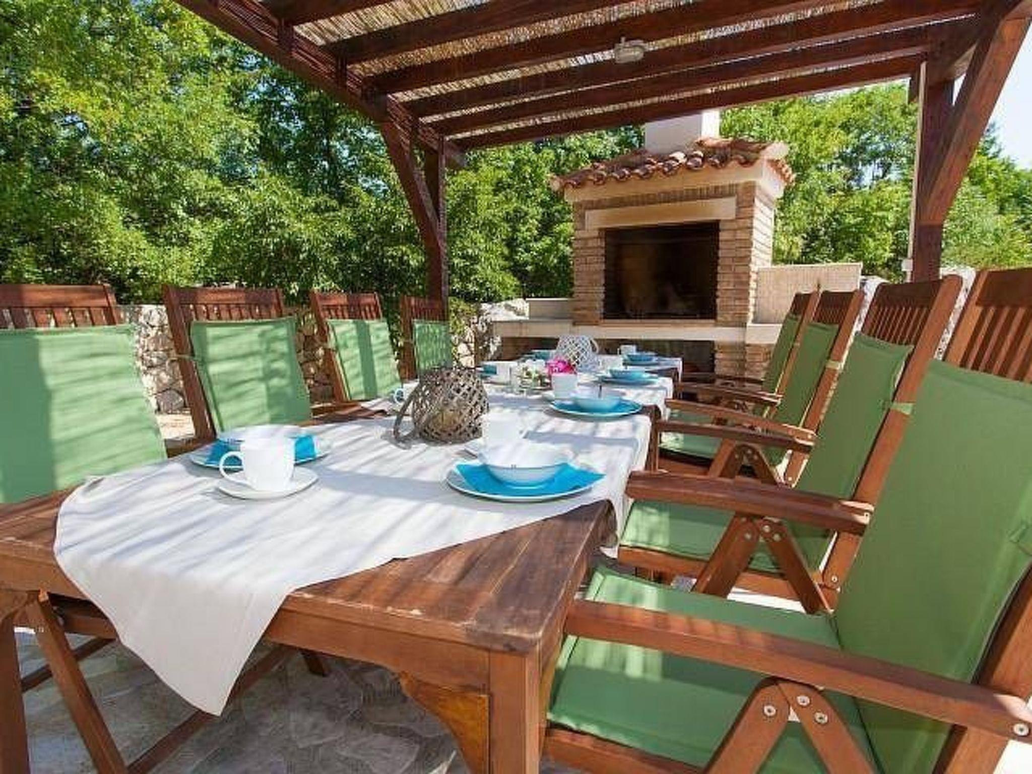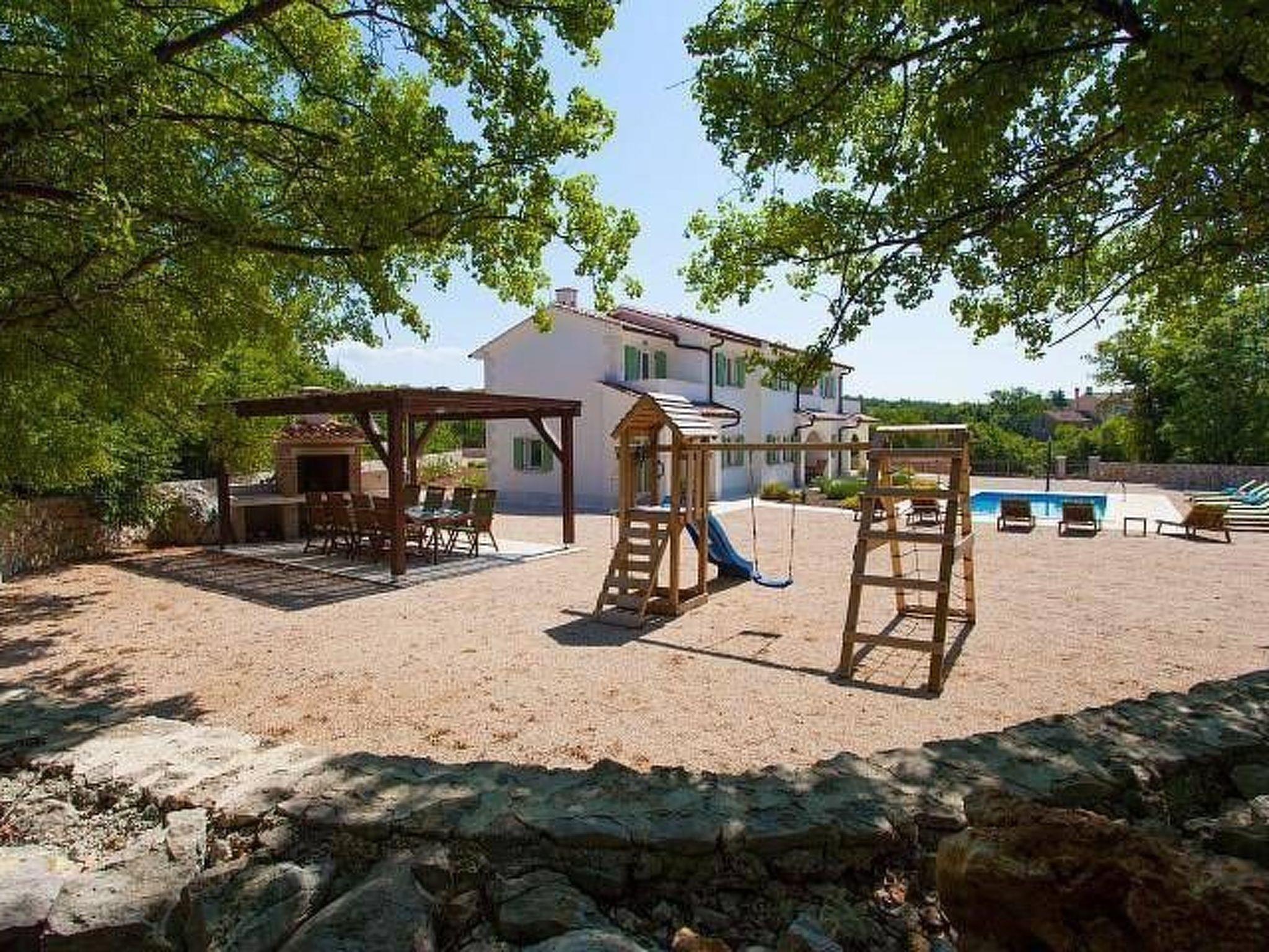 Enclosed, newly built (2013) holiday villa with a private pool, an outdoor shower, a traditional stone grill on the roofed terrace, a children’s playground and three self-contained holiday apartments next to each otherThis exclusive holiday villa is in the peaceful little village of Kras in the middle of the sunny island of Krk, providing luxurious accommodation for a relaxing holiday far away from tourist noise. The holiday villa was newly built just recently in 2013 and is therefore equipped with all the necessary modern amenities for a comfortable stay, including air conditioning (cooling and heating) in all rooms. It comprises three modern and tastefully furnished holiday apartments next to each other, each with its own separate entrance. As the three apartments, each of 100m², can only be booked together, the villa is particularly suitable for a large family or a group of friends who would like to retain some privacy on their holiday together. The holiday apartments are on two floors and have an identical layout and furnishing, each with a light and airy living and dining room with an integrated, open kitchen, two bedrooms and two spacious daylight bathrooms. The ground floor has a living room flooded with daylight, providing a comfortable sofa and armchair, a coffee table and a wide, digital flatscreen TV with satellite channels. The open fireplace built into the wall exudes a cosy atmosphere and provides pleasant warmth on cooler evenings. Right next to it there is the white built-in kitchen with only the latest appliances, including a dishwasher, a ceramic hob with an elegant extractor fan, an electric oven, a fridge with a freezer compartment, a microwave, a kettle and a coffee machine. The ground floor also has one of the two bathrooms, this one with a spacious shower cubicle, a washbasin with a big wall mirror, a hairdryer, bidet, toilet and washing machine. Wide stone stairs lead upstairs to the bedrooms and the second bathroom. One of the two bedrooms has a double bed measuring 160 x 200cm, while the second has two single beds measuring 90 x 200cm, which can also be joined together as a double bed. Both bedrooms are furnished with bedside tables and reading lamps, as well as cupboards with plenty of storage space for your clothing and luggage. The bathroom on this floor is fitted the same as the ground-floor bathroom, but instead of the shower cubicle it has a bath with a shower attachment, and no washing machine. Plenty of bed linen and towels are provides and the reliable wireless Internet connection in the apartment is free of charge. Big glass sliding doors in the living room open directly onto your sunny terrace with a wooden table and chairs for leisurely holiday breakfasts and other meals. From there you can access the 8 x 4m private pool with comfortable sun loungers. Children will enjoy the playground with a swing and slide. The roofed terrace has a traditional stone grill, inviting you to enjoy long meals together under a starry sky. A car is recommended during your stay. There are plenty of secure parking spaces right in front of the holiday villa on the enclosed site. If you do not wish to travel without your pet then it is also welcome here. Your holiday villa is only about 500 metres from the centre of the little village of Kras with its shops, colourful markets and gastronomy. It is about 8km to the nearest beach with crystal clear water. There are many cycling and hiking trails in the immediate vicinity, for exploring the multifaceted island.