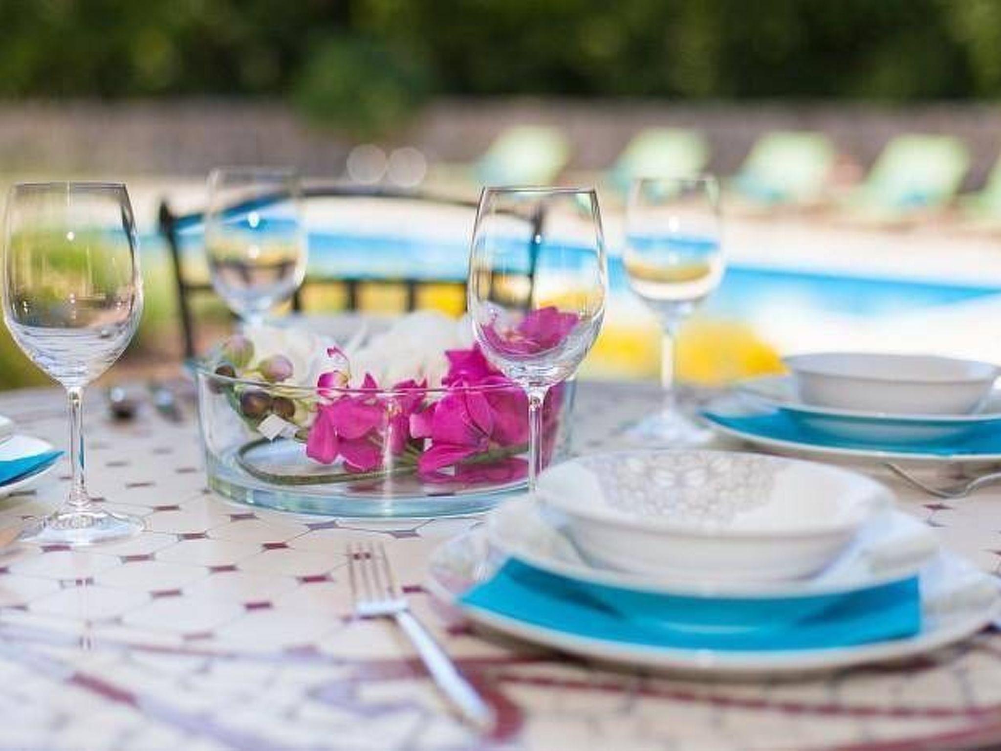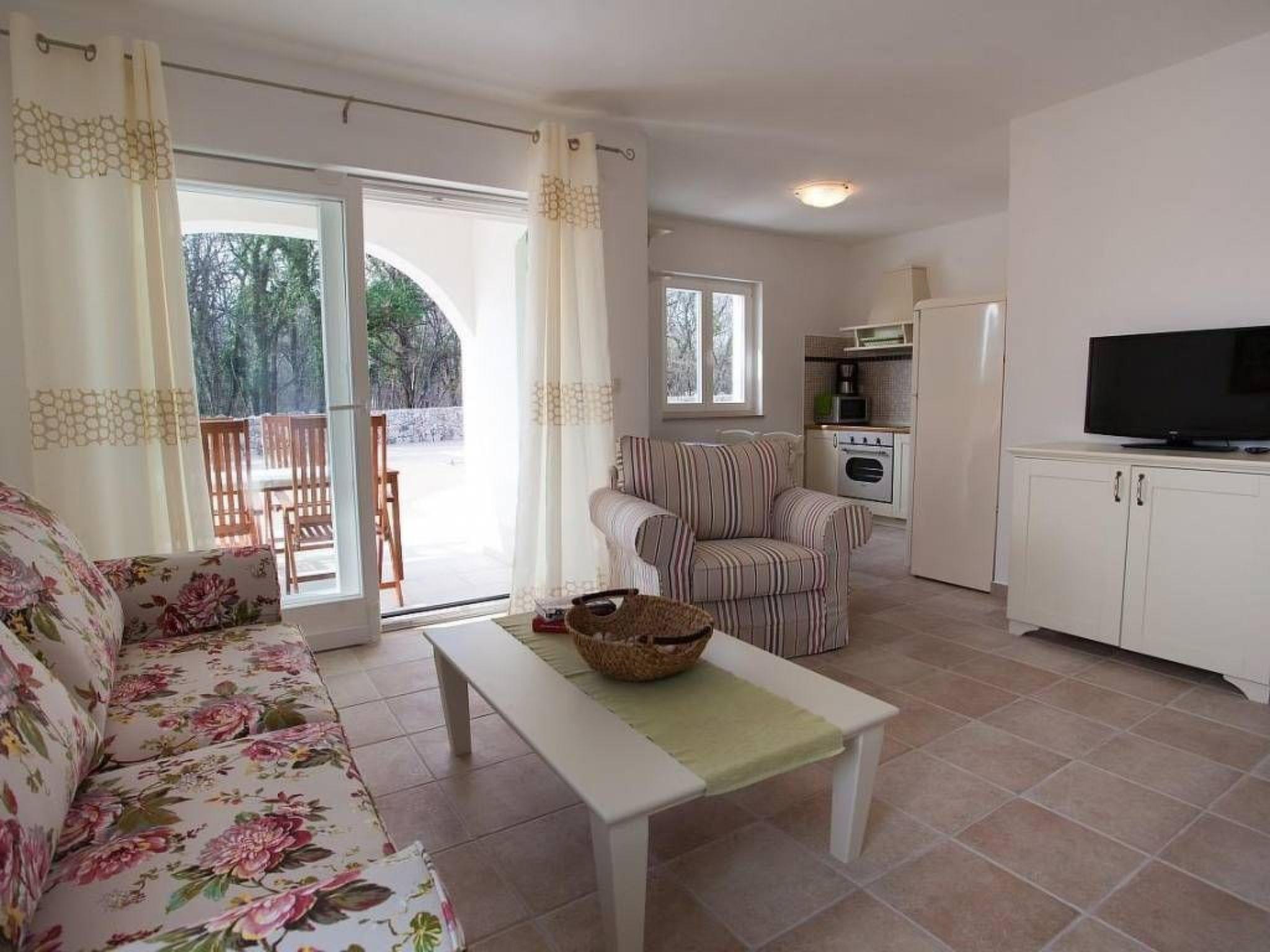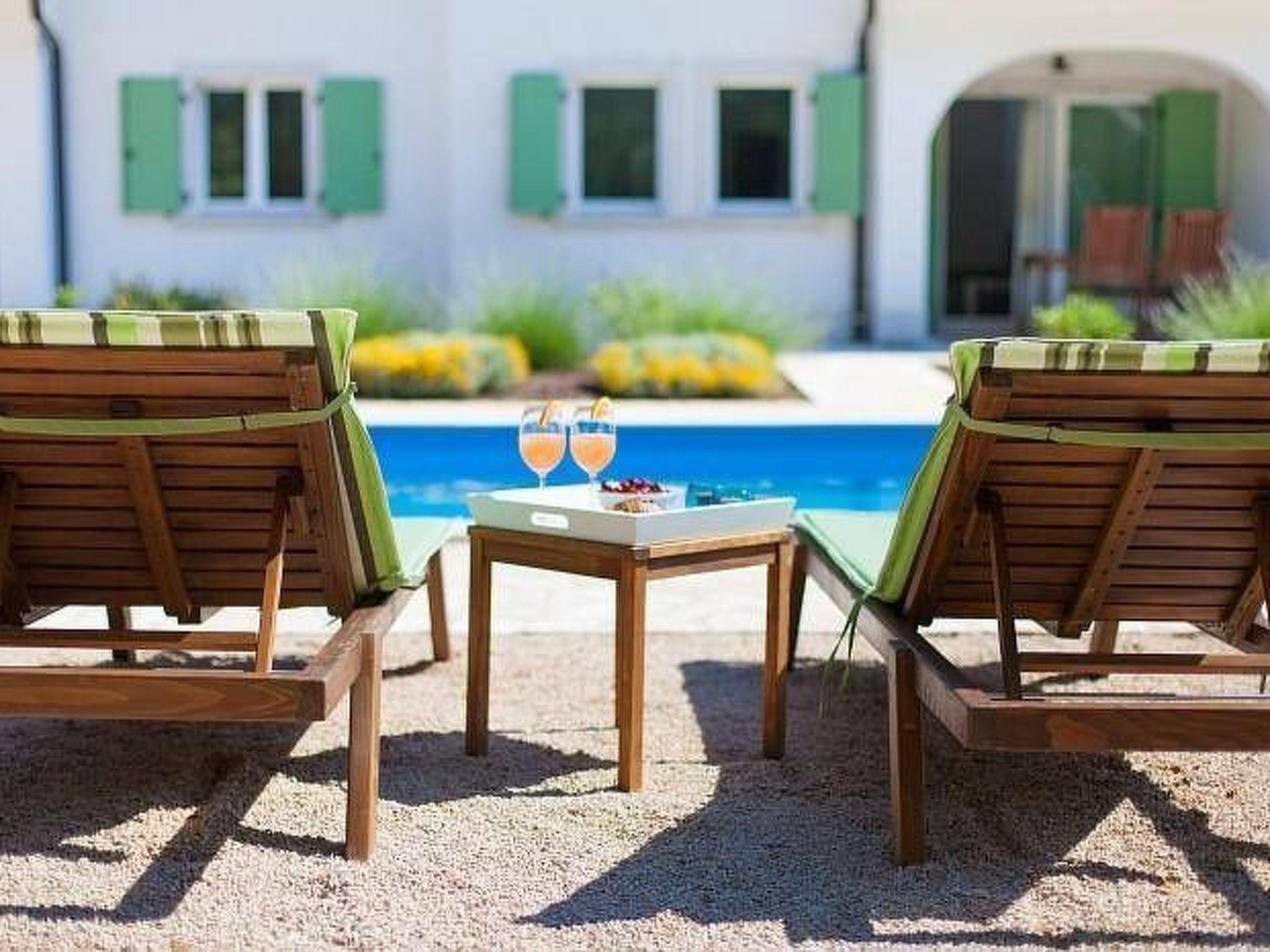 Enclosed, newly built (2013) holiday villa with a private pool, an outdoor shower, a traditional stone grill on the roofed terrace, a children’s playground and three self-contained holiday apartments next to each otherThis exclusive holiday villa is in the peaceful little village of Kras in the middle of the sunny island of Krk, providing luxurious accommodation for a relaxing holiday far away from tourist noise. The holiday villa was newly built just recently in 2013 and is therefore equipped with all the necessary modern amenities for a comfortable stay, including air conditioning (cooling and heating) in all rooms. It comprises three modern and tastefully furnished holiday apartments next to each other, each with its own separate entrance. As the three apartments, each of 100m², can only be booked together, the villa is particularly suitable for a large family or a group of friends who would like to retain some privacy on their holiday together. The holiday apartments are on two floors and have an identical layout and furnishing, each with a light and airy living and dining room with an integrated, open kitchen, two bedrooms and two spacious daylight bathrooms. The ground floor has a living room flooded with daylight, providing a comfortable sofa and armchair, a coffee table and a wide, digital flatscreen TV with satellite channels. The open fireplace built into the wall exudes a cosy atmosphere and provides pleasant warmth on cooler evenings. Right next to it there is the white built-in kitchen with only the latest appliances, including a dishwasher, a ceramic hob with an elegant extractor fan, an electric oven, a fridge with a freezer compartment, a microwave, a kettle and a coffee machine. The ground floor also has one of the two bathrooms, this one with a spacious shower cubicle, a washbasin with a big wall mirror, a hairdryer, bidet, toilet and washing machine. Wide stone stairs lead upstairs to the bedrooms and the second bathroom. One of the two bedrooms has a double bed measuring 160 x 200cm, while the second has two single beds measuring 90 x 200cm, which can also be joined together as a double bed. Both bedrooms are furnished with bedside tables and reading lamps, as well as cupboards with plenty of storage space for your clothing and luggage. The bathroom on this floor is fitted the same as the ground-floor bathroom, but instead of the shower cubicle it has a bath with a shower attachment, and no washing machine. Plenty of bed linen and towels are provides and the reliable wireless Internet connection in the apartment is free of charge. Big glass sliding doors in the living room open directly onto your sunny terrace with a wooden table and chairs for leisurely holiday breakfasts and other meals. From there you can access the 8 x 4m private pool with comfortable sun loungers. Children will enjoy the playground with a swing and slide. The roofed terrace has a traditional stone grill, inviting you to enjoy long meals together under a starry sky. A car is recommended during your stay. There are plenty of secure parking spaces right in front of the holiday villa on the enclosed site. If you do not wish to travel without your pet then it is also welcome here. Your holiday villa is only about 500 metres from the centre of the little village of Kras with its shops, colourful markets and gastronomy. It is about 8km to the nearest beach with crystal clear water. There are many cycling and hiking trails in the immediate vicinity, for exploring the multifaceted island.