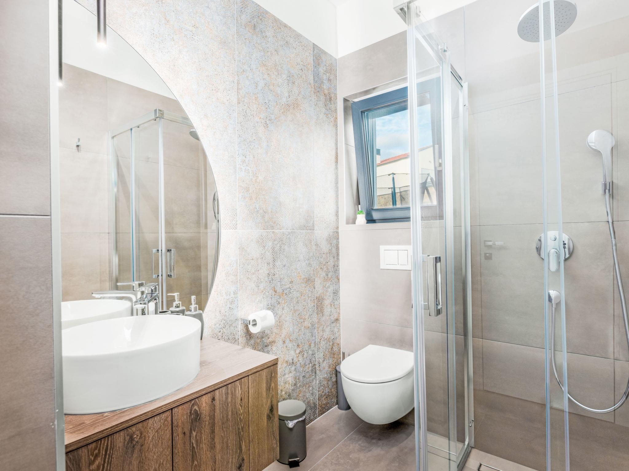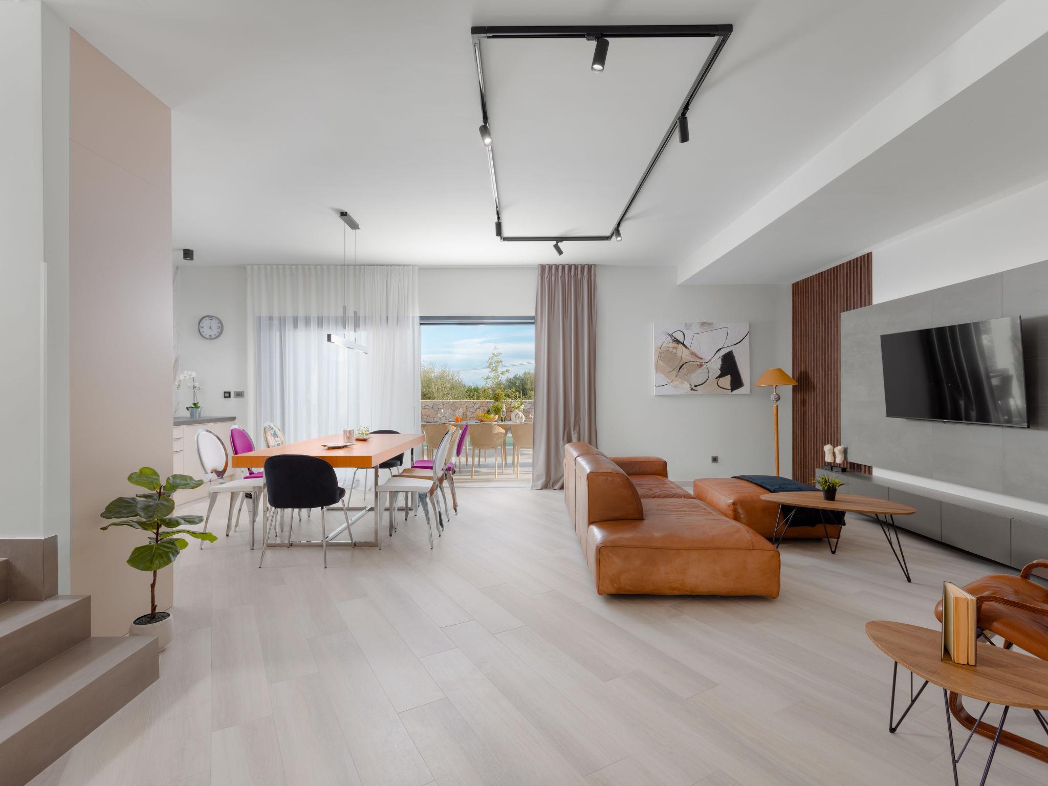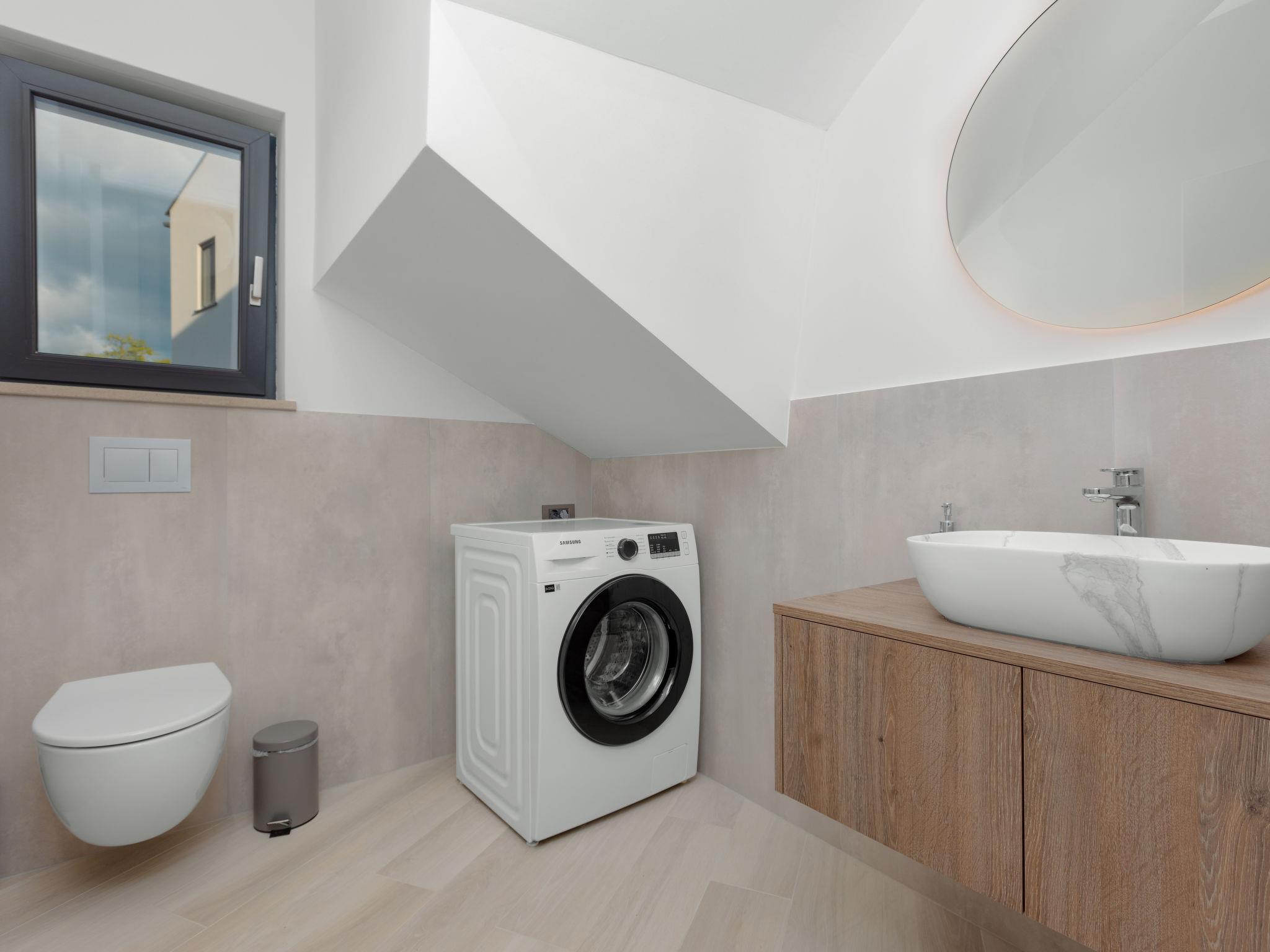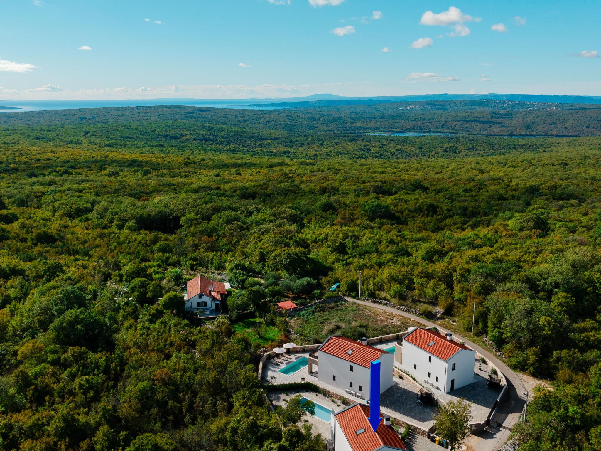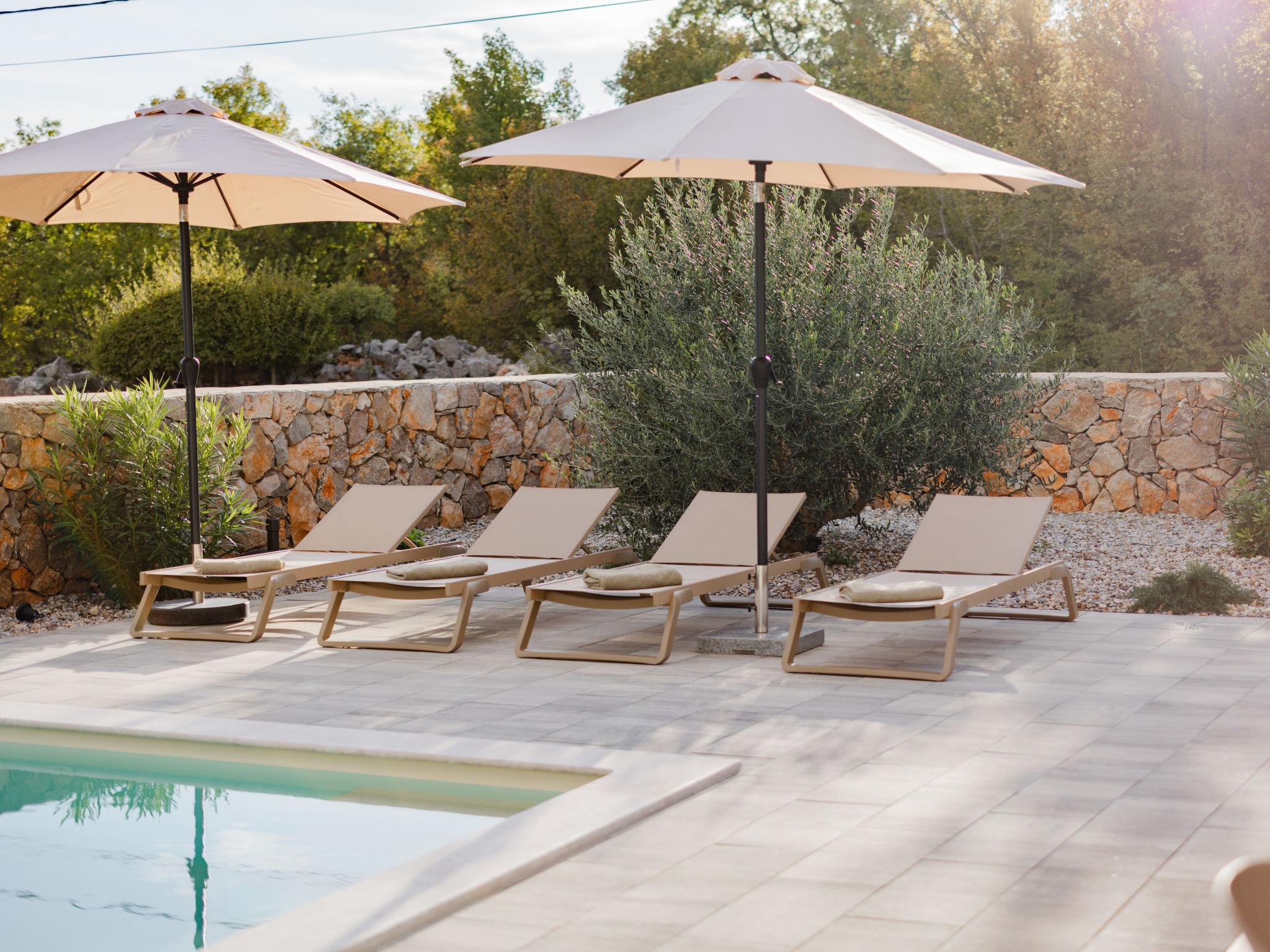 Kras: Modern villa "Dream", 2 storeys. 3.8 km from the centre of Dobrinj, 6.7 km from the centre of Malinska, 13 km from the centre of Krk, 6 km from the sea, 6 km from the beach, in the countryside. Private: property 500 m2 (fenced), garden 150 m2, swimming pool angular (8 x 3 m, depth 145 cm, seasonal availability: 01.Jun. - 15.Oct.) with internal staircase and salt-electrolysis pool-cleaning system. Outdoor shower, barbecue, pool maintenance by the owner/gardener. In the house: internet access. Parking (for 3 cars) at the house on the premises. Shop 900 m, supermarket 5 km, bus stop 900 m, pebble beach 6 km.