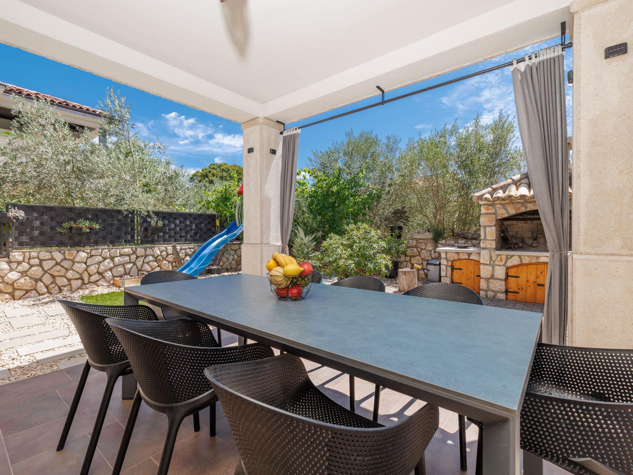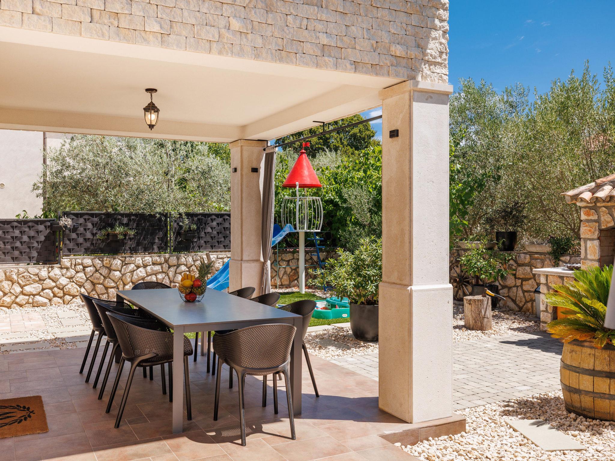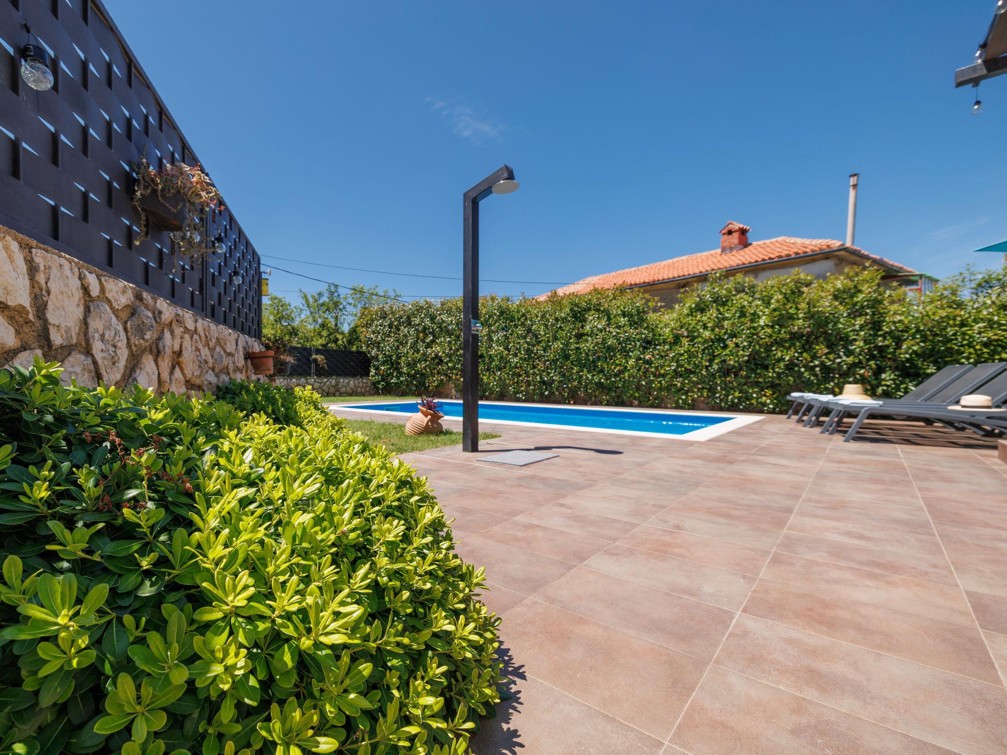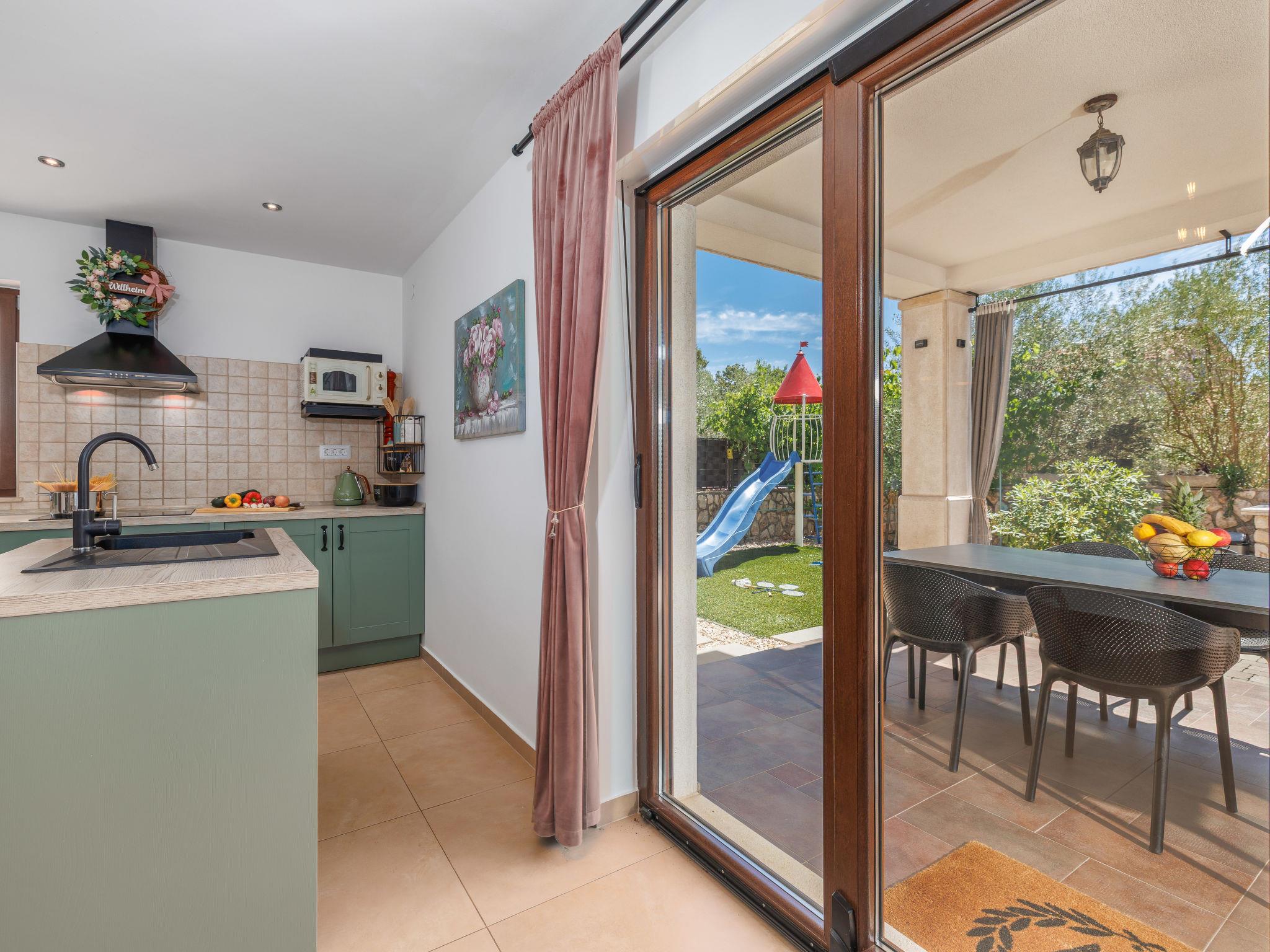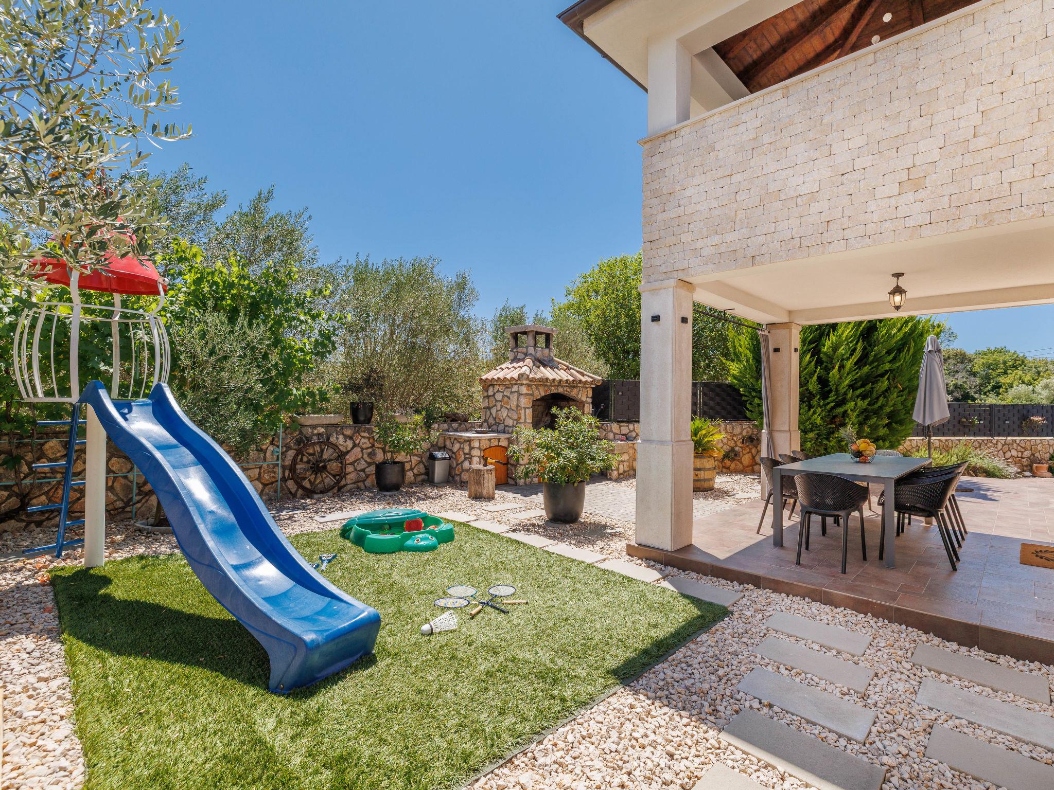 Sv.Ivan Dobrinjski 5 km from Dobrinj: Beautiful single-family house "Villa Willheim", 2 storeys. 4.5 km from the centre of Soline, 6 km from the centre of Malinska, 10 km from the centre of Šilo, in a sunny position, 3.5 km from the sea, 4 km from the beach. Private: property 500 m2 (fenced) with wildlife garden, beautiful garden to relax, swimming pool angular (6 x 3 m, 20 m2, depth 145 cm, seasonal availability: 18.Apr. - 10.Oct.) with internal staircase. Outdoor shower, barbecue, children's playground, pool maintenance by the owner/gardener. In the house: internet access, washing machine. Parking (for 2 cars) at the house on the premises. Shop 3 km, supermarket 5 km, restaurant 3 km, bus stop 4 km, pebble beach 4 km, concrete beach 4 km. Please note: airfield 18 km from the property.