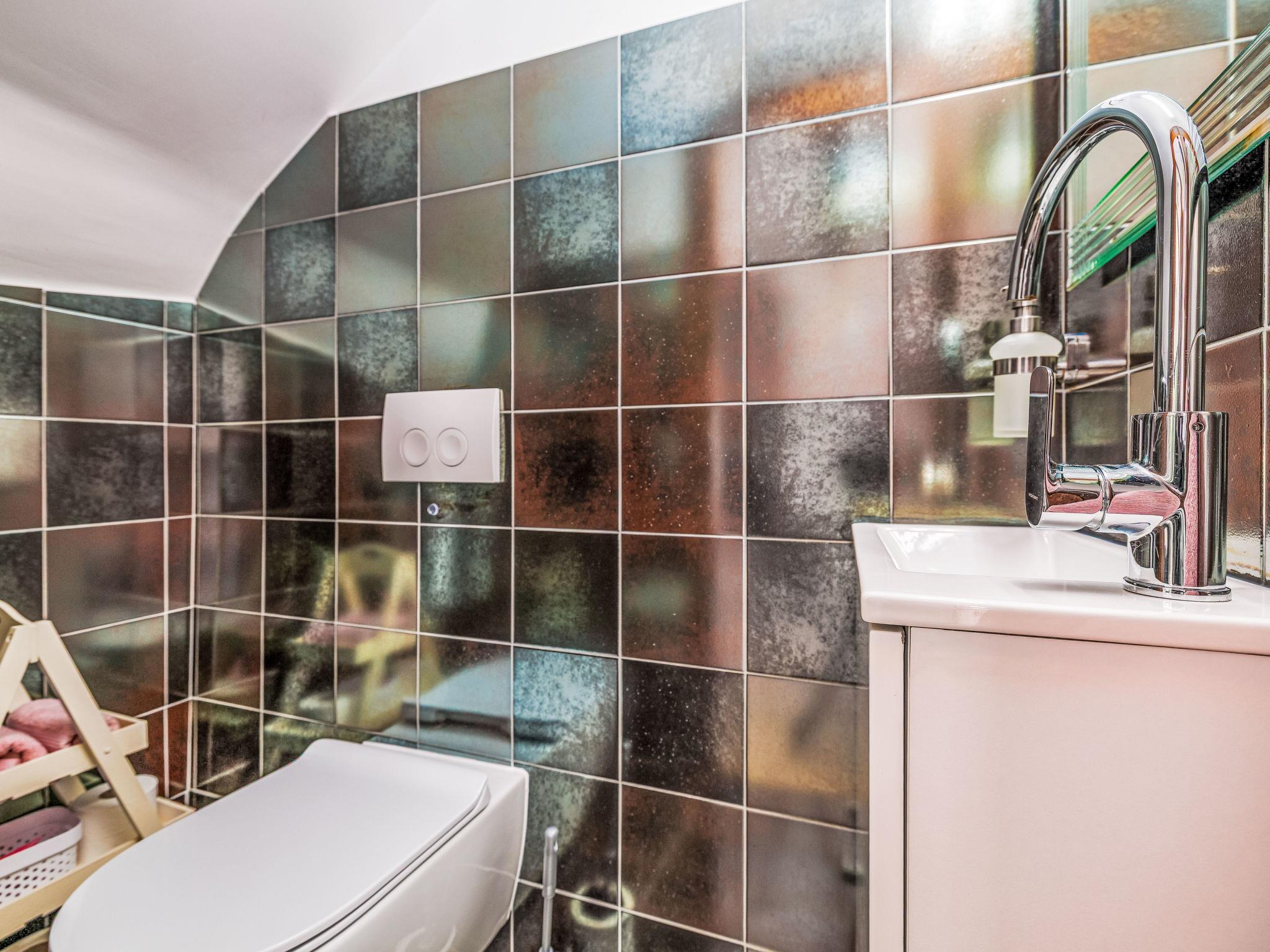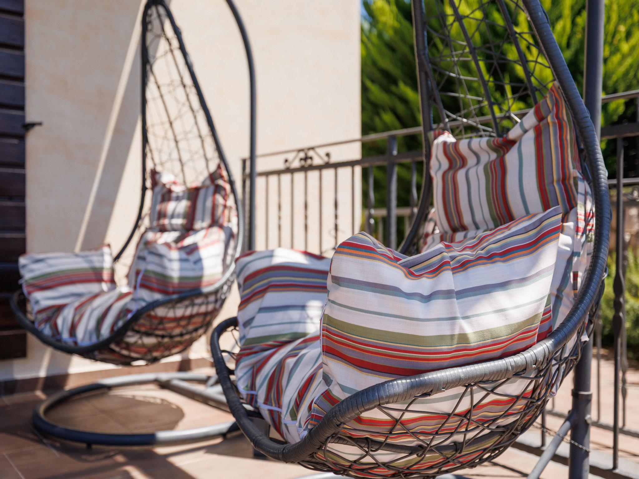 4-room house 120 m2 on 2 levels. Beautiful and cosy furnishings: living/dining room 56 m2 with open-hearth fireplace (only for decoration), satellite TV (flat screen), air conditioning. Exit to the terrace. Open kitchen (oven, dishwasher, 4 ceramic glass hob hotplates, microwave, freezer, electric coffee machine). Sep. WC. Upper floor: 1 room with 1 french bed (160 cm, length 200 cm), satellite TV (flat screen). 2 rooms, each room with 1 french bed (160 cm, length 200 cm), satellite TV (flat screen). Exit to the balcony. Bath/shower/WC. No heating option. Balcony 12 m2, terrace 15 m2, roofed, terrace 12 m2, roofed. Terrace furniture, deck chairs. View of the swimming pool. Facilities: children's high chair, baby cot, hair dryer. Internet (WiFi, free). Please note: non-smoking house. Maximum 1 pet/ dog allowed.