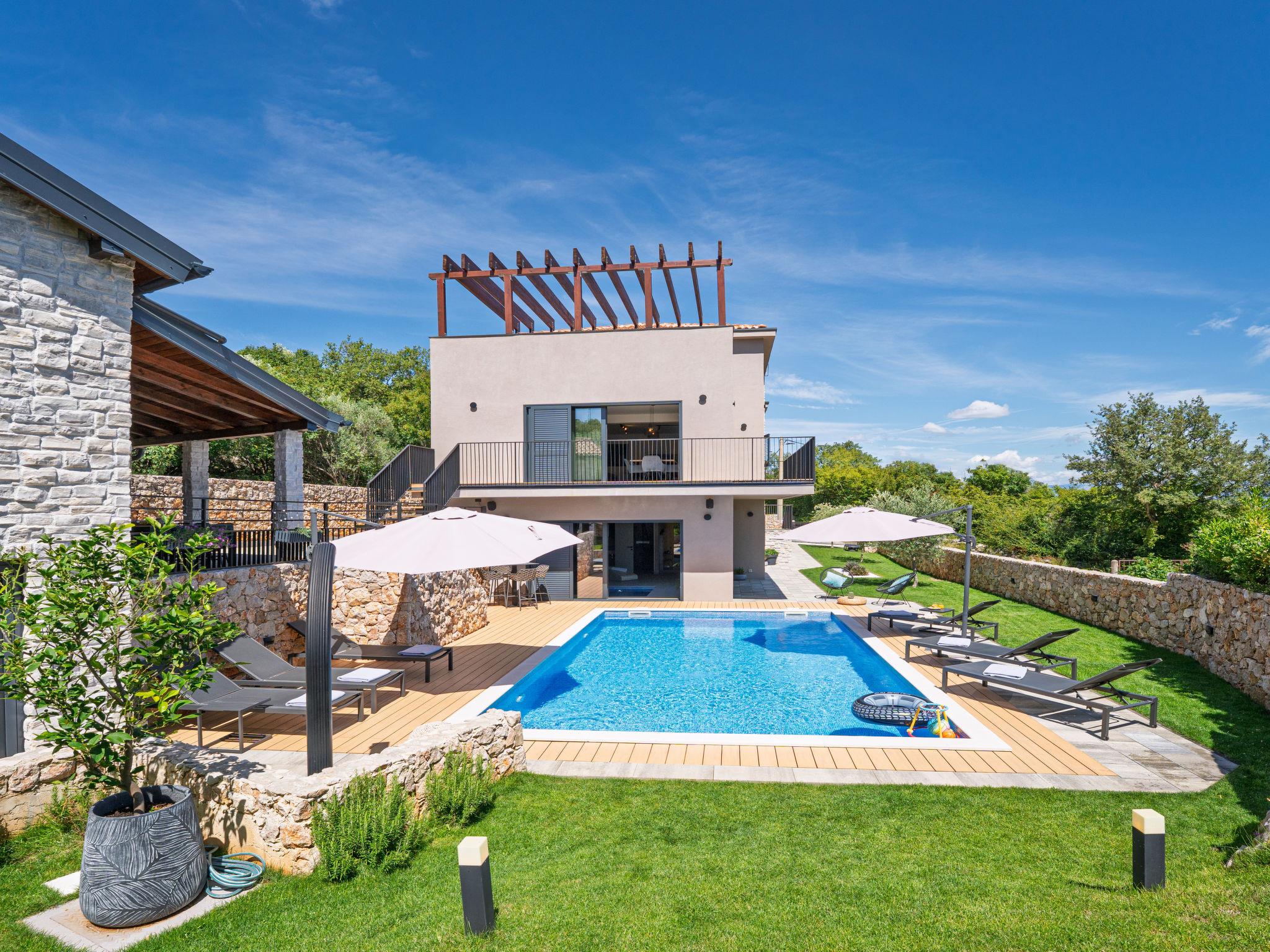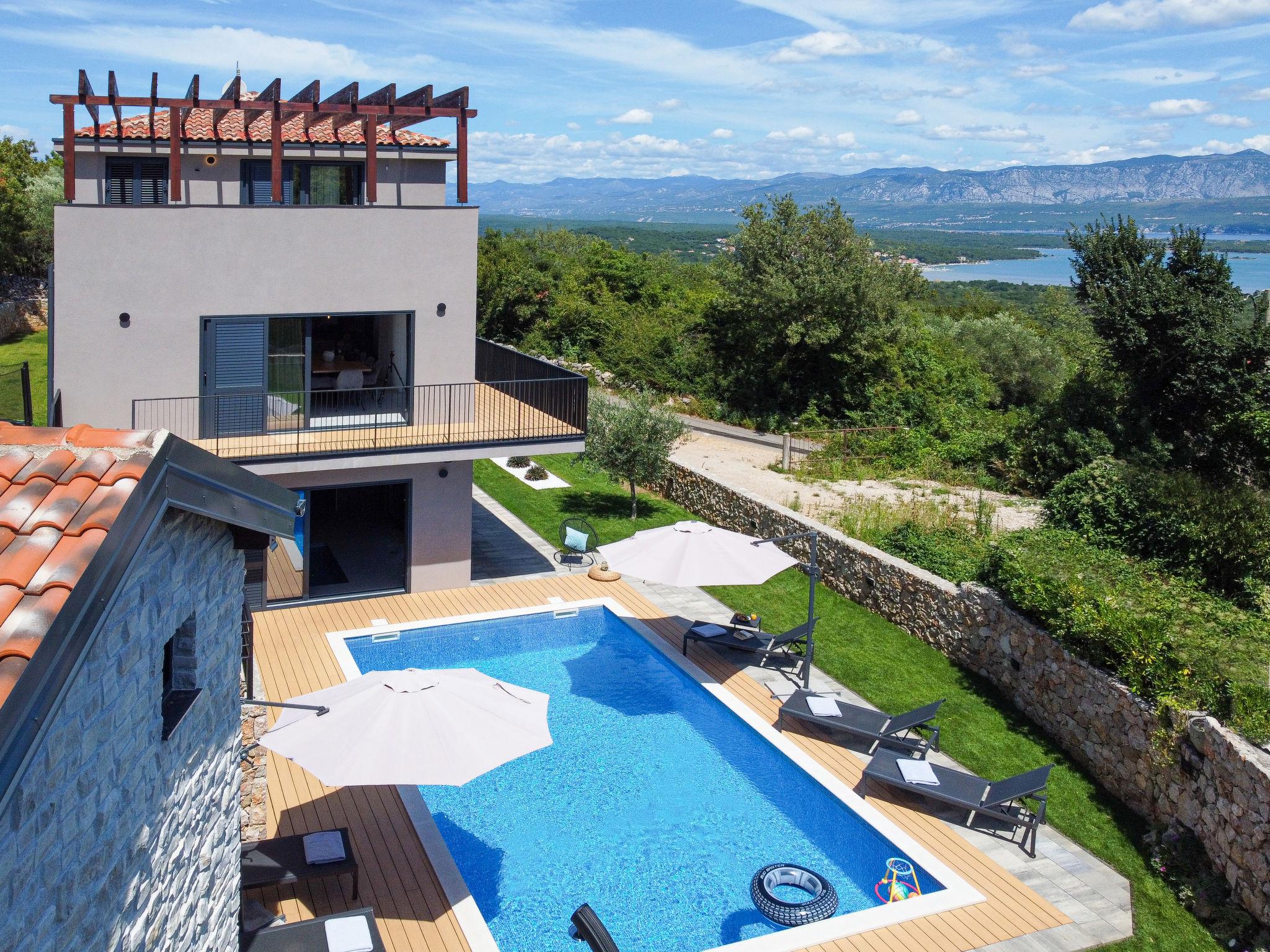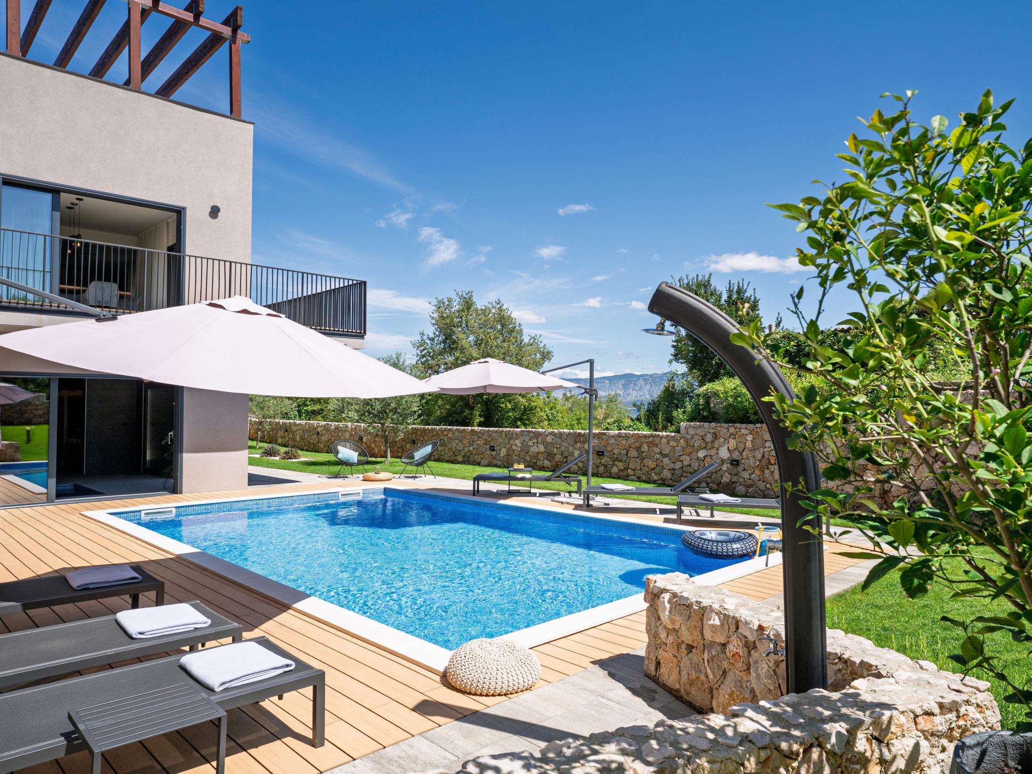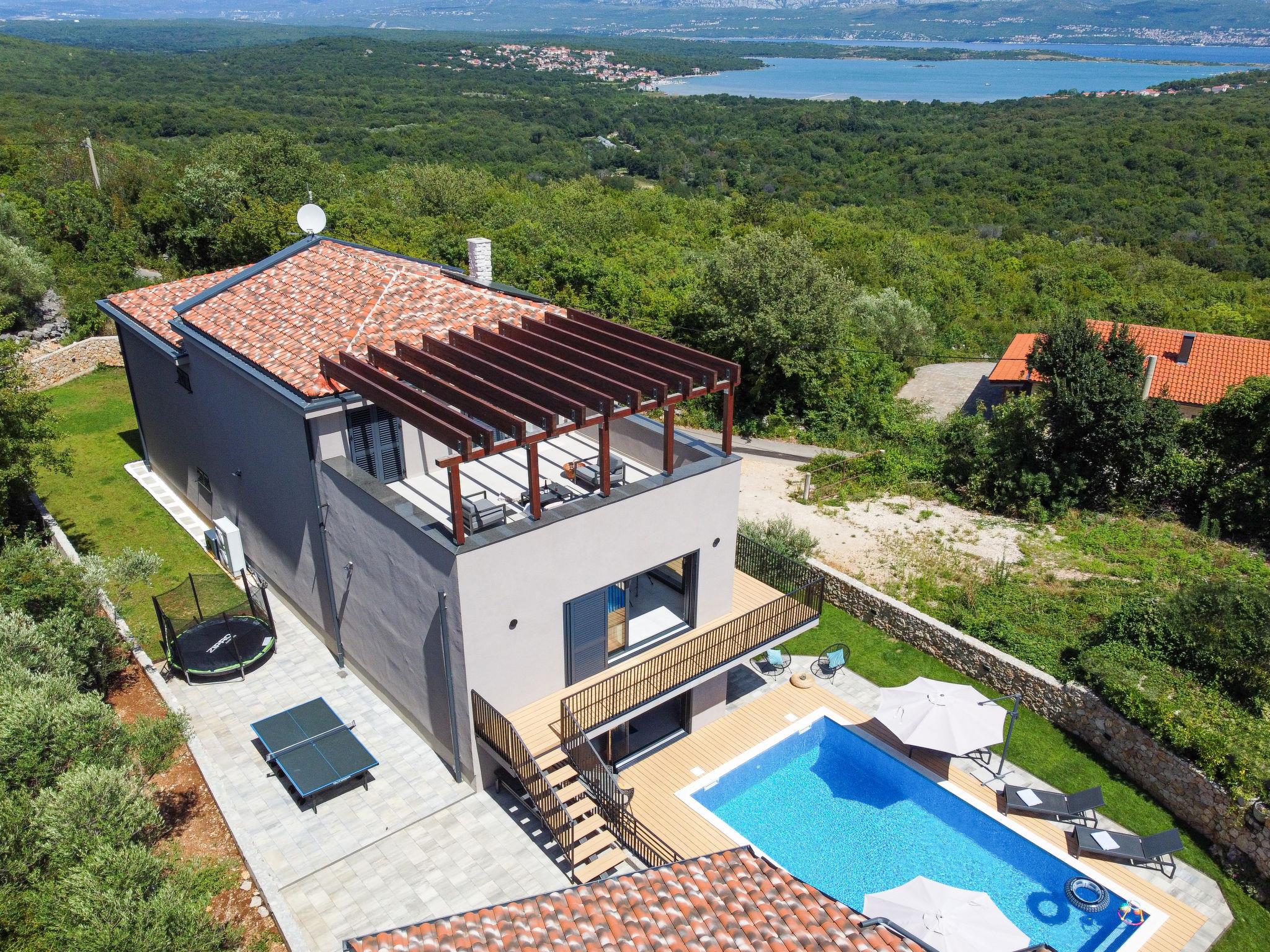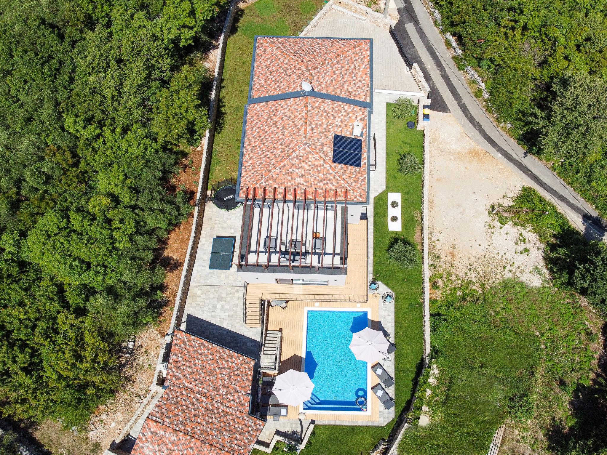 Klanice: Beautiful villa "Le Maris", 3 storeys, built in 2023. 4 km from the centre of Dobrinj, 6 km from the centre of Malinska, in a quiet, sunny, elevated position, 3.5 km from the sea, 3.5 km from the beach, in a cul-de-sac. Private: property 800 m2 (fenced), well-kept garden with lawn, swimming pool, indoor pool heated (8 m2, depth 130 cm, seasonal availability: 01.Jan. - 31.Dec.). Outdoor shower, table tennis, badminton, barbecue, pool maintenance by the owner/gardener. In the house: internet access, sauna, fitness room, hot tub (all included), trampoline, roof terrace, central heating system, air conditioning, washing machine, tumble dryer. Parking (for 3 cars) at the house on the premises. Shop 200 m, supermarket 6 km, restaurant 2 km, bus stop 5 km, sandy beach "Cižici" 3.5 km. Groups of teenagers on request only. Please note: airfield 15 km from the property. Private: swimming pool (30m2, depth: 1,50m ,angular, heated, available 01.04.- 15.10.).