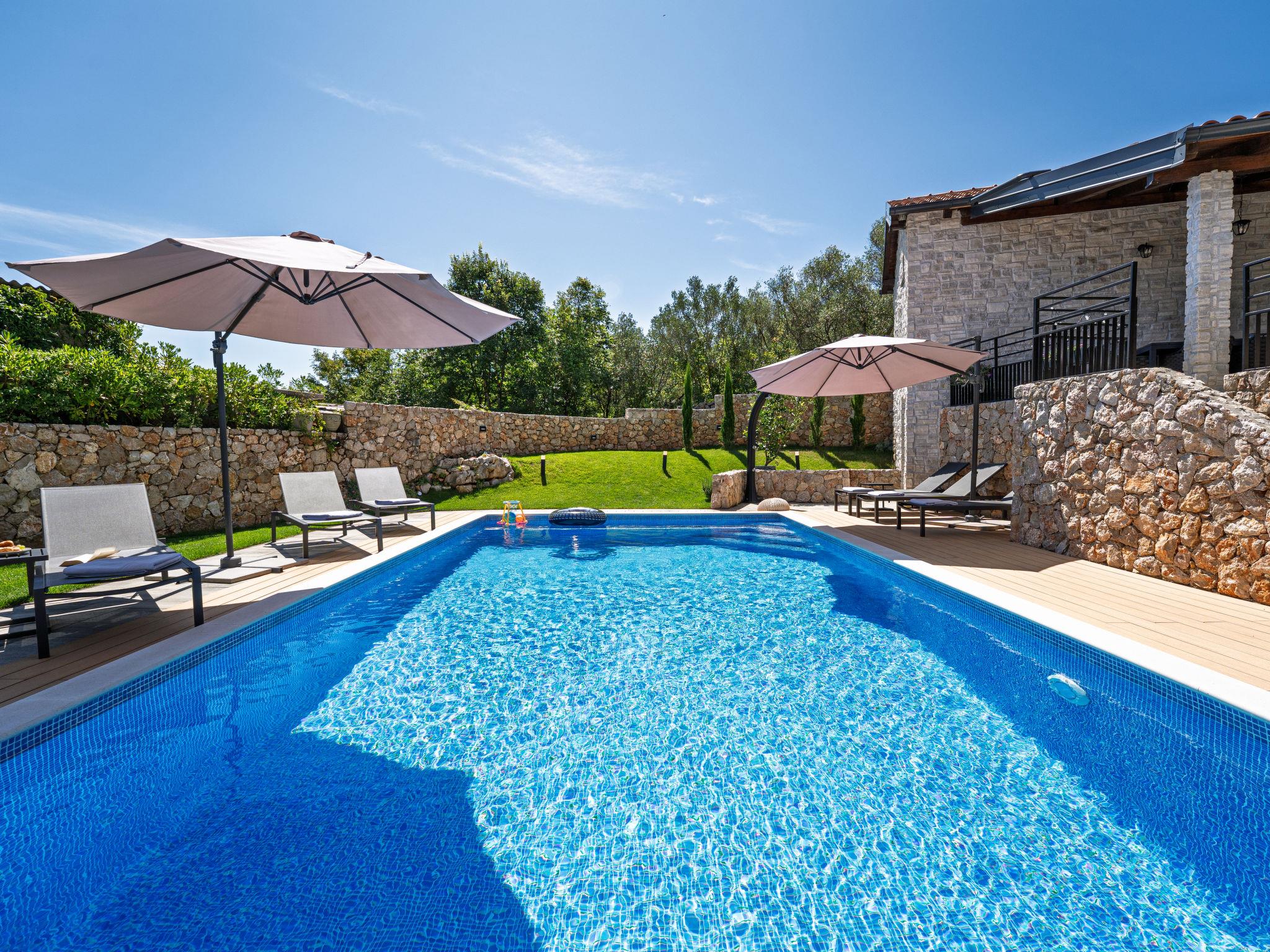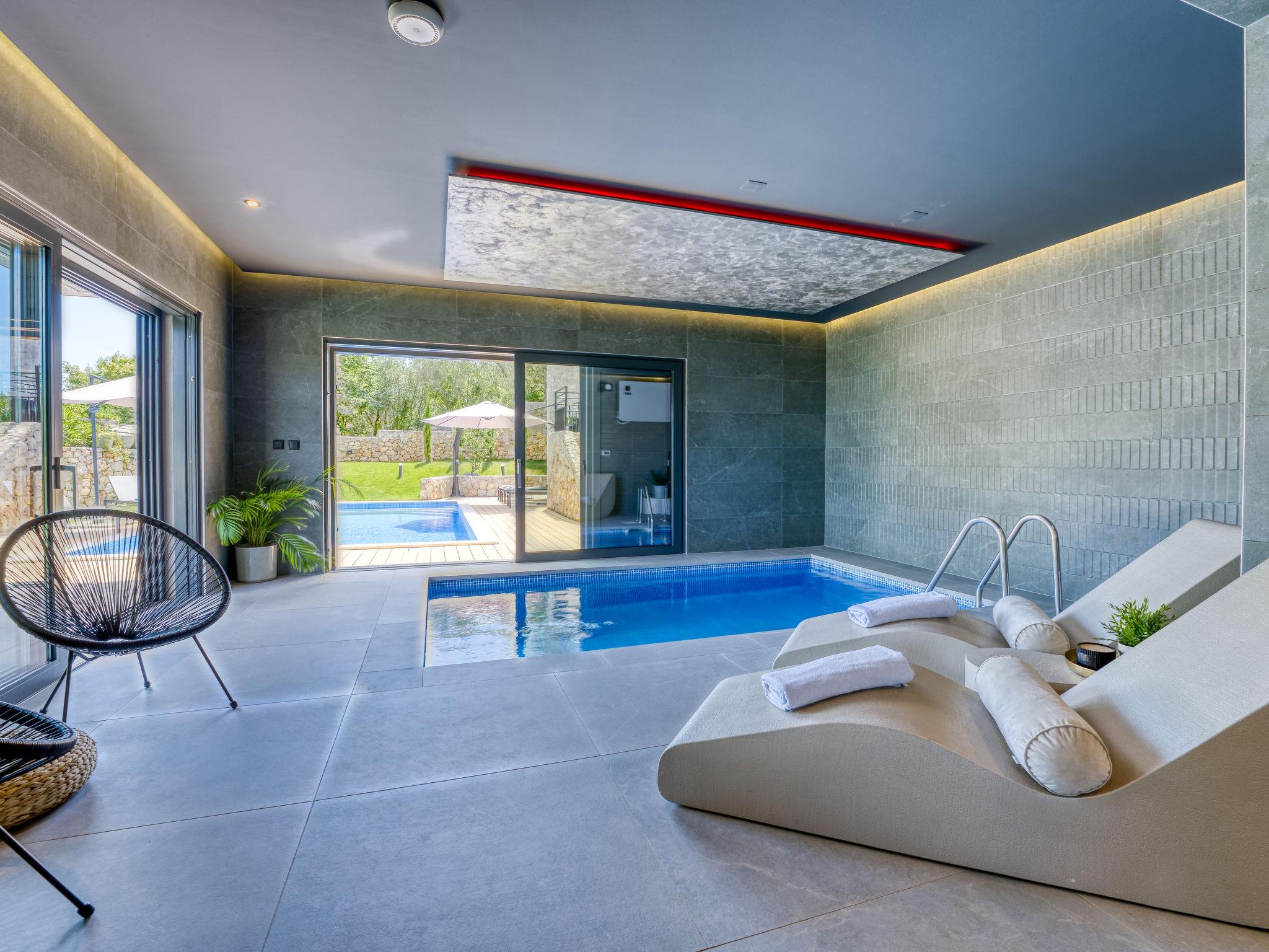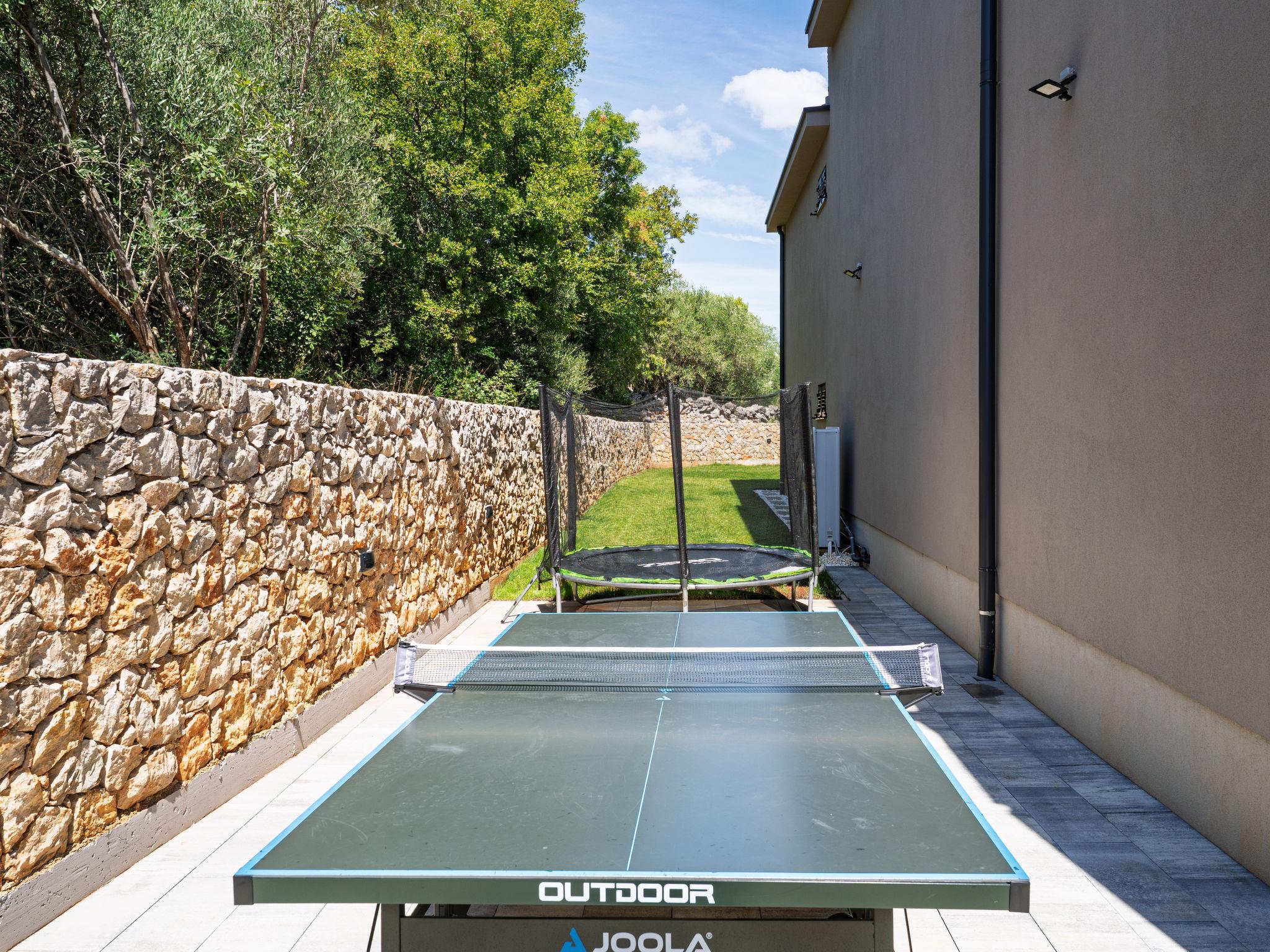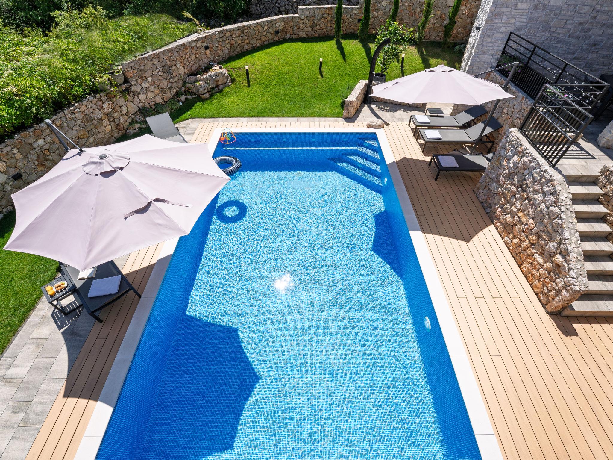 Klanice: Beautiful villa "Le Maris", 3 storeys, built in 2023. 4 km from the centre of Dobrinj, 6 km from the centre of Malinska, in a quiet, sunny, elevated position, 3.5 km from the sea, 3.5 km from the beach, in a cul-de-sac. Private: property 800 m2 (fenced), well-kept garden with lawn, swimming pool, indoor pool heated (8 m2, depth 130 cm, seasonal availability: 01.Jan. - 31.Dec.). Outdoor shower, table tennis, badminton, barbecue, pool maintenance by the owner/gardener. In the house: internet access, sauna, fitness room, hot tub (all included), trampoline, roof terrace, central heating system, air conditioning, washing machine, tumble dryer. Parking (for 3 cars) at the house on the premises. Shop 200 m, supermarket 6 km, restaurant 2 km, bus stop 5 km, sandy beach "Cižici" 3.5 km. Groups of teenagers on request only. Please note: airfield 15 km from the property. Private: swimming pool (30m2, depth: 1,50m ,angular, heated, available 01.04.- 15.10.).