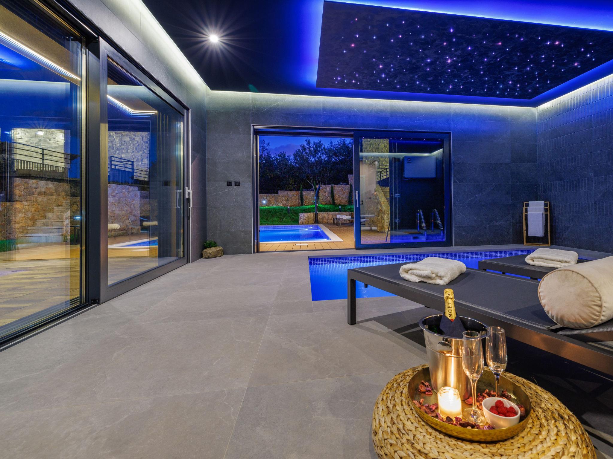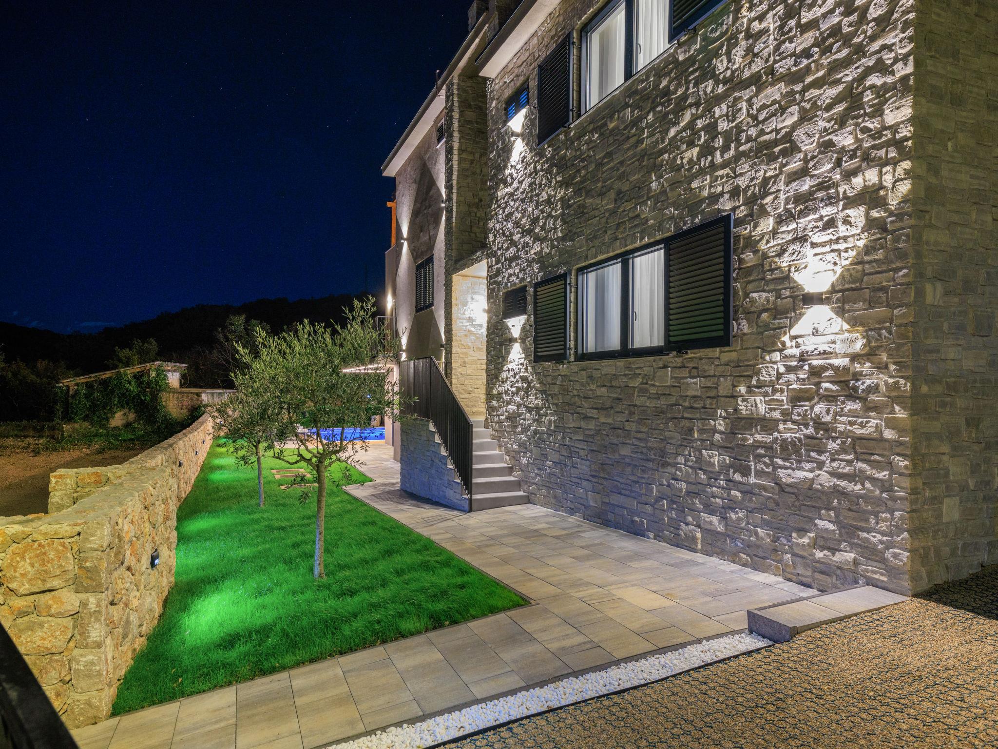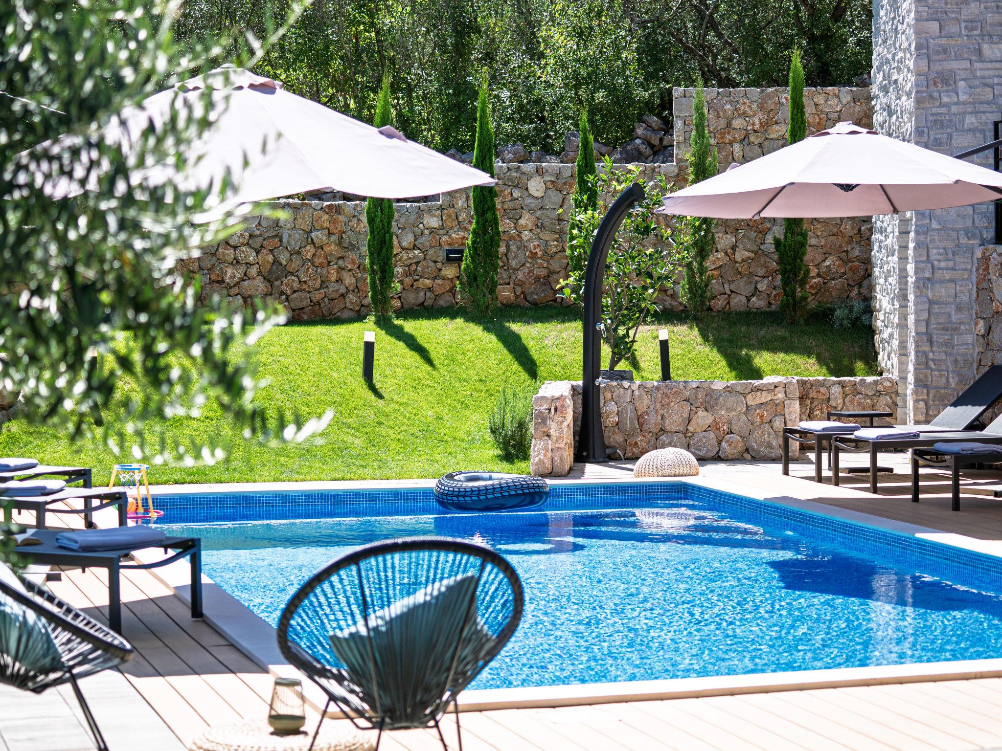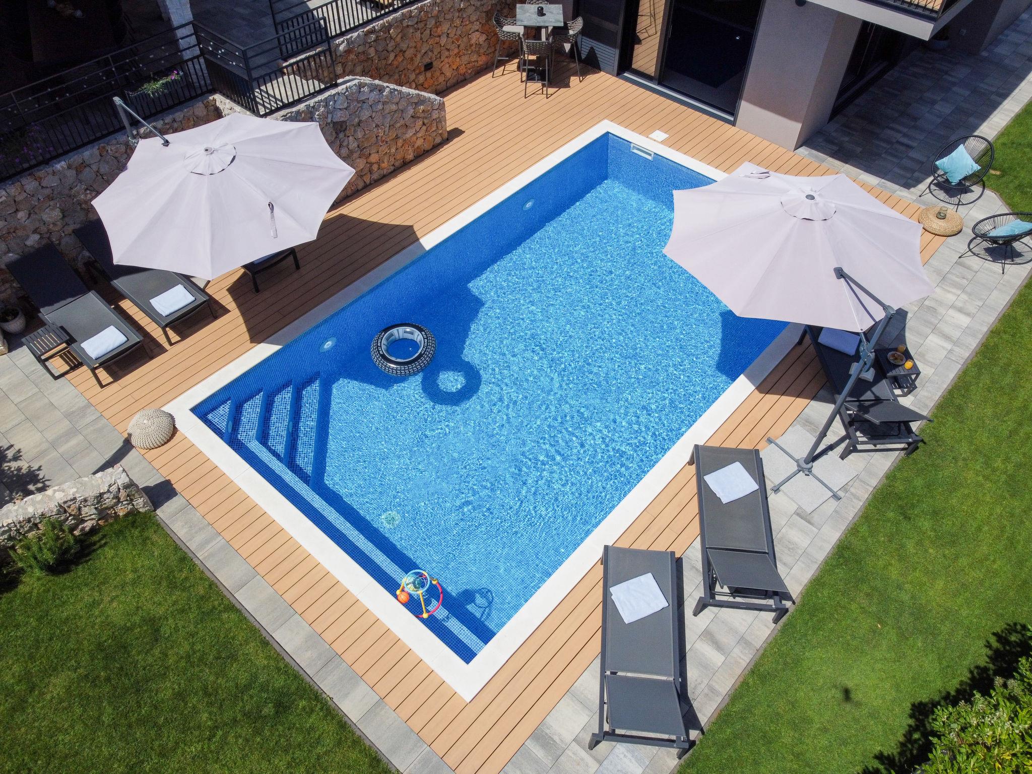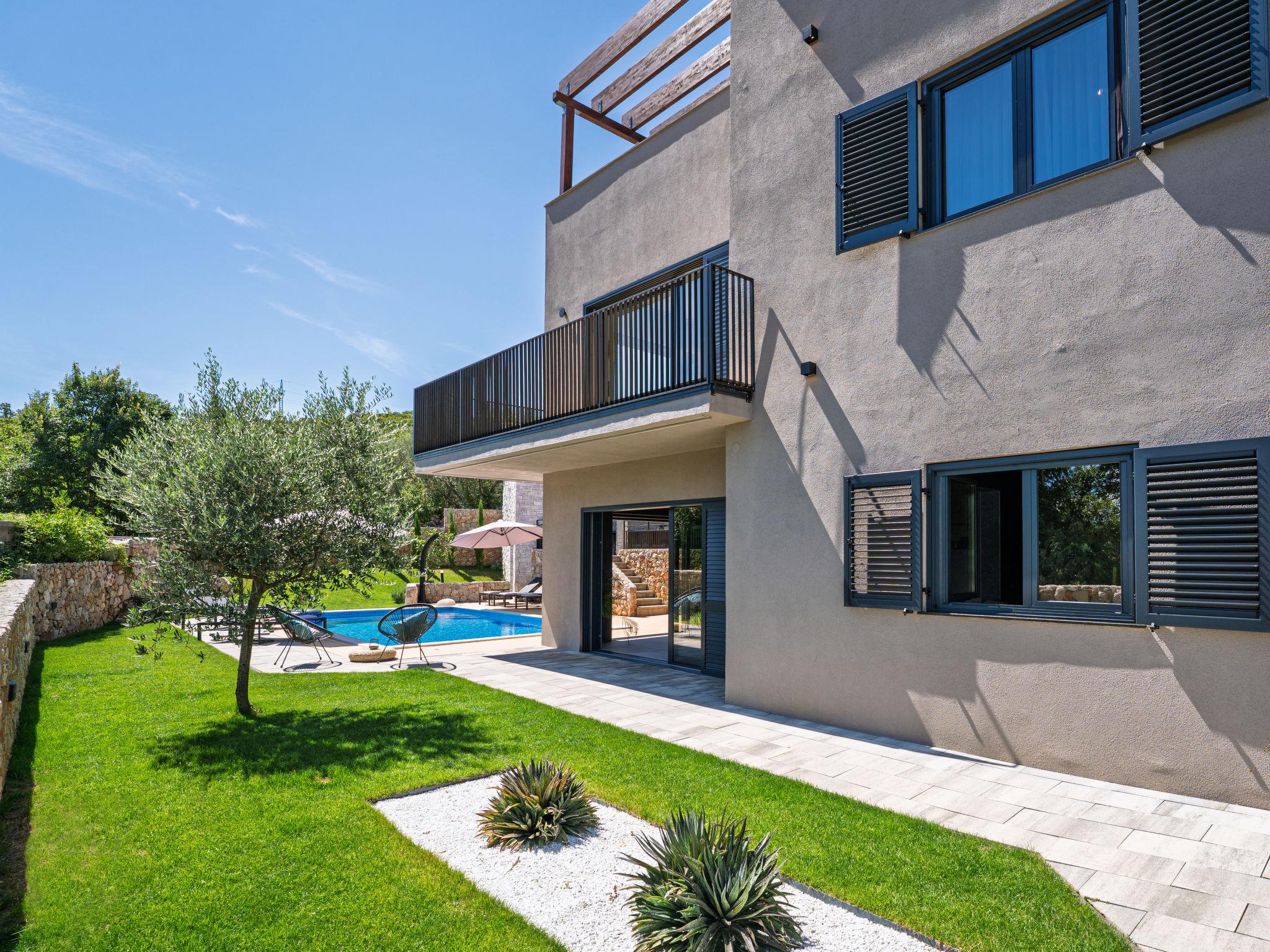 Klanice: Beautiful villa "Le Maris", 3 storeys, built in 2023. 4 km from the centre of Dobrinj, 6 km from the centre of Malinska, in a quiet, sunny, elevated position, 3.5 km from the sea, 3.5 km from the beach, in a cul-de-sac. Private: property 800 m2 (fenced), well-kept garden with lawn, swimming pool, indoor pool heated (8 m2, depth 130 cm, seasonal availability: 01.Jan. - 31.Dec.). Outdoor shower, table tennis, badminton, barbecue, pool maintenance by the owner/gardener. In the house: internet access, sauna, fitness room, hot tub (all included), trampoline, roof terrace, central heating system, air conditioning, washing machine, tumble dryer. Parking (for 3 cars) at the house on the premises. Shop 200 m, supermarket 6 km, restaurant 2 km, bus stop 5 km, sandy beach "Cižici" 3.5 km. Groups of teenagers on request only. Please note: airfield 15 km from the property. Private: swimming pool (30m2, depth: 1,50m ,angular, heated, available 01.04.- 15.10.).