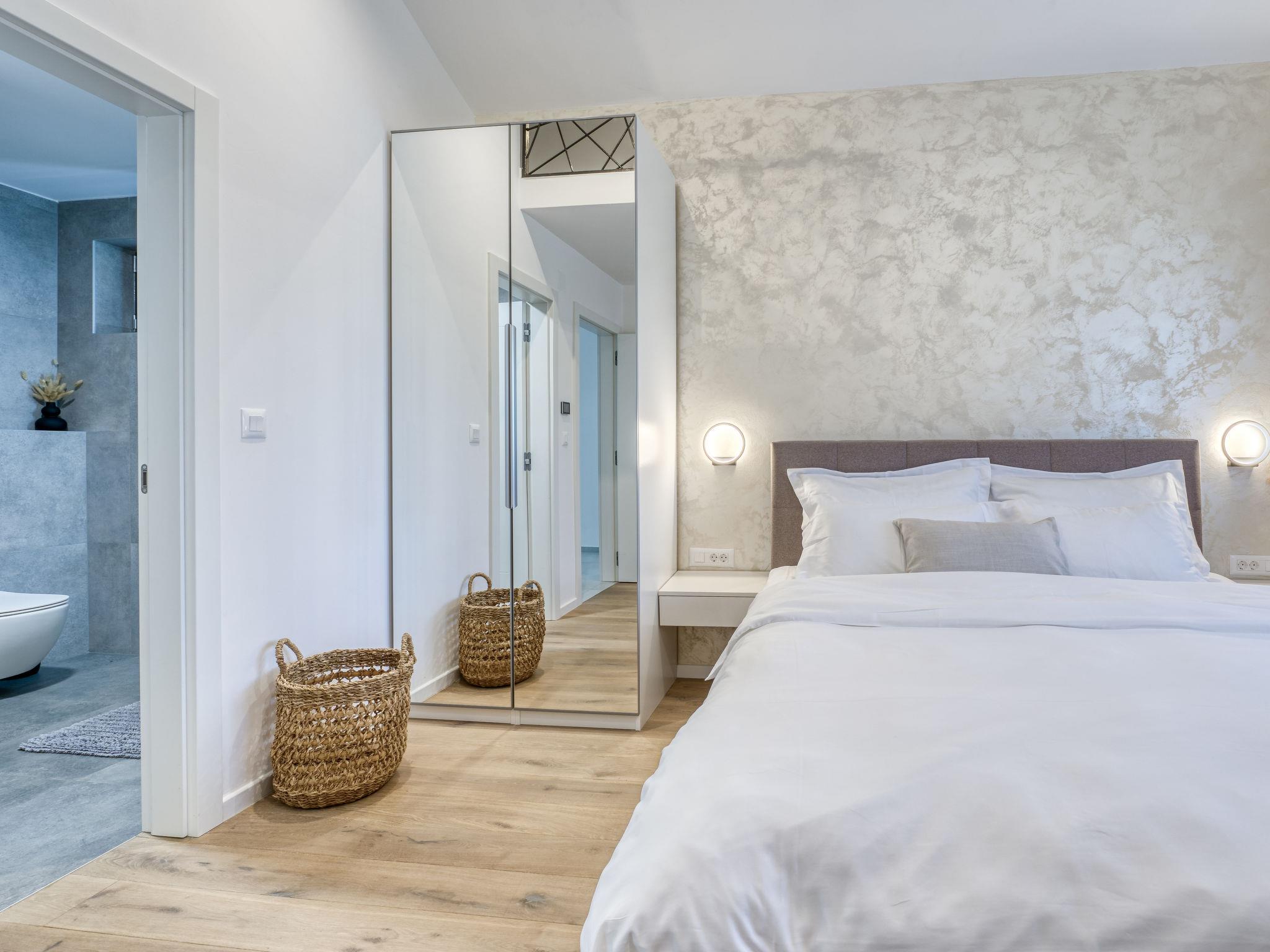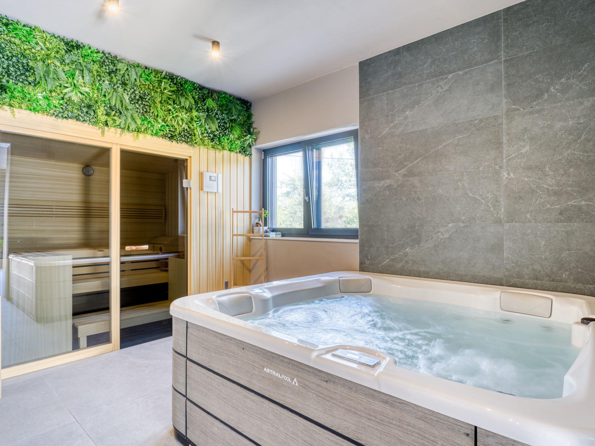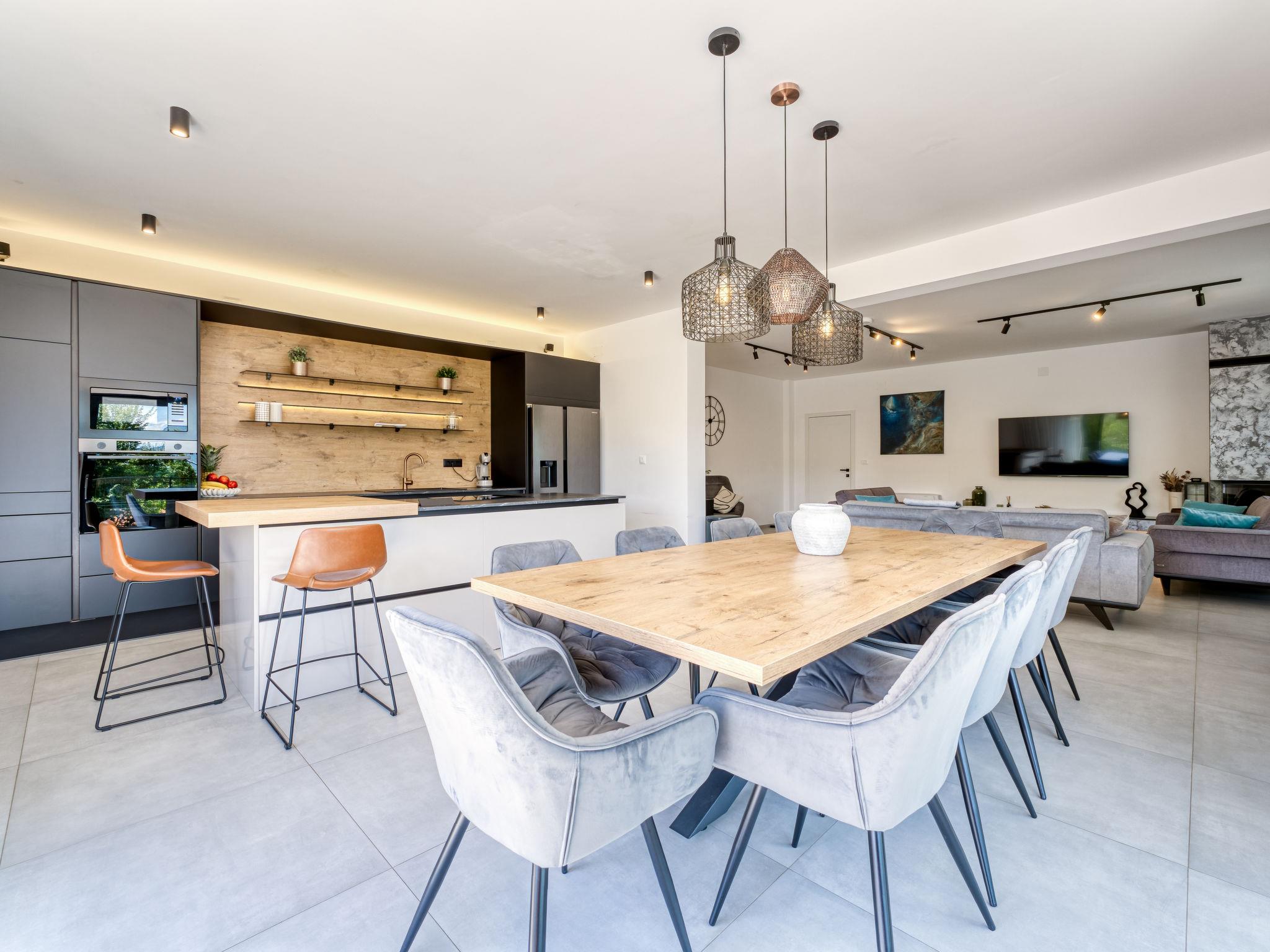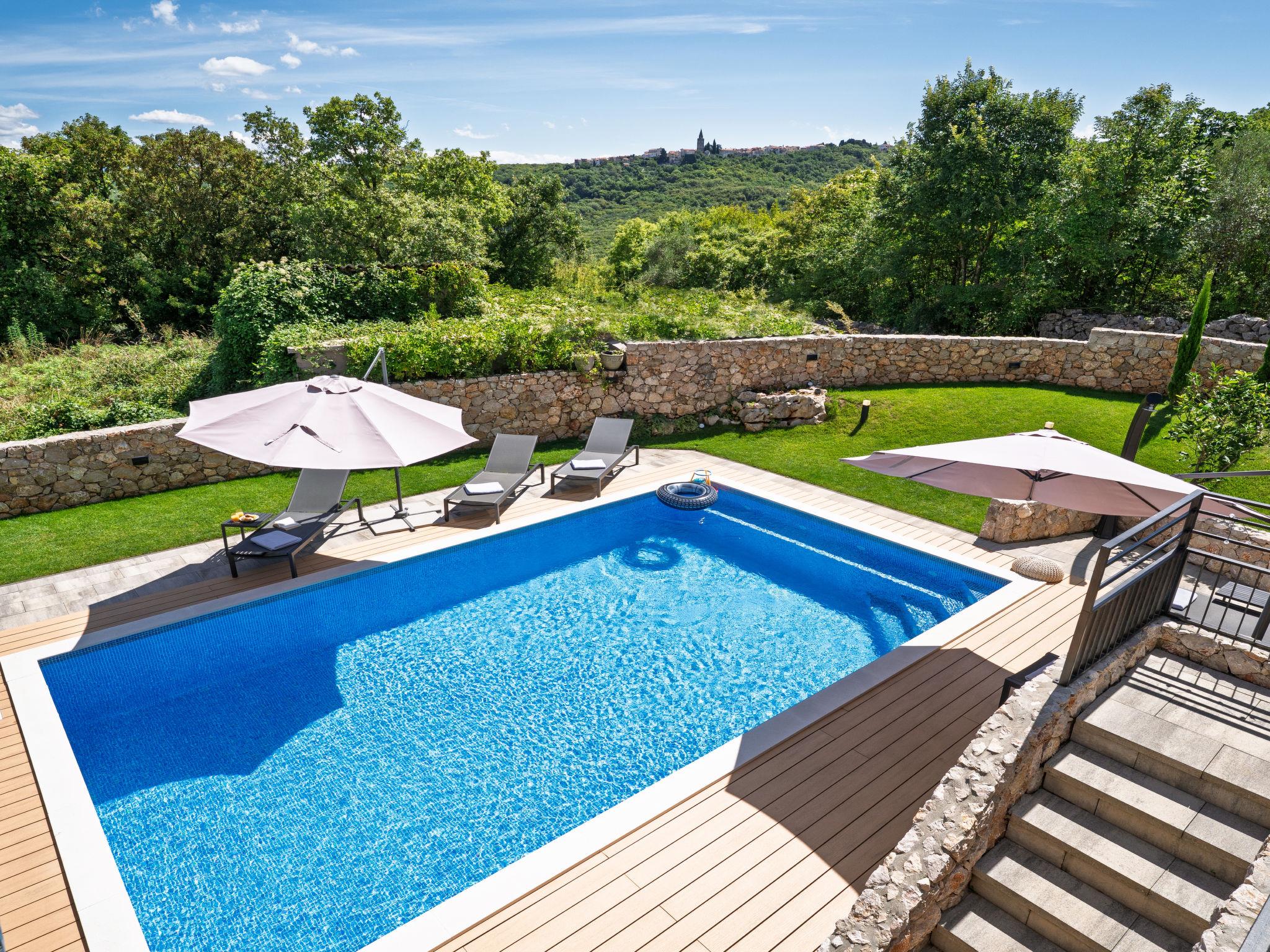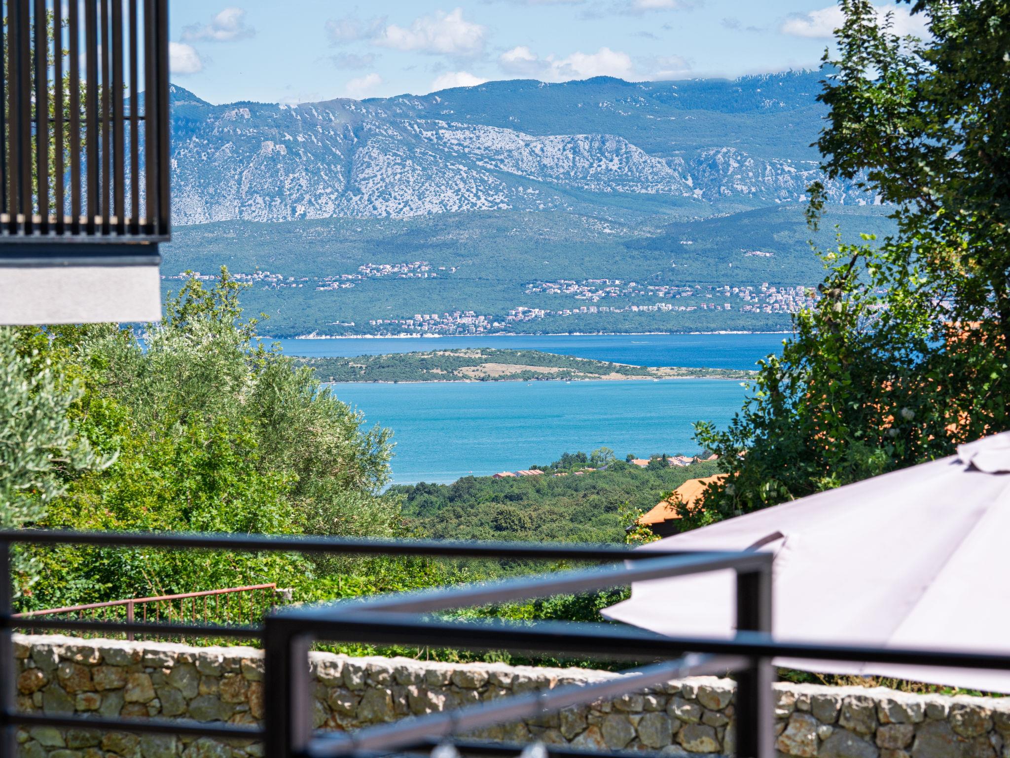 Klanice: Beautiful villa "Le Maris", 3 storeys, built in 2023. 4 km from the centre of Dobrinj, 6 km from the centre of Malinska, in a quiet, sunny, elevated position, 3.5 km from the sea, 3.5 km from the beach, in a cul-de-sac. Private: property 800 m2 (fenced), well-kept garden with lawn, swimming pool, indoor pool heated (8 m2, depth 130 cm, seasonal availability: 01.Jan. - 31.Dec.). Outdoor shower, table tennis, badminton, barbecue, pool maintenance by the owner/gardener. In the house: internet access, sauna, fitness room, hot tub (all included), trampoline, roof terrace, central heating system, air conditioning, washing machine, tumble dryer. Parking (for 3 cars) at the house on the premises. Shop 200 m, supermarket 6 km, restaurant 2 km, bus stop 5 km, sandy beach "Cižici" 3.5 km. Groups of teenagers on request only. Please note: airfield 15 km from the property. Private: swimming pool (30m2, depth: 1,50m ,angular, heated, available 01.04.- 15.10.).