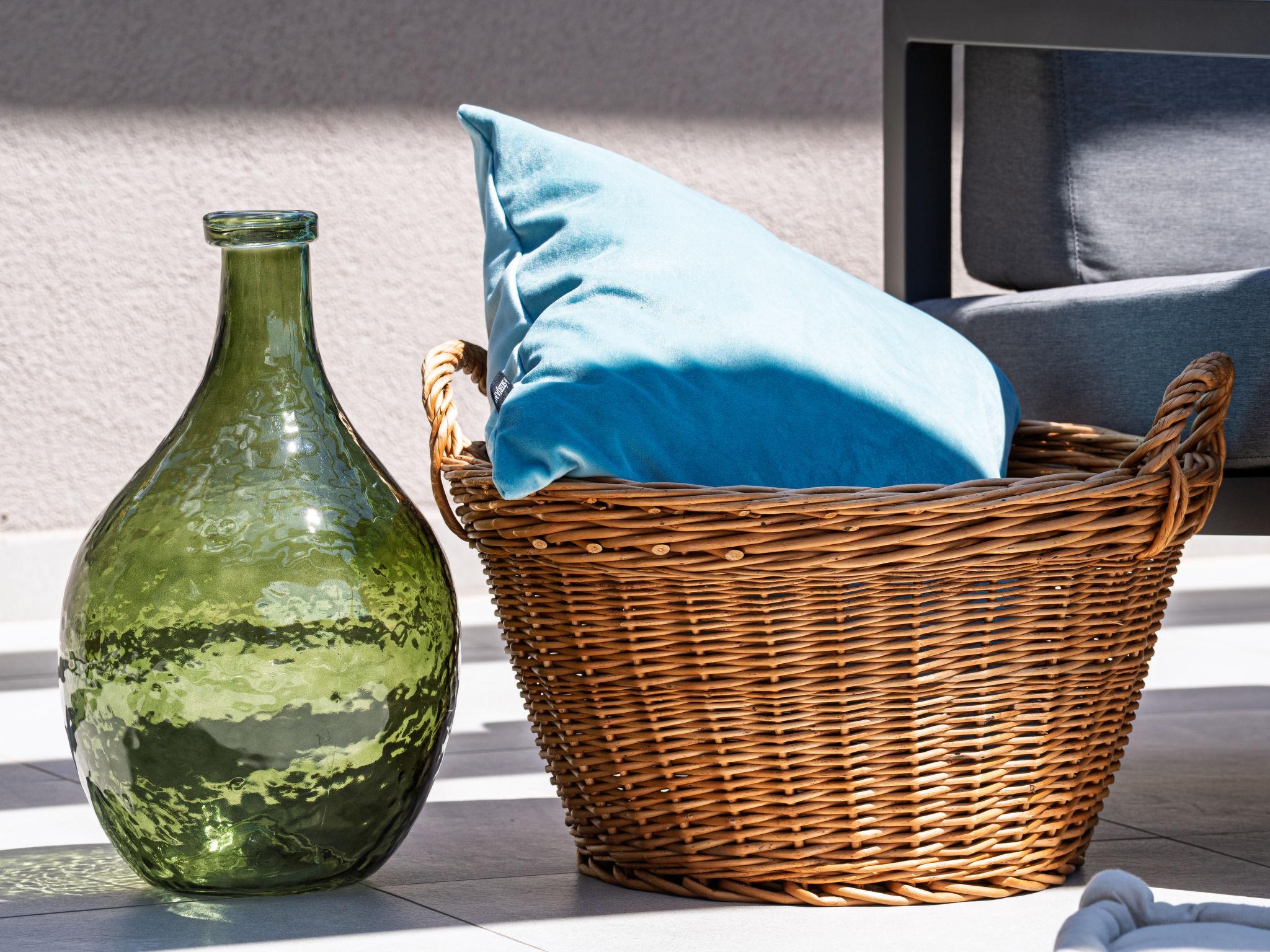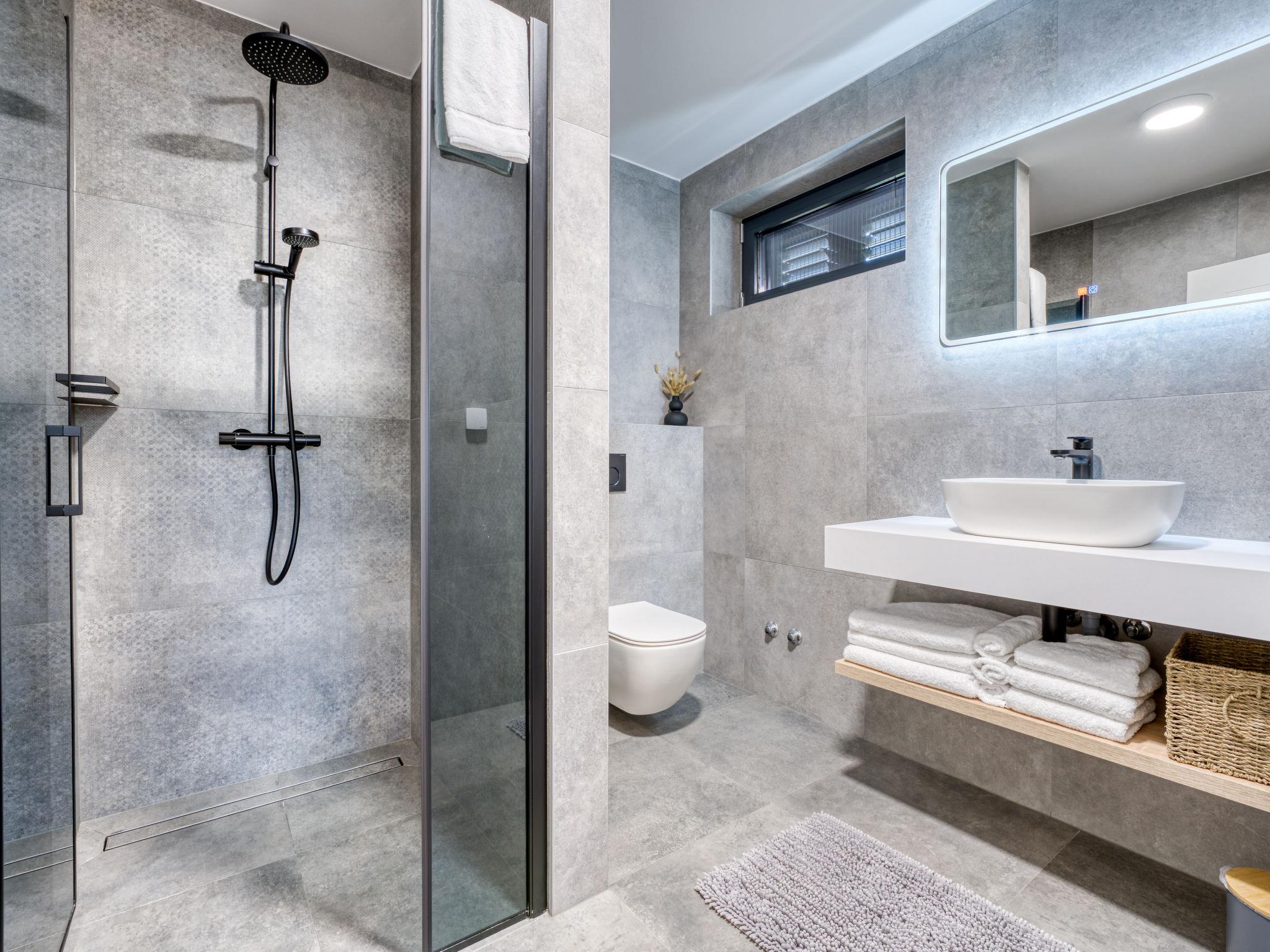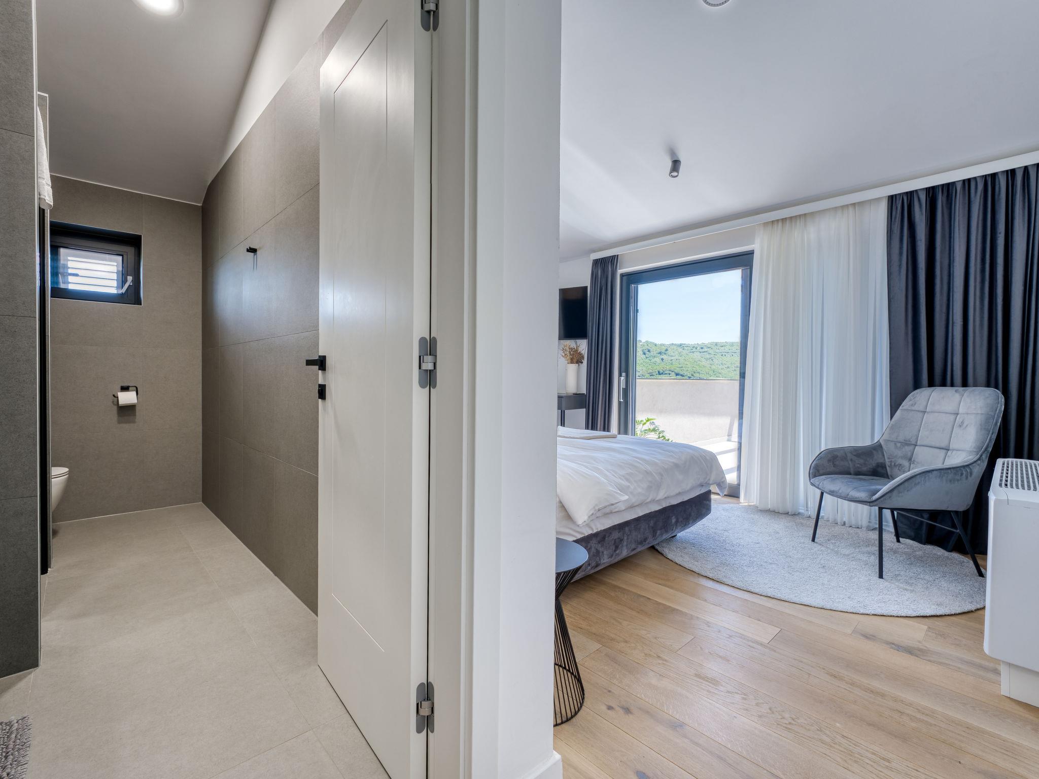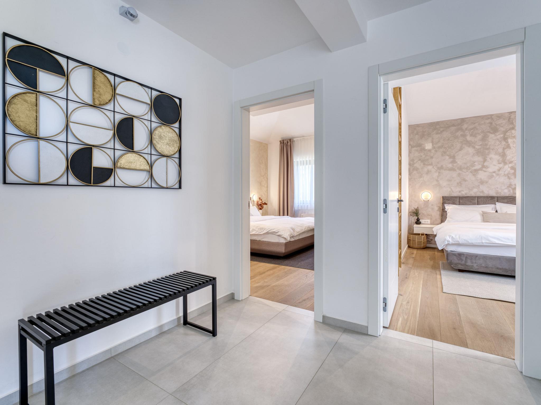Klanice: Beautiful villa "Le Maris", 3 storeys, built in 2023. 4 km from the centre of Dobrinj, 6 km from the centre of Malinska, in a quiet, sunny, elevated position, 3.5 km from the sea, 3.5 km from the beach, in a cul-de-sac. Private: property 800 m2 (fenced), well-kept garden with lawn, swimming pool, indoor pool heated (8 m2, depth 130 cm, seasonal availability: 01.Jan. - 31.Dec.). Outdoor shower, table tennis, badminton, barbecue, pool maintenance by the owner/gardener. In the house: internet access, sauna, fitness room, hot tub (all included), trampoline, roof terrace, central heating system, air conditioning, washing machine, tumble dryer. Parking (for 3 cars) at the house on the premises. Shop 200 m, supermarket 6 km, restaurant 2 km, bus stop 5 km, sandy beach "Cižici" 3.5 km. Groups of teenagers on request only. Please note: airfield 15 km from the property. Private: swimming pool (30m2, depth: 1,50m ,angular, heated, available 01.04.- 15.10.).