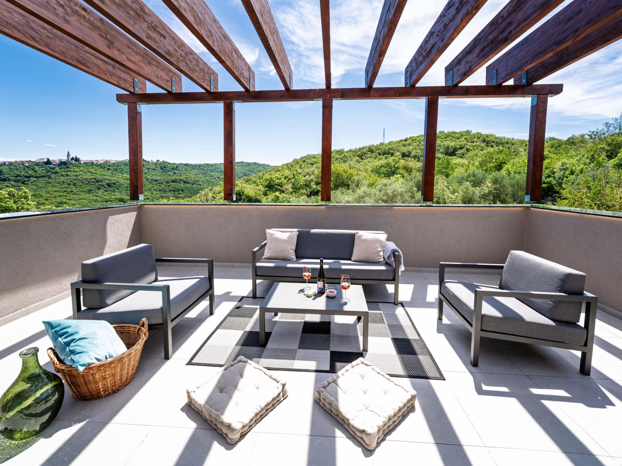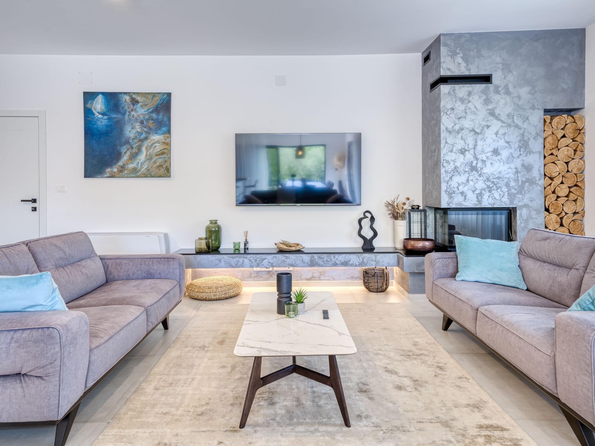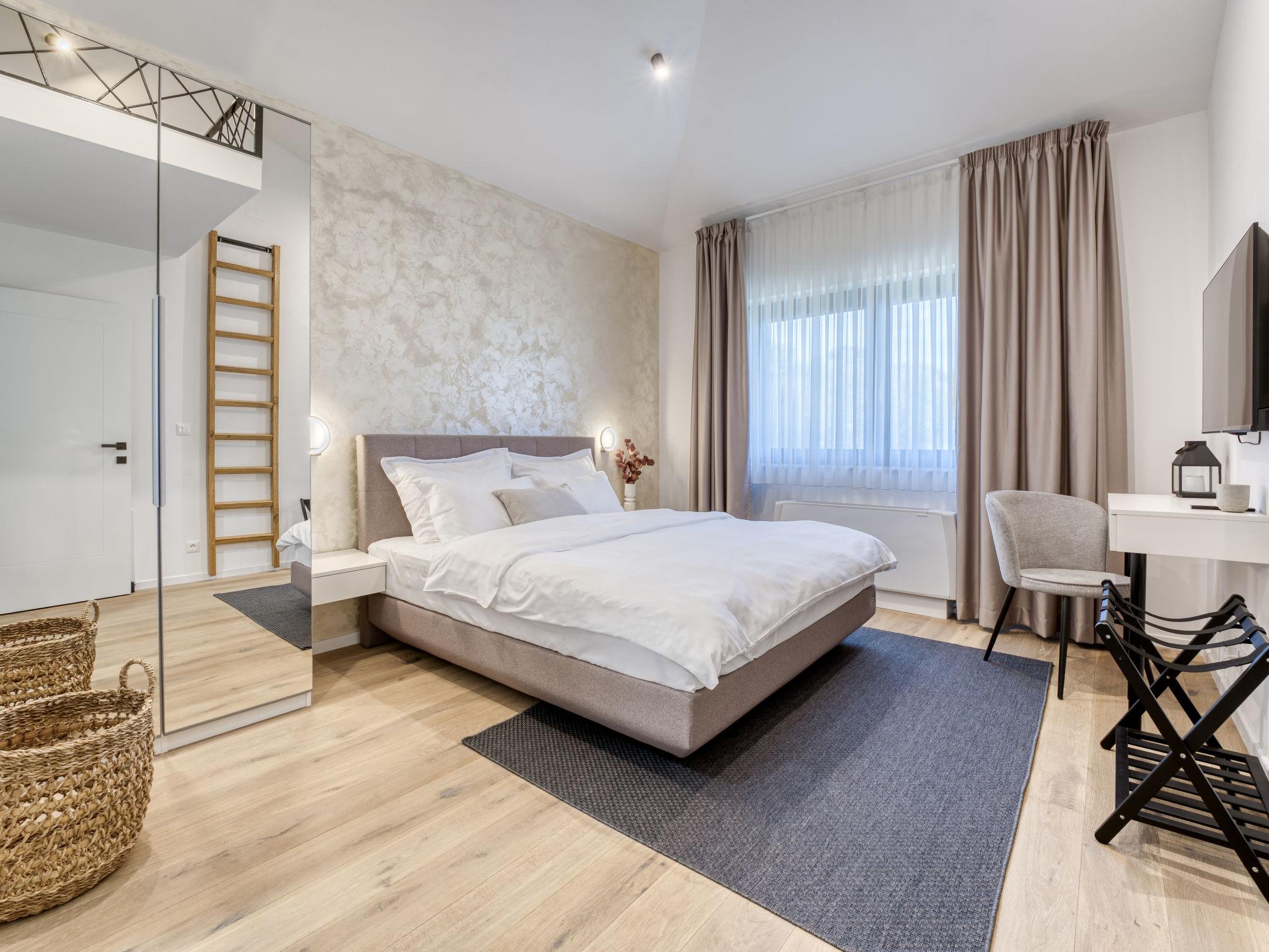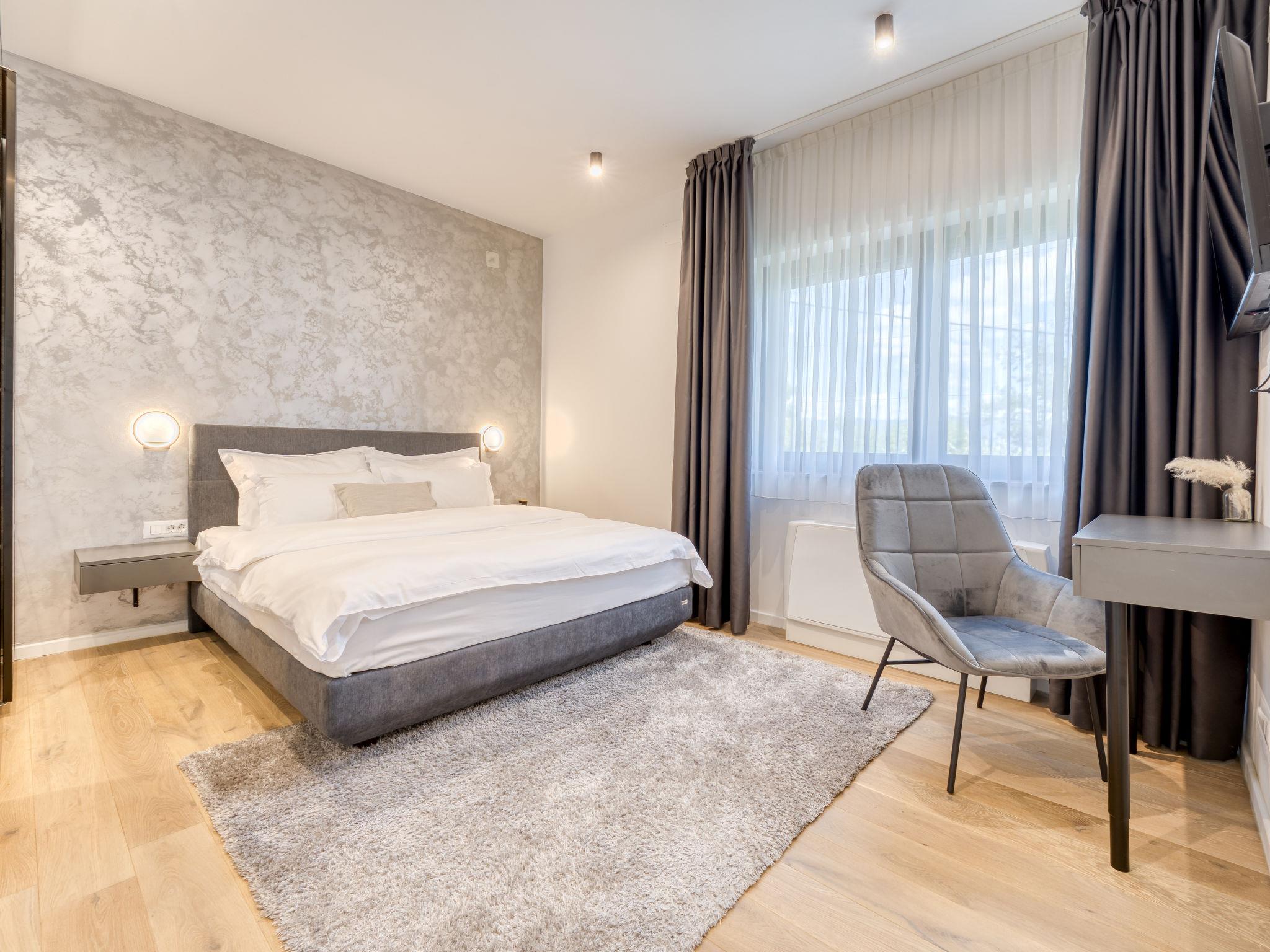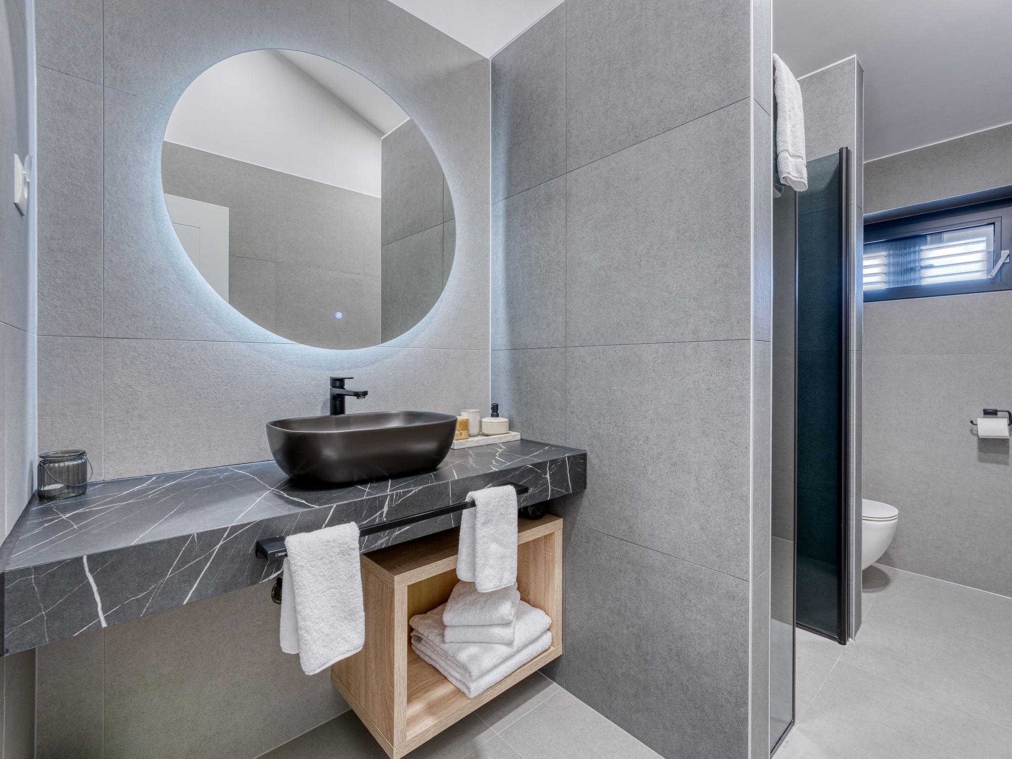 Klanice: Beautiful villa "Le Maris", 3 storeys, built in 2023. 4 km from the centre of Dobrinj, 6 km from the centre of Malinska, in a quiet, sunny, elevated position, 3.5 km from the sea, 3.5 km from the beach, in a cul-de-sac. Private: property 800 m2 (fenced), well-kept garden with lawn, swimming pool, indoor pool heated (8 m2, depth 130 cm, seasonal availability: 01.Jan. - 31.Dec.). Outdoor shower, table tennis, badminton, barbecue, pool maintenance by the owner/gardener. In the house: internet access, sauna, fitness room, hot tub (all included), trampoline, roof terrace, central heating system, air conditioning, washing machine, tumble dryer. Parking (for 3 cars) at the house on the premises. Shop 200 m, supermarket 6 km, restaurant 2 km, bus stop 5 km, sandy beach "Cižici" 3.5 km. Groups of teenagers on request only. Please note: airfield 15 km from the property. Private: swimming pool (30m2, depth: 1,50m ,angular, heated, available 01.04.- 15.10.).