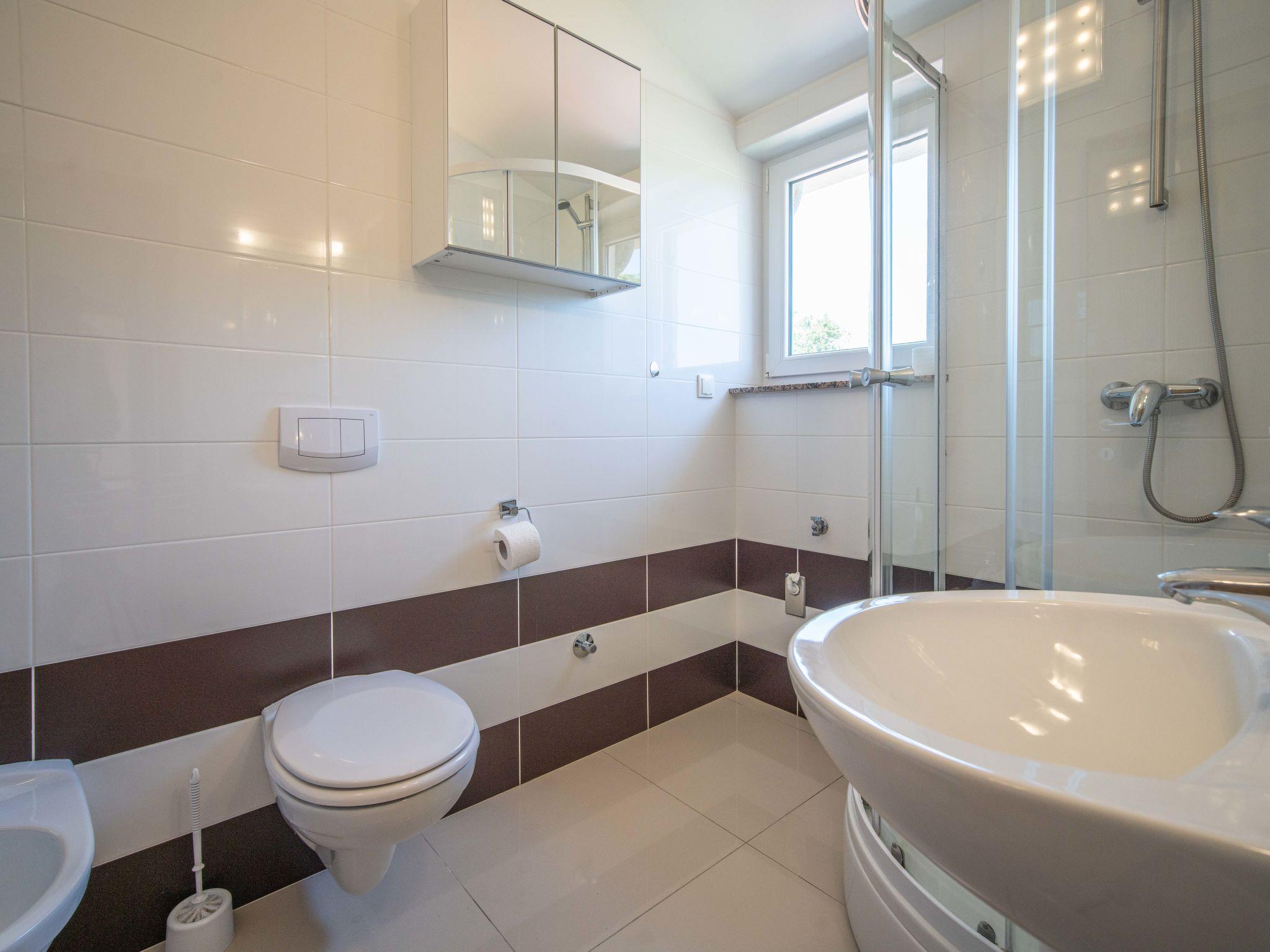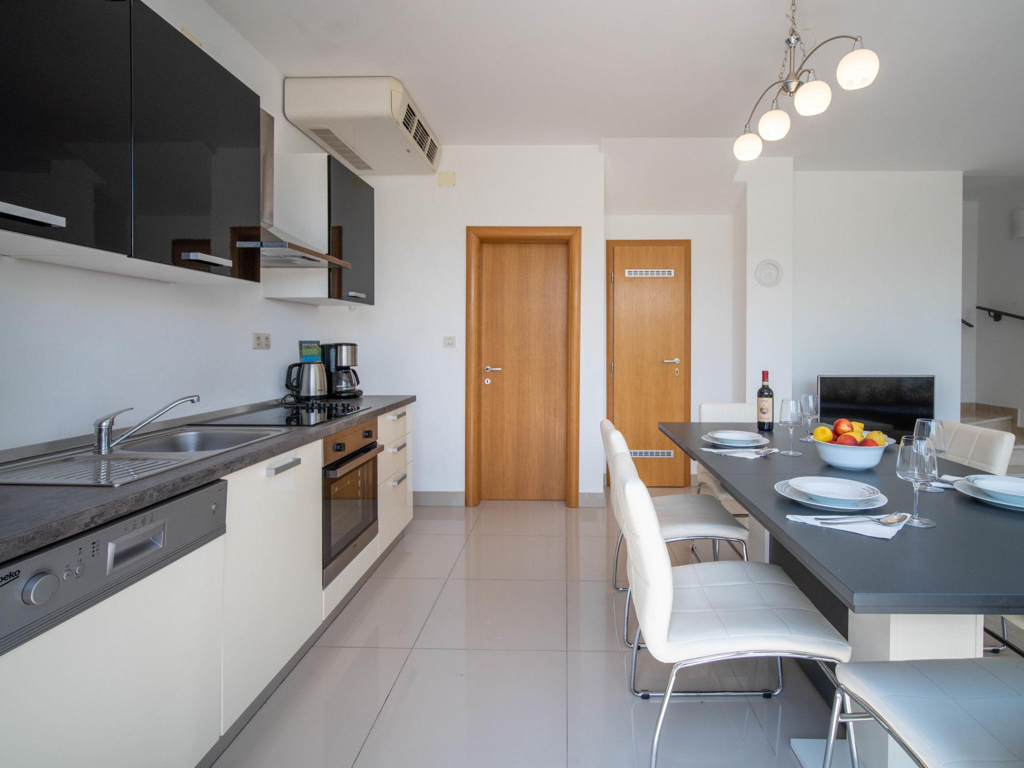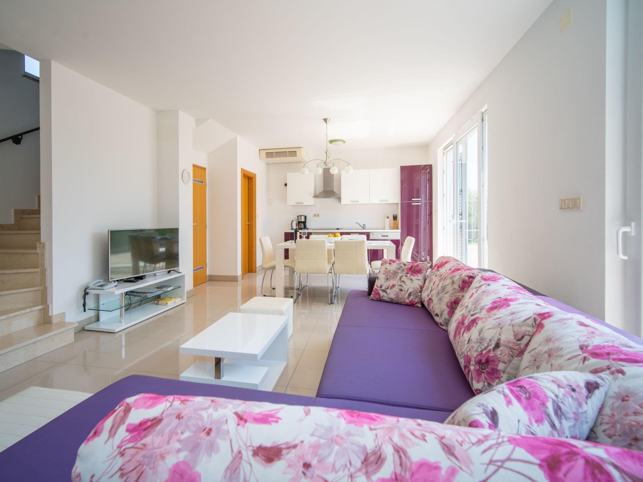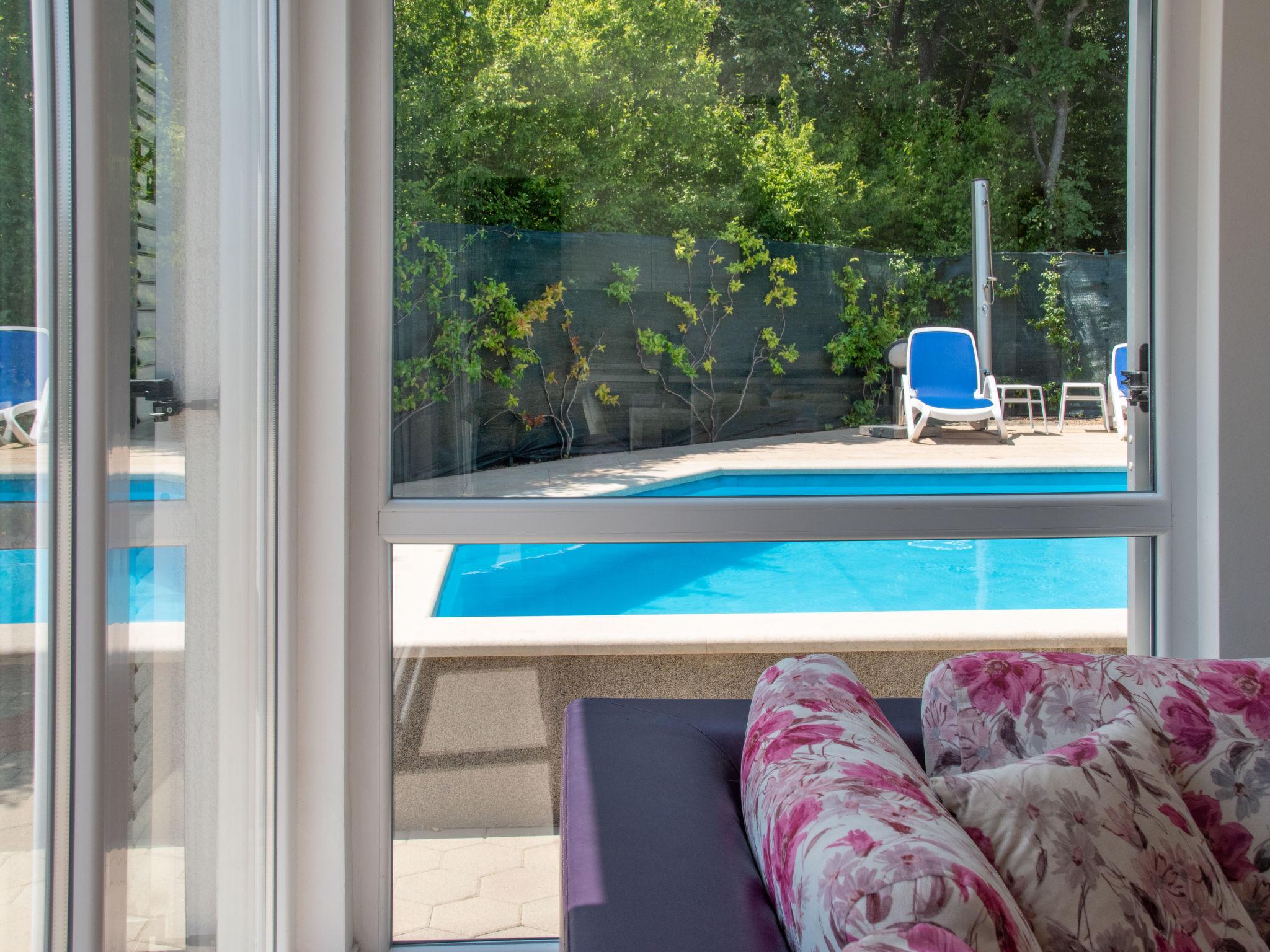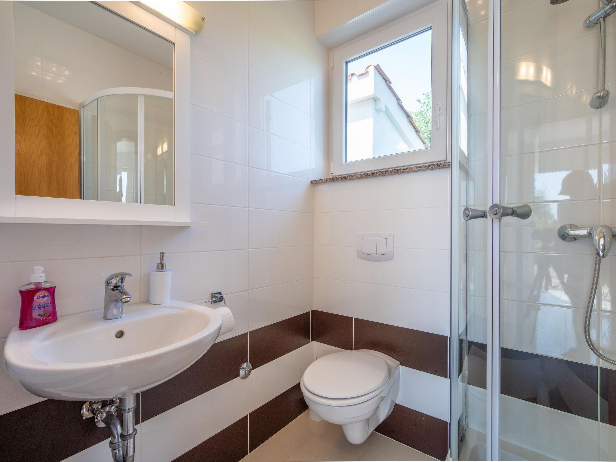 8-room house 150 m2 on 2 levels, south-east facing position. Living/dining room 30 m2 with kitchen corner and satellite TV (flat screen), air conditioning. Exit to the terrace. Living/dining room 30 m2 with satellite TV (flat screen), air conditioning. Exit to the terrace. Open kitchen (oven, dishwasher, 4 ceramic glass hob hotplates, freezer, electric coffee machine). 2 showers/WC. Upper floor: 2 rooms, each room with 1 french bed (160 cm, length 200 cm), air conditioning. Exit to the terrace. 2 rooms, each room with 1 french bed (160 cm, length 200 cm). 2 rooms, each room with 1 bed (90 cm, length 200 cm). Exit to the terrace. 2 showers/bidet/WC. Forced-air heating. 2 terraces 28 m2, 2 terraces 5 m2, roofed. Terrace furniture, deck chairs, box-room. View of the swimming pool and the countryside. Facilities: safe, baby cot. Internet (WiFi, free). Maximum 2 pets/ dogs allowed. Each house with living-dining area and open kitchen on the ground floor and 3 bedrooms on the upper floor. Rješenje br. 5343 od 20.07.2015