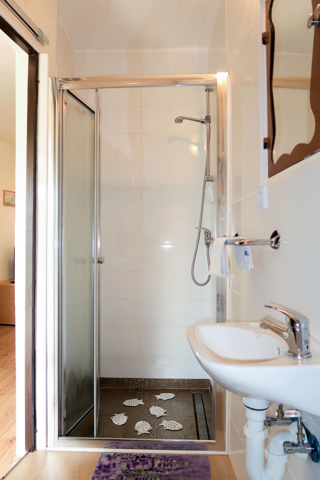 5-room terraced house 60 m2 on 2 levels. Living/dining room with satellite TV, electric heater and air conditioning. 1 room with 1 french bed. Open kitchen (1 hot plate, oven, dishwasher, 3 gas rings, toaster, kettle, microwave, electric coffee machine). Shower/WC. Upper floor: (exterior staircase) living room with satellite TV, DVD, electric heater and air conditioning. 1 room with 1 french bed (160 cm, length 200 cm). 1 room with 1 double bed. Shower/WC. No heating option. Balcony. Balcony furniture, deck chairs (8). Facilities: iron, baby cot. Internet (WiFi, free). Please note: non-smoking house. Maximum 2 pets/ dogs allowed. No internal connecting door between the floors.