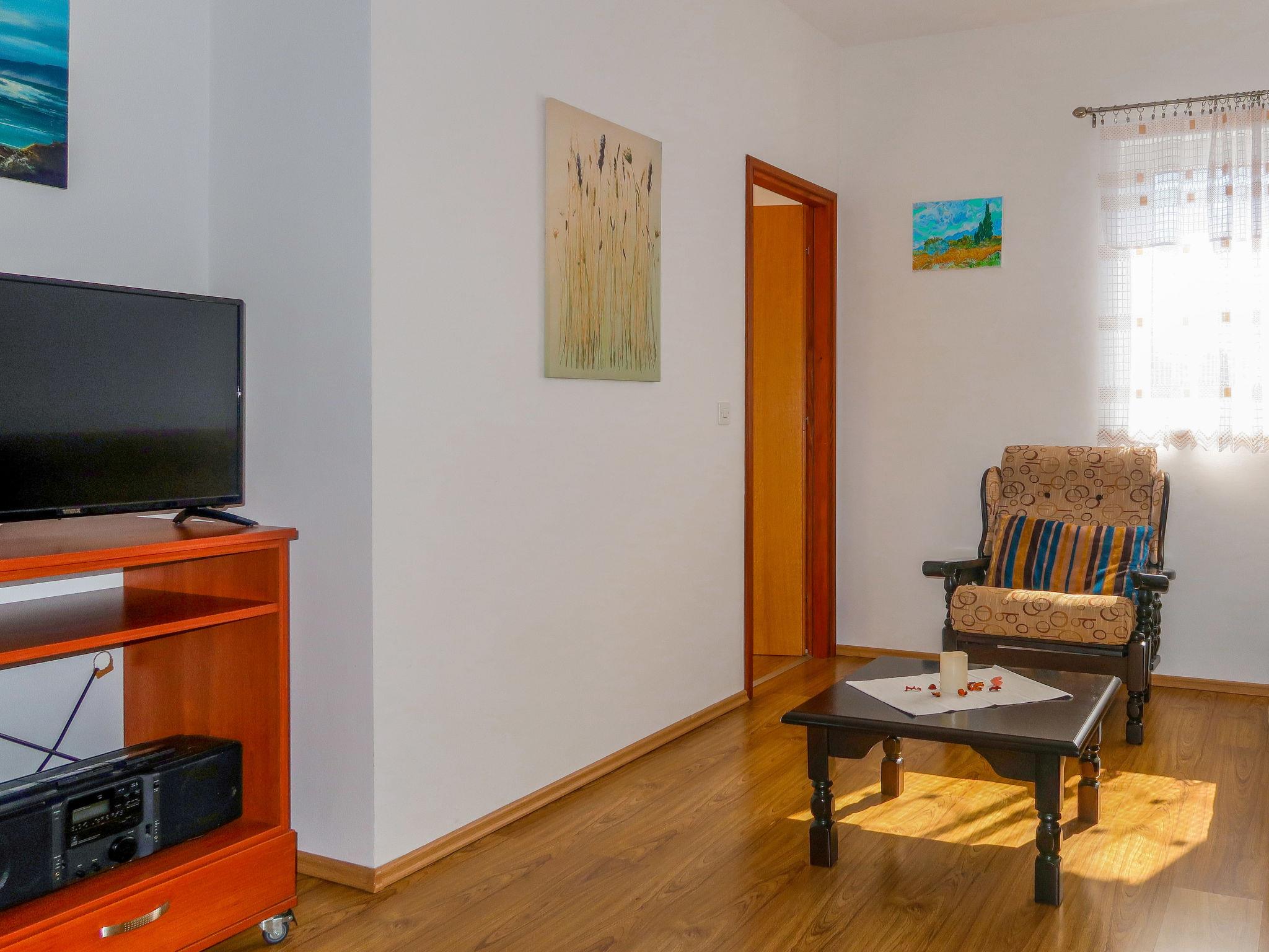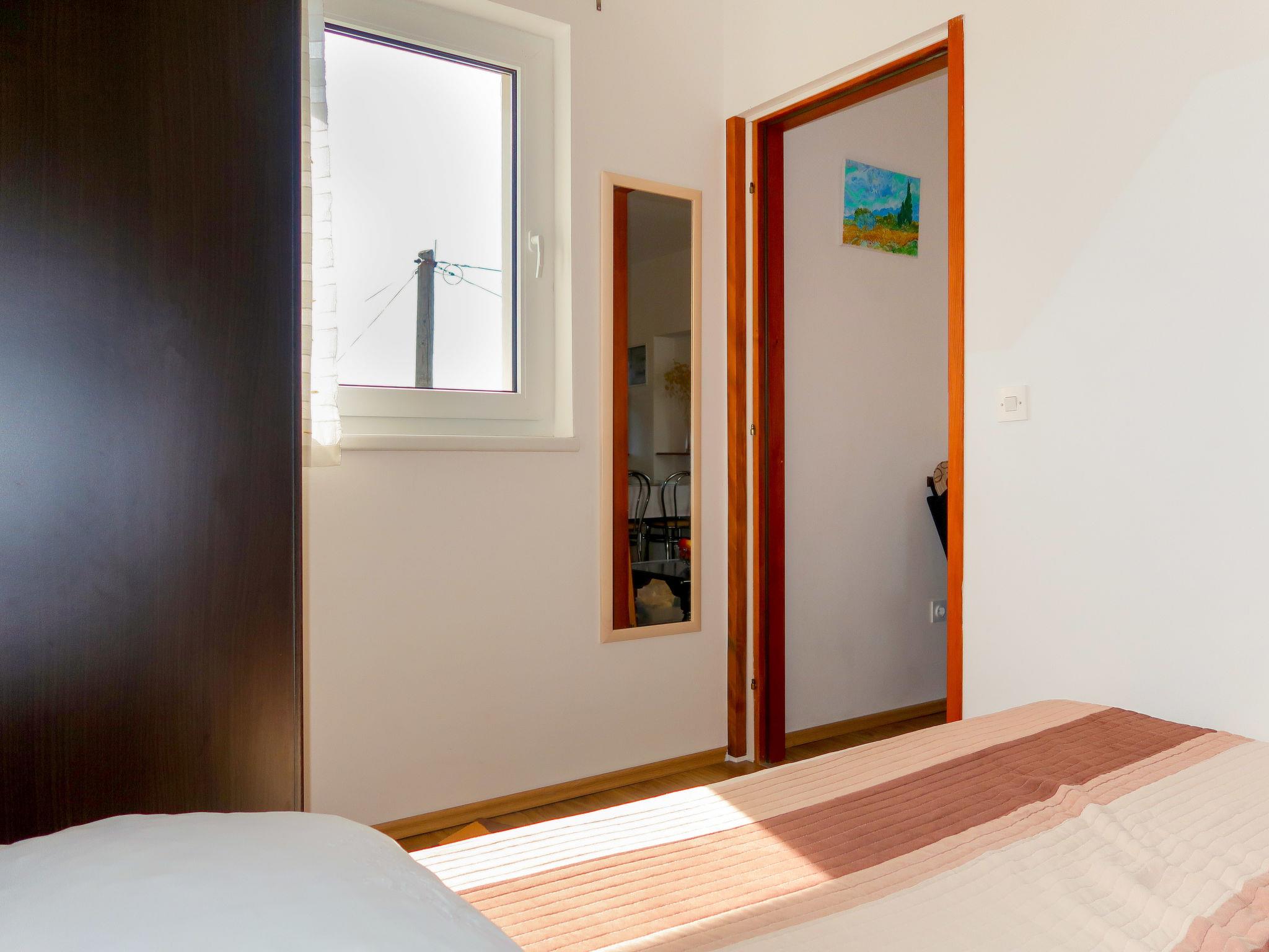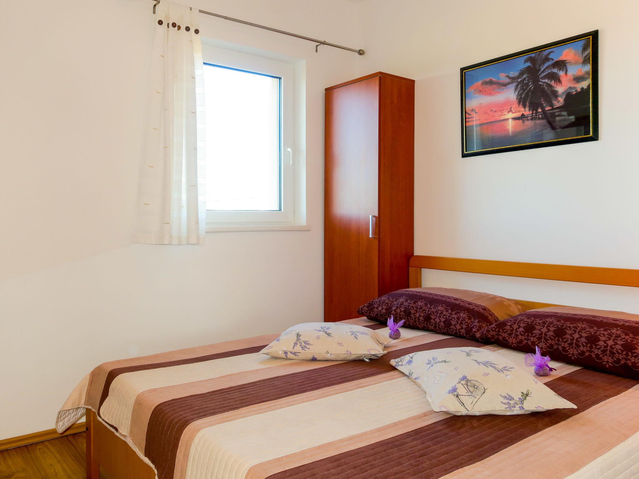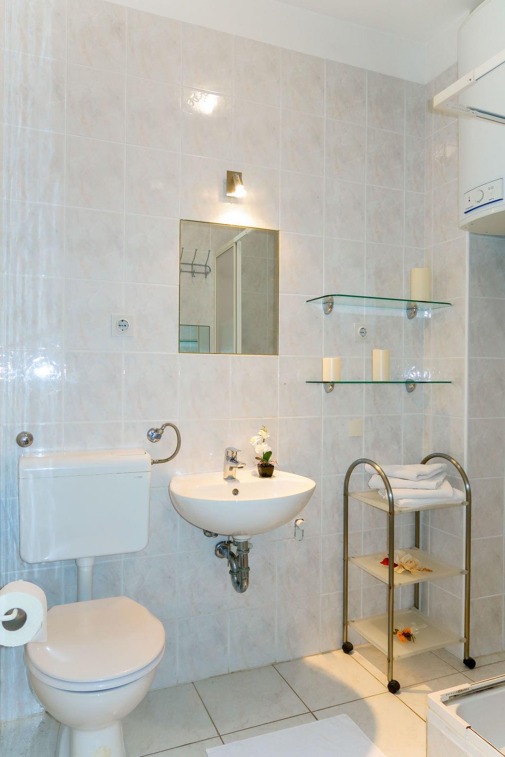 3-room apartment 45 m2 on 1st floor. Living/dining room with satellite TV and air conditioning. Exit to the terrace. 1 room with 1 double bed (2 x 80 cm, length 200 cm). 1 room with 1 french bed (140 cm, length 200 cm). Open kitchen (2 hot plates, dishwasher, 2 gas rings, toaster, kettle, microwave, electric coffee machine). Shower/WC. Air-conditioning (extra). No heating option. Terrace 12 m2, roofed. Terrace furniture, deck chairs. Facilities: safe. Internet (WiFi, free). Please note: non-smoking house. Private entrance. UP/I 335-03/07-01/336