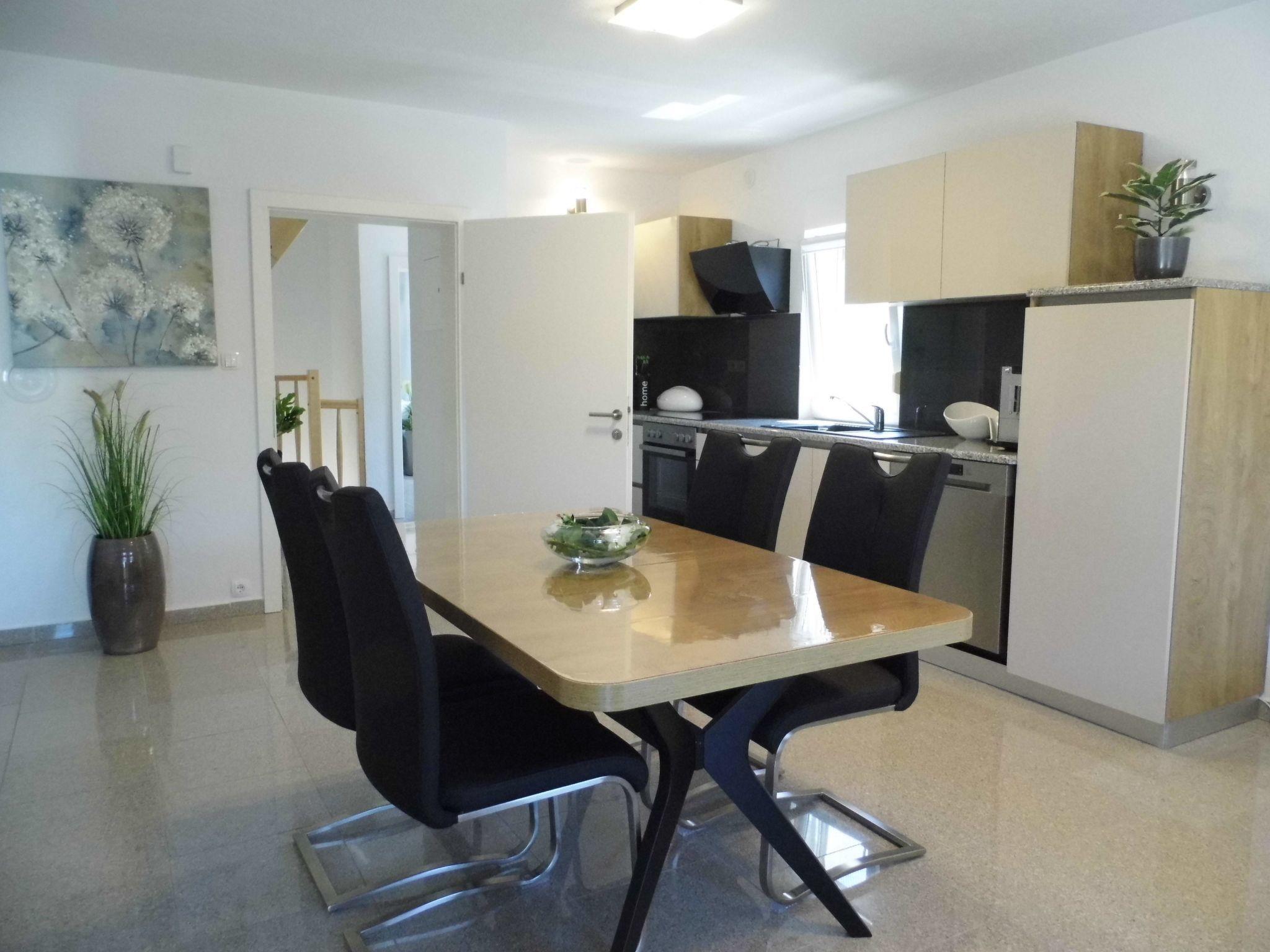 There is dinning table with chairs for all. Kitchen and dinning area are connected (same space) with living room, where is Sat Tv, air condition, sofa where can be prepared an extra bed suitable only for child till 12 years old.