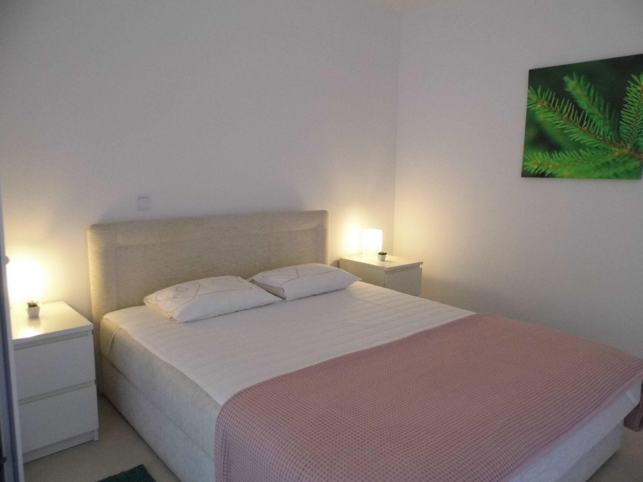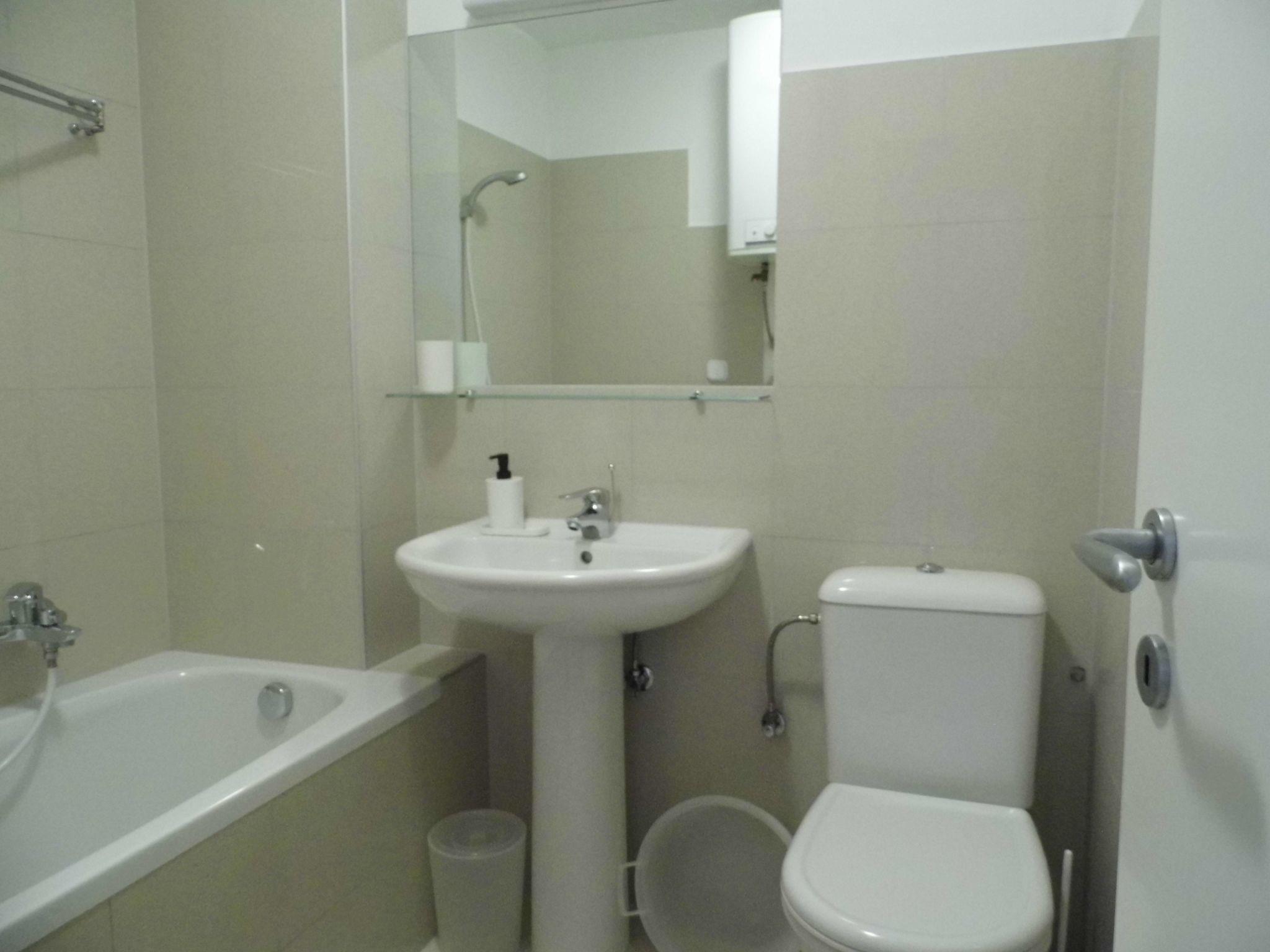 In bathroom is bath tub and toilet. Bedroom is nice, with double bed and exit on the balcony.