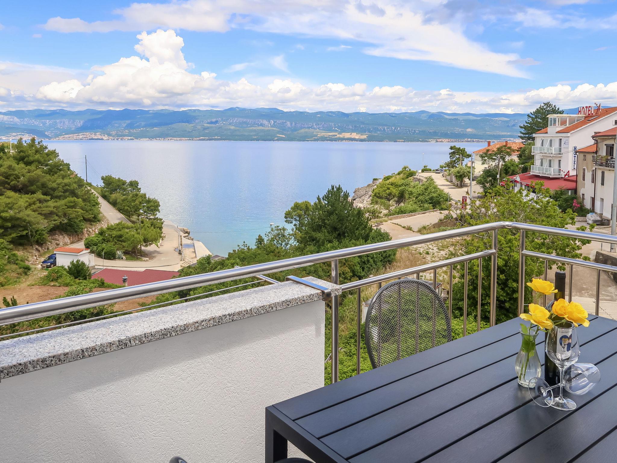 "Marija", 3-room apartment 70 m2 on 2nd floor. Bright: living/sleeping room with sloping ceilings with dining table, satellite TV and air conditioning. Exit to the balcony. With sloping ceilings, 1 room with 1 french bed (160 cm, length 200 cm), shower/WC and air conditioning. 1 room with 1 french bed (160 cm, length 200 cm). Kitchenette (oven, dishwasher, 4 ceramic glass hob hotplates, toaster, kettle, microwave, freezer, electric coffee machine). Shower/WC. Forced-air heating. Balcony. Balcony furniture. Very beautiful panoramic view of the sea and the mountains. Facilities: Internet (WiFi, free). Parking (2 cars). Please note: non-smokers only. Max. occupancy: 4 adults, 1 child up to 12 years old.
