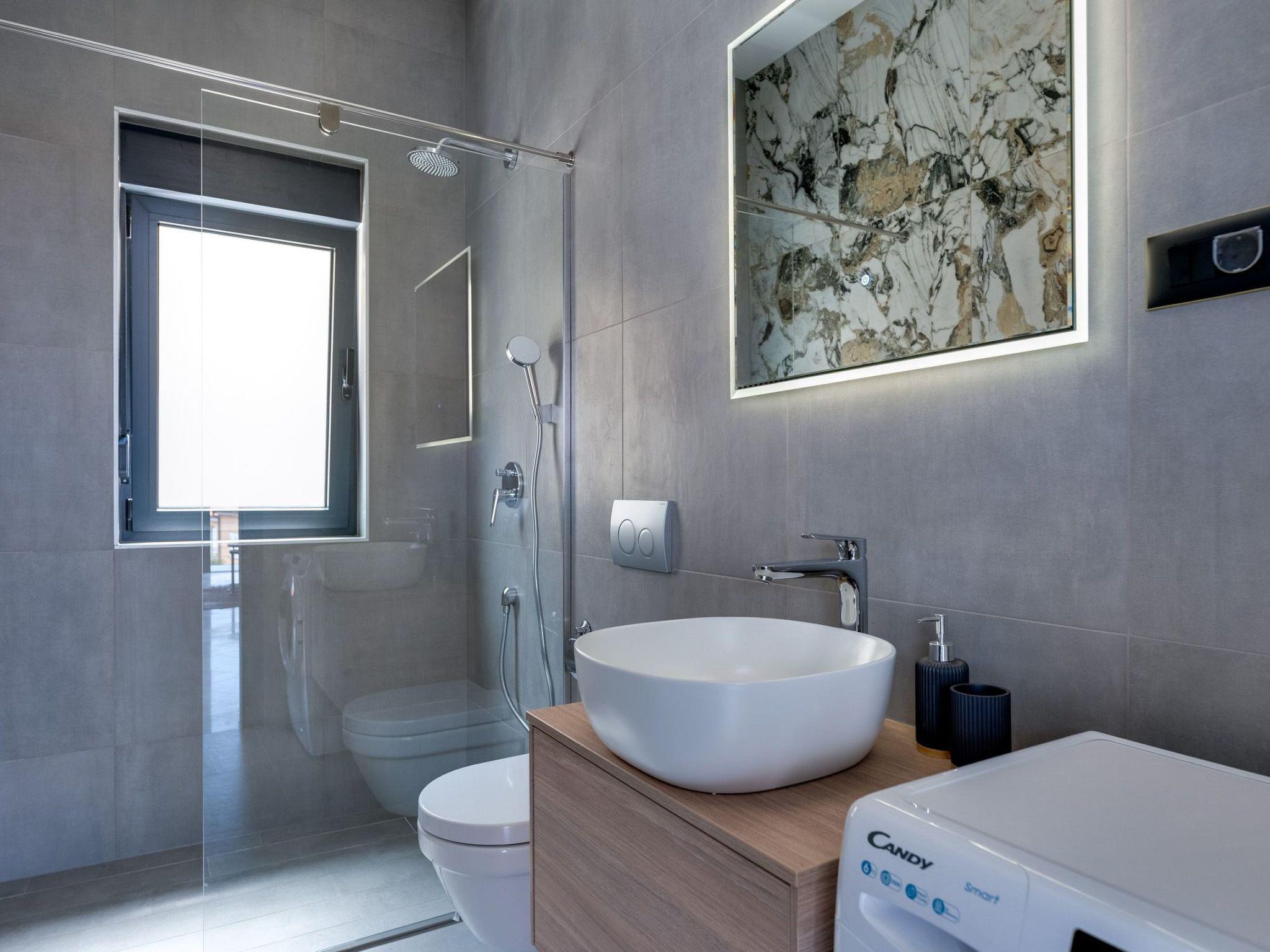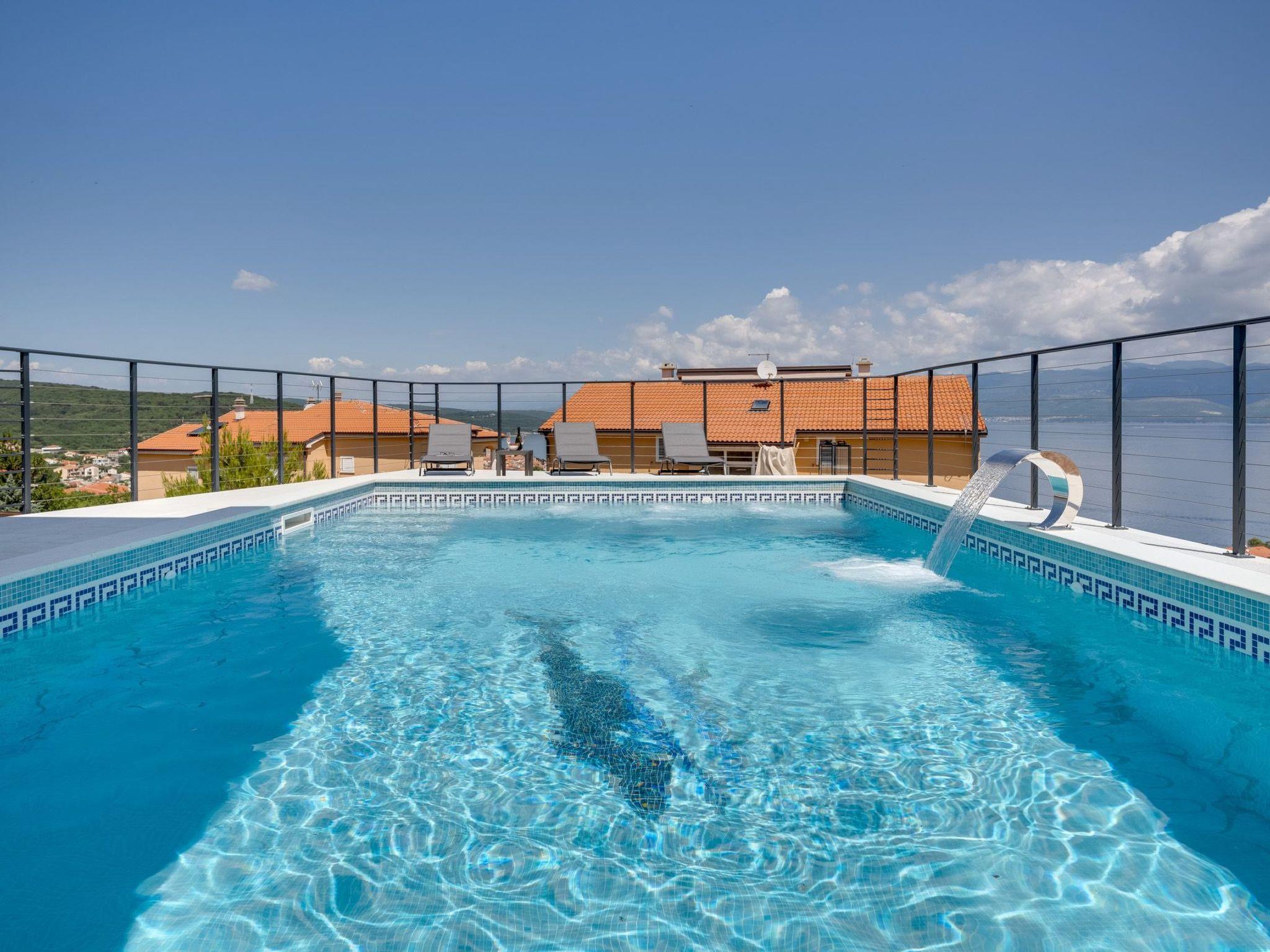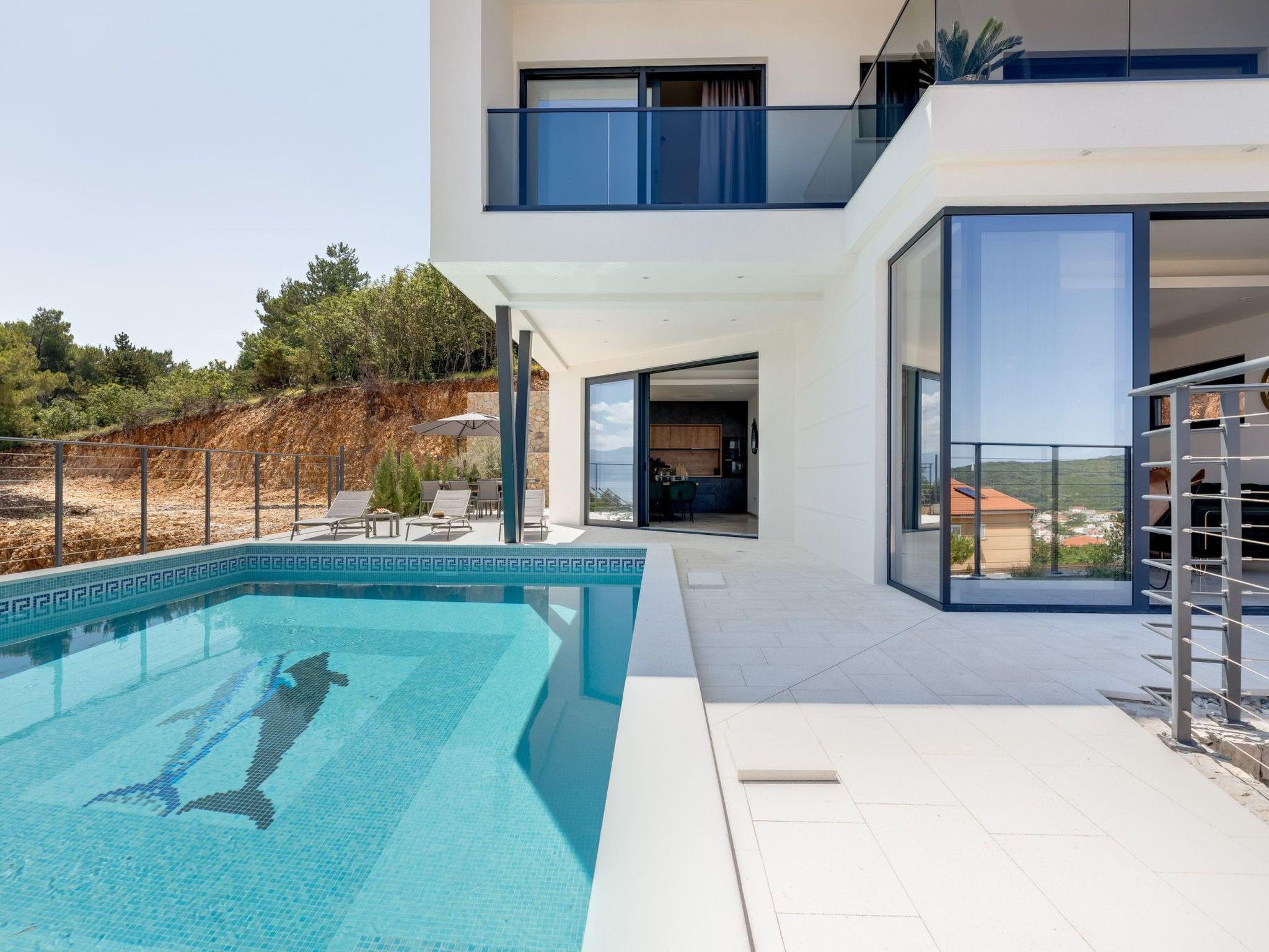 This brand new luxury villa is located on a hill above the romantic town of Vrbnik with spectacular panoramic sea views. The villa has 3 bedrooms and 4 bathrooms. On the ground floor of the villa, which is completely paved with the famous stone of the island of Brac (as is the whole area around the villa), there is a spacious living room, a kitchen with all appliances and a bathroom with a shower. From the living room, guests have direct access to the pool, which offers an unobstructed view of the sea and the greenery. The pool is 38 m2, has massage benches and a waterfall. Around the pool on the terrace there are sun loungers, a seating set with a large parasol, a grill and an outdoor shower. On the first floor of the villa there are three bedrooms, each with its own bathroom. Two rooms have their own large terrace and from all rooms you can enjoy the view of the sea and the old town of Vrbnik when you wake up in the morning. The villa is fully air-conditioned, has free WiFi, two parking spaces and is completely fenced. The nearest beach is 800 m from the villa, shops and restaurants are 500 m away.