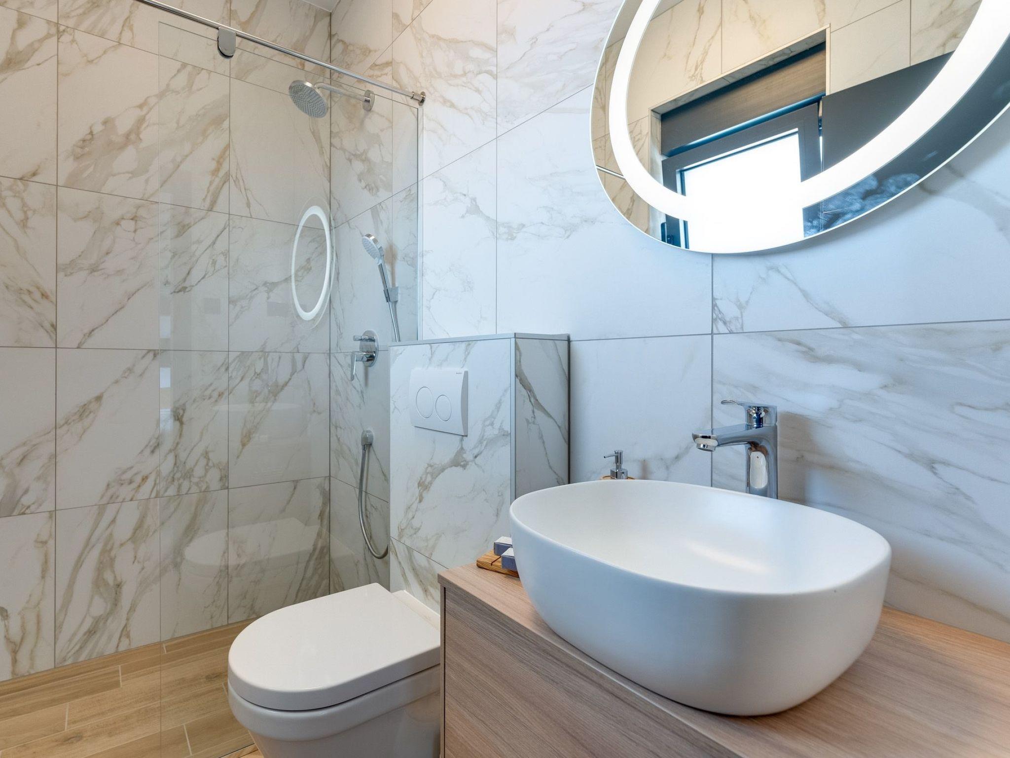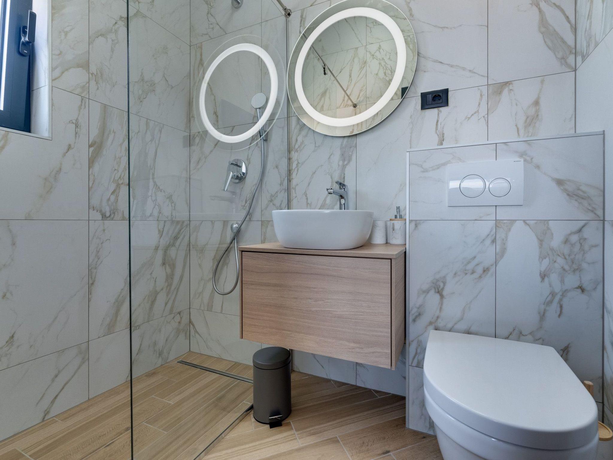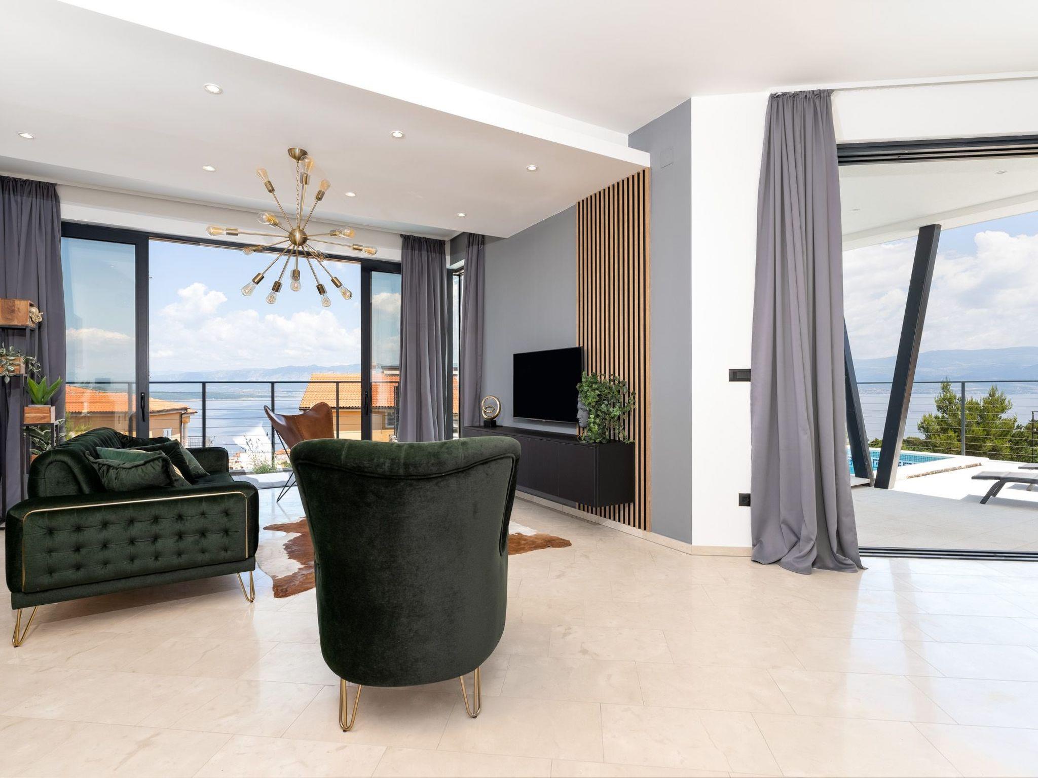 This brand new luxury villa is located on a hill above the romantic town of Vrbnik with spectacular panoramic sea views. The villa has 3 bedrooms and 4 bathrooms. On the ground floor of the villa, which is completely paved with the famous stone of the island of Brac (as is the whole area around the villa), there is a spacious living room, a kitchen with all appliances and a bathroom with a shower. From the living room, guests have direct access to the pool, which offers an unobstructed view of the sea and the greenery. The pool is 38 m2, has massage benches and a waterfall. Around the pool on the terrace there are sun loungers, a seating set with a large parasol, a grill and an outdoor shower. On the first floor of the villa there are three bedrooms, each with its own bathroom. Two rooms have their own large terrace and from all rooms you can enjoy the view of the sea and the old town of Vrbnik when you wake up in the morning. The villa is fully air-conditioned, has free WiFi, two parking spaces and is completely fenced. The nearest beach is 800 m from the villa, shops and restaurants are 500 m away.