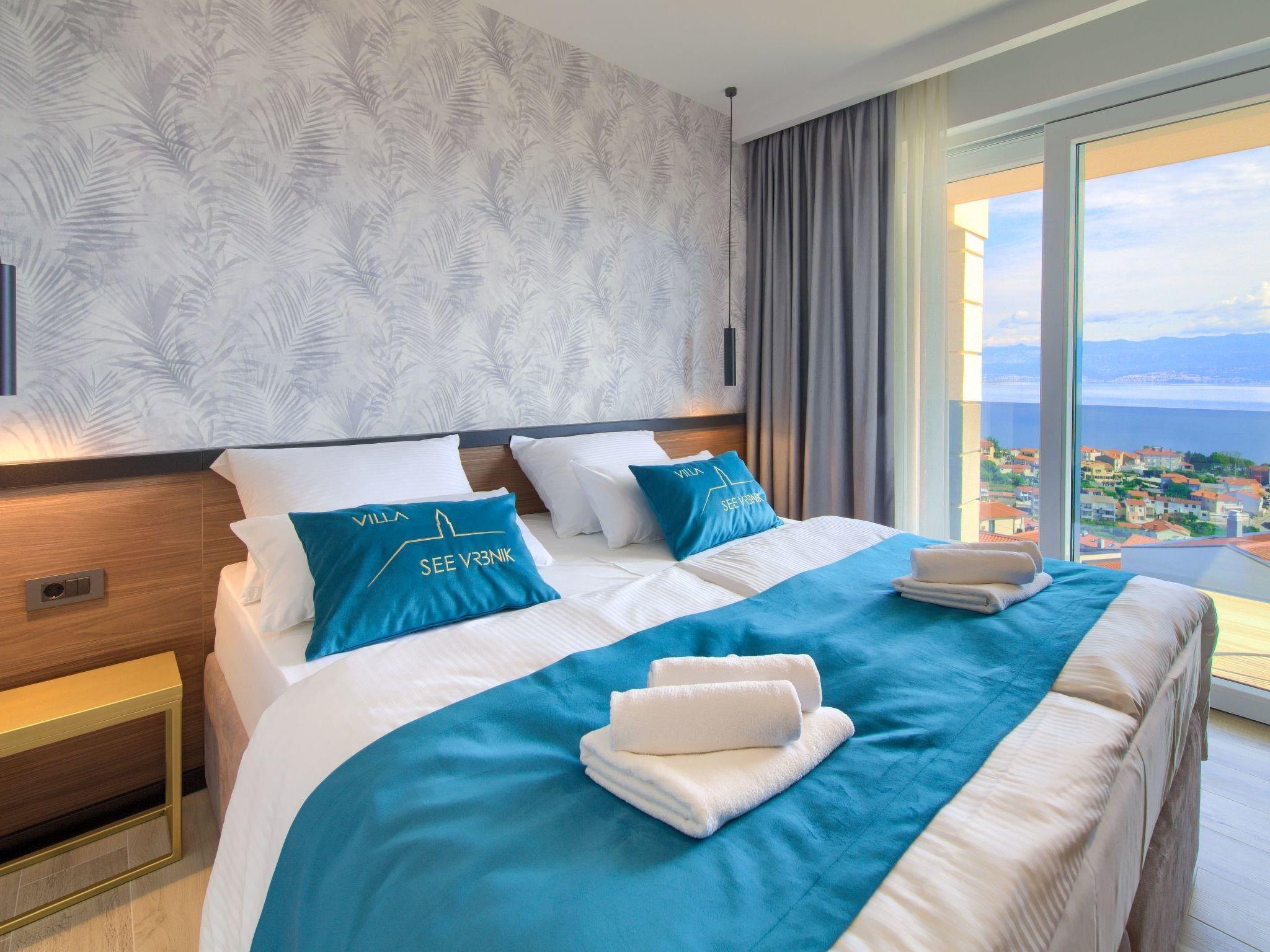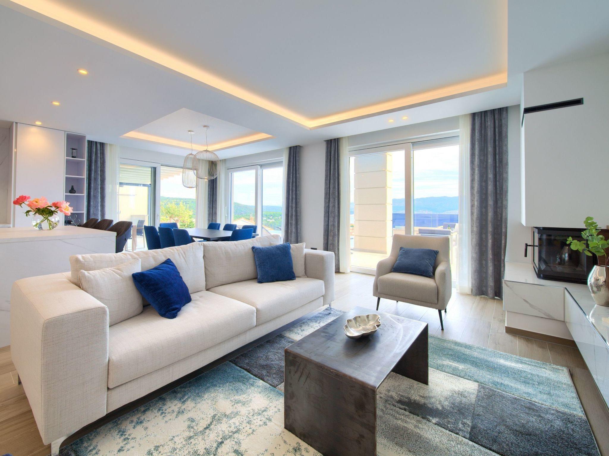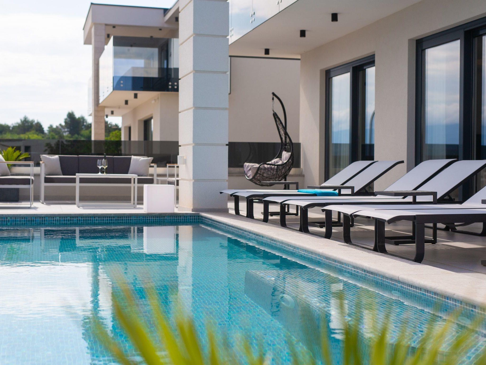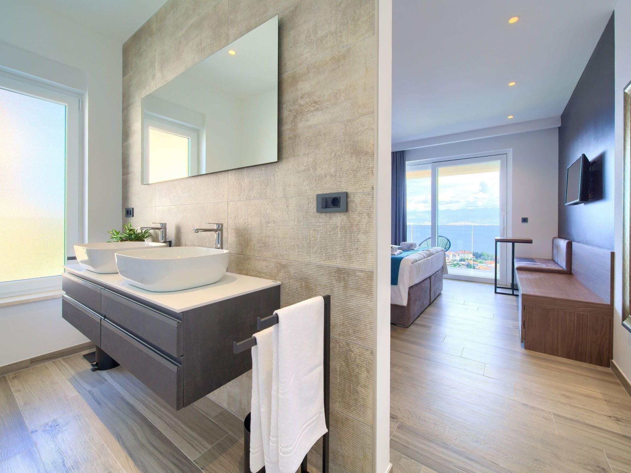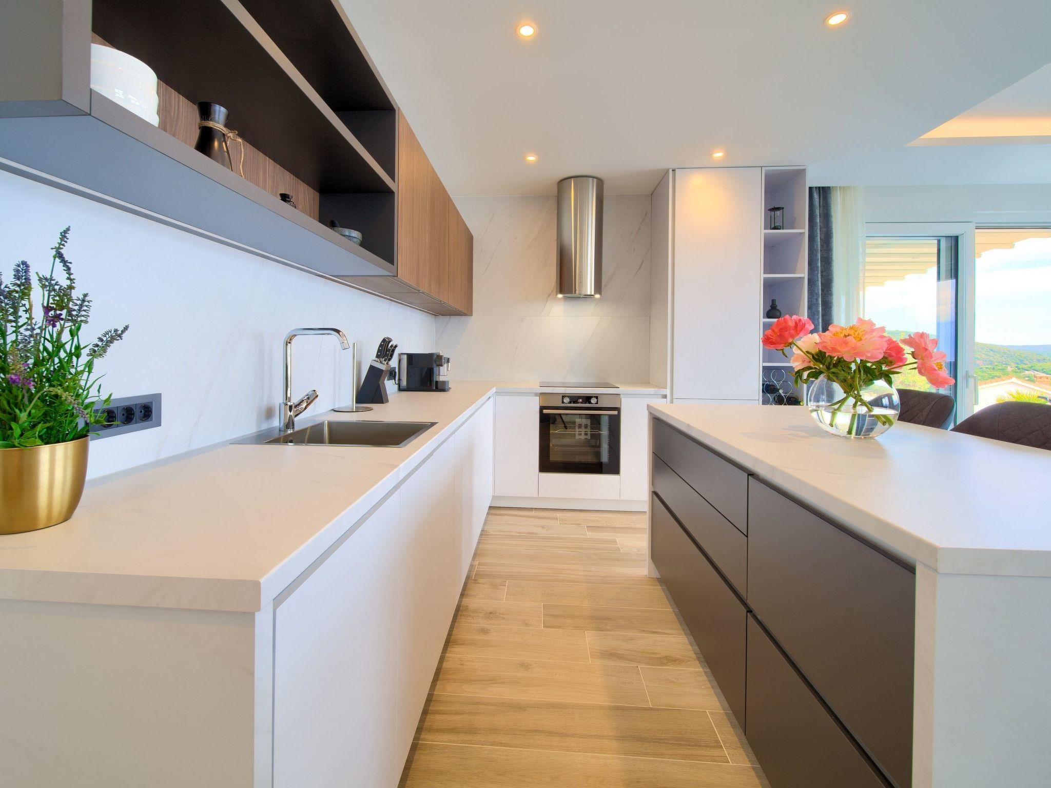 In the small and romantic town of Vrbnik, on the island of Krk, this new beautiful villa with a fantastic view of the sea is located. The villa has 350 m2, 4 bedrooms and 4 bathrooms. In the entrance hall there is a laundry room and a large garage, on the first floor there is a living room, a bedroom with a bathroom and a sauna. The living room leads to a covered terrace with an infinity pool overlooking the sea.