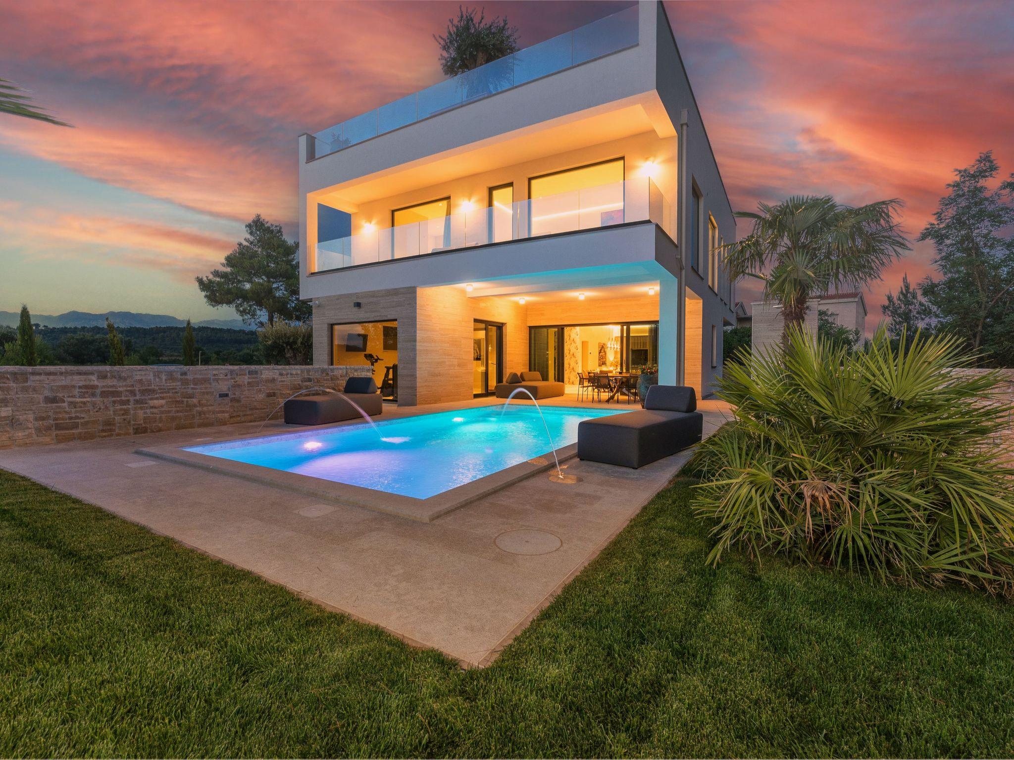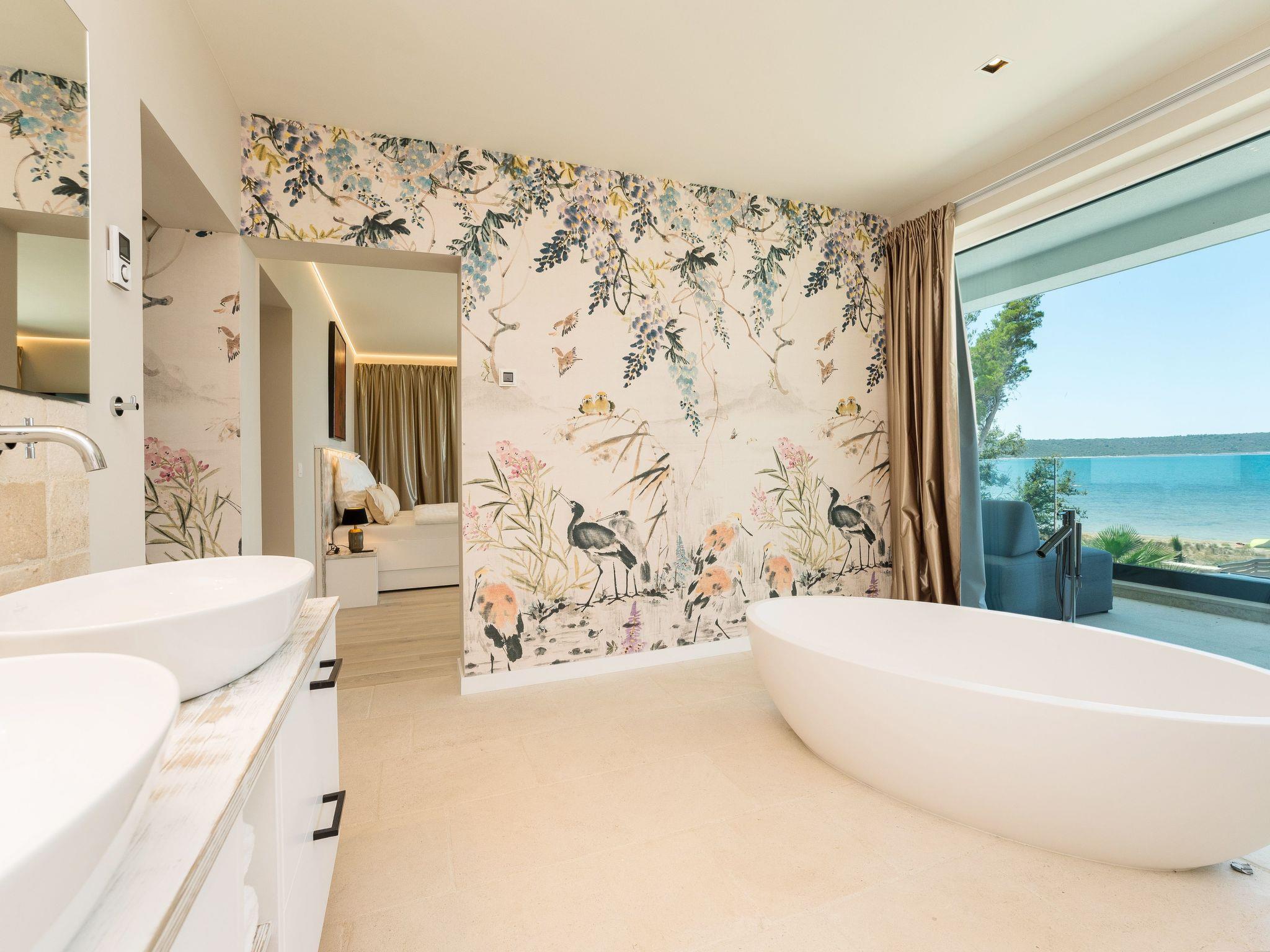 On the first floor, on a 110 square metre roof terrace, there is a wellness area with a bath, sauna, whirlpool, outdoor shower and luxurious lounge furniture as well as an outdoor kitchen with a dining area for 10 people; from there (9 metres above the ground) you can enjoy a unique view of the Velebit Mountains and the sea. A Bluetooth sound system adds to the holiday atmosphere.