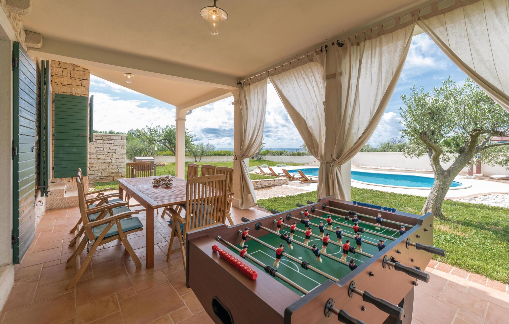 Dette skønne hus af sten ligger i den lille landsby Isici, med ganske få huse og hvor I kan nyde særdeles ugenerte omgivelser. Huset er indrettet med smag og med mange traditionelle elementer. I den store indhegnede have er der oliventræer, og god plads til både børnenes leg og til at I kan tage solbad og lave mad på grillen. Nyd udsigten til øerne i Kvarnerbugten fra den overdækkede terrasse og konkurrer om hvem der er bedst til billard. Huset er fordelt på to etager, som er forbundet med indendørs trappe. På første sal er der stue med køkken og spisestue og tre soveværelser, mens der er et ekstra køkken og et soveværelse i stueplan. Herfra træder I også ud på den overdækkede terrasse med grill.