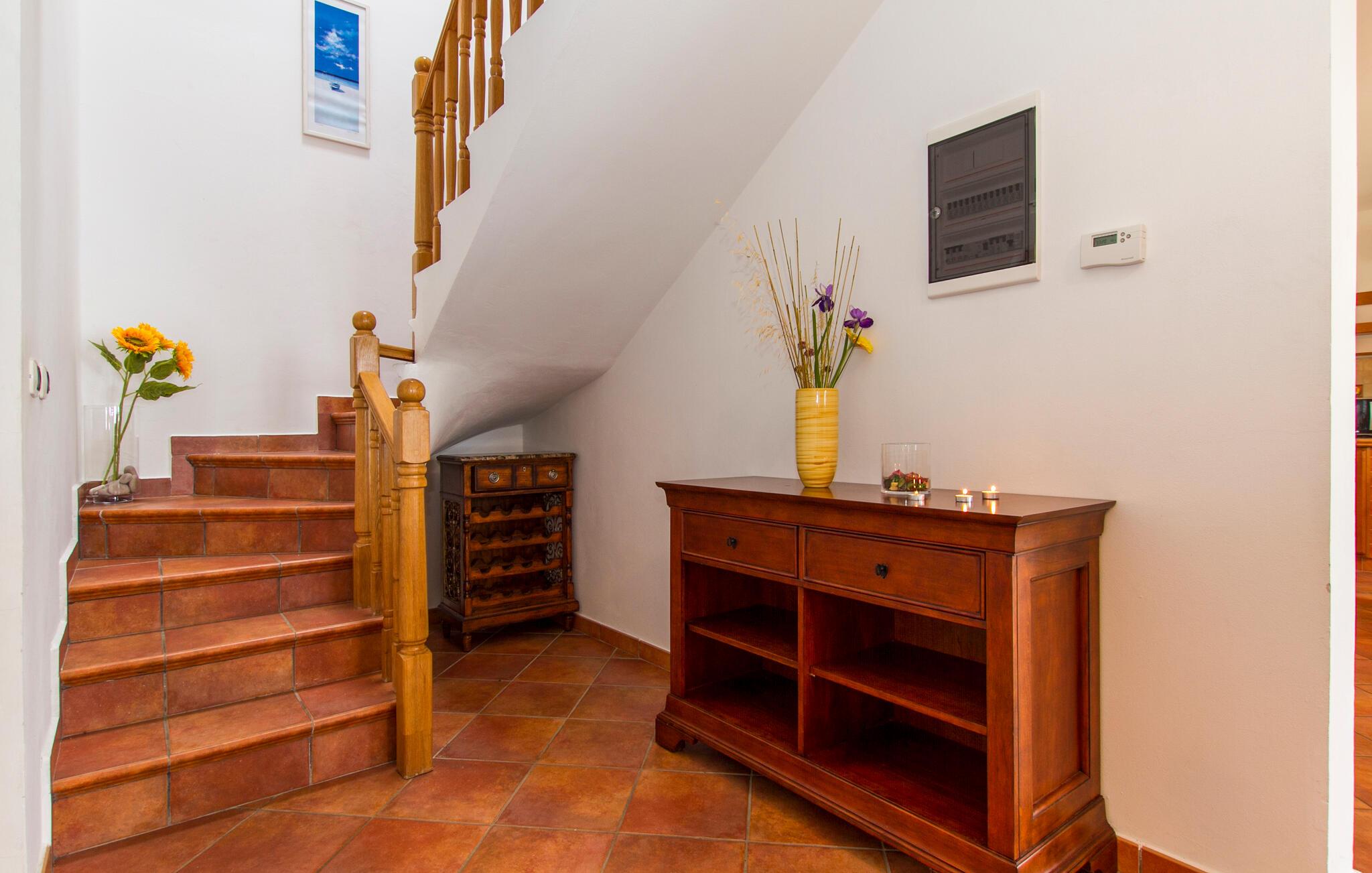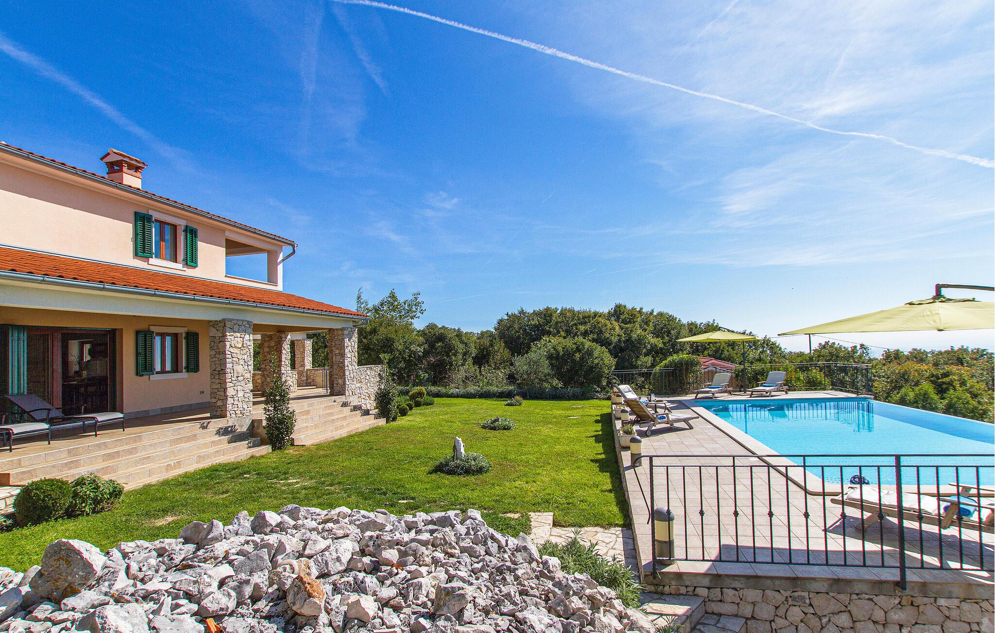 Gå ud på den overdækkede terrasse med grillplads og nyd dagens måltider udendørs. Slap af på en af ??de mange liggestole ved den velholdte pool, og lad blikket vandre over det omkringliggende landskabs grønne omgivelser. Husets beskyttede beliggenhed sikrer ro og privatliv.