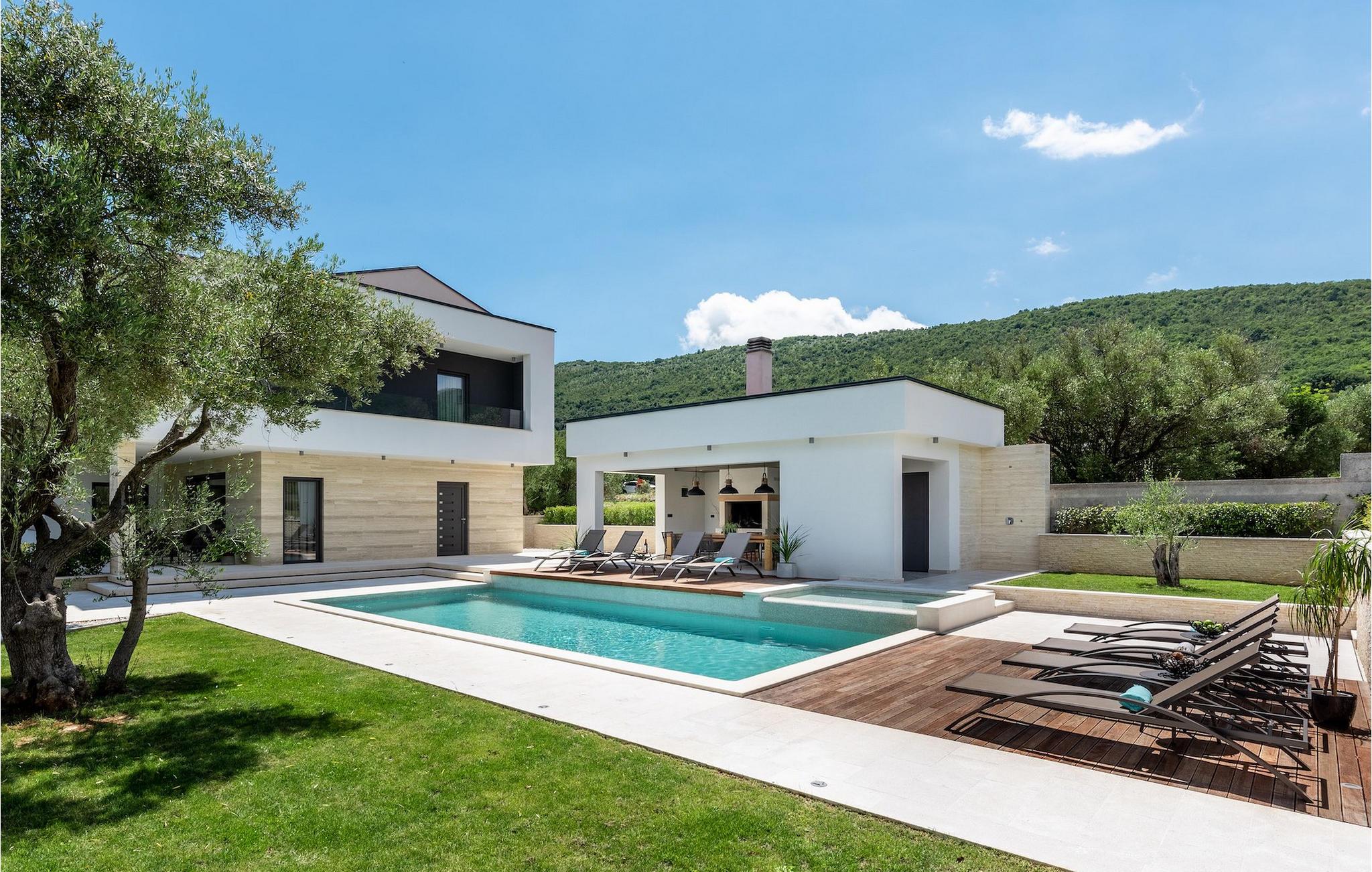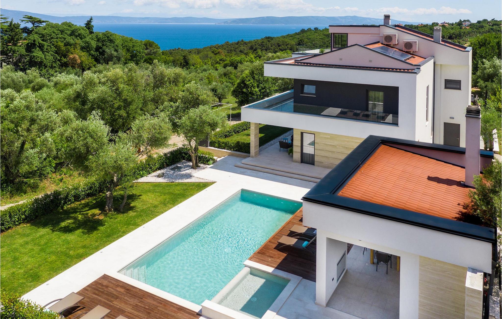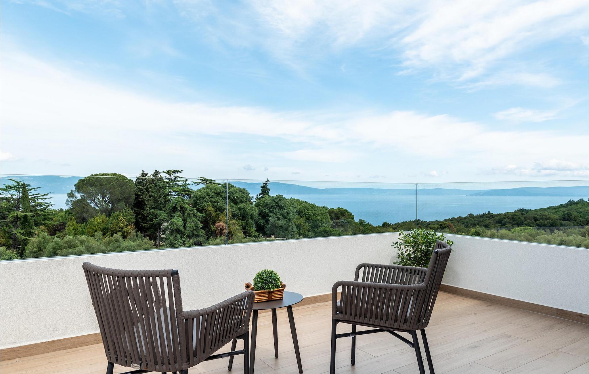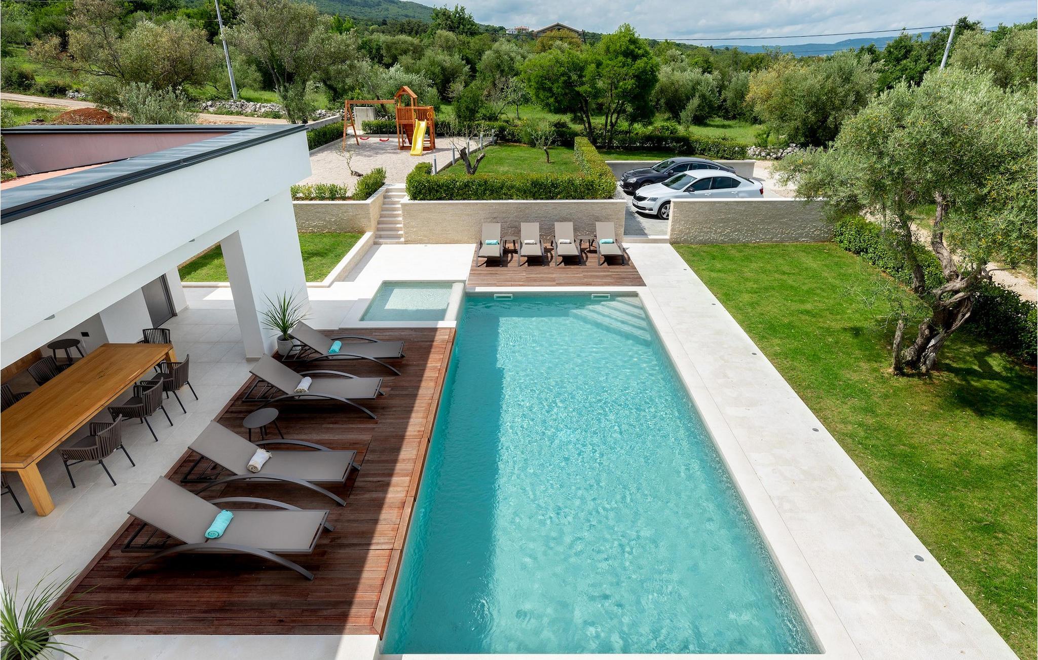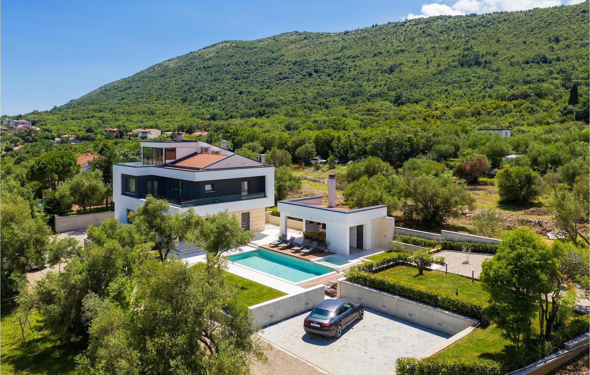 Har du udsøgt smag og leder du efter en luksusvilla? Villa Laurea ligger tæt på havet og har en stor privat pool, en sauna og en fænomenal havudsigt. I den private pool kan du slappe af og forfriske dig selv eller nyde solen på liggestolene. Der er et udendørs køkken med overdækket spiseplads, hvor du kan tilberede og nyde velsmagende måltider med familie og venner. Ved siden af villaen er der også et overdækket loungeområde, hvor du kan nyde din første morgenkaffe eller slappe af i skyggen om dagen, mens vinden bærer duften af middelhavsgrønt. Hvis du rejser med børn, vil du værdsætte fordelene ved villaen. Børn kan lege ubekymret i den helt indhegnede have med legeplads. Villaens interiør er moderne, lyst og luftigt med naturlige farver. Stueetagen har en rummelig stue, spisestue og køkken, samt et soveværelse med eget badeværelse og direkte adgang til gårdhave og pool. På første sal er der yderligere tre soveværelser med private badeværelser og et legerum til børn. På loftet finder du en sauna med bruser og en balkon med smuk udsigt over omgivelserne og havet.Villa Laurea ligger på østkysten af halvøen Istrien i den lille landsby Drenje. Den smukke østkyst i Istrien fra Plomin-bugten til Opatija-rivieraen er en af de smukkeste kyster ved Adriaterhavet. Det er specielt på grund af dets mange bugter og skjulte strande, men også på grund af delfinerne, der lever i dette område. Besøg de nærliggende øer såsom øen Losinj, Cres og Krk og nyd duften af Middelhavet. For alle elskere af aktiv ferie er østkysten ideel. Her er de bedste cykelruter, der forbinder østkysten med det istriske bagland. På den nordlige del af halvøen ligger naturparken Ucka, hvor du kan vandre, cykle og dyrke andre udendørs sportsgrene. Den fremragende beliggenhed af Villa Laurea byder på mange muligheder for dagsture. Besøg landskabet i Istrien, hvor du vil finde adskillige middelalderbyer på bakkerne på bakkerne og førsteklasses traditionelle restauranter, der serverer lokale specialiteter. Besøg også halvøens vestkyst og dens turistperler som Pula, Rovinj og Porec. Glem ikke at besøge Brijuni National Park, en gruppe af øer i syd kendt for sine smukke strande og arkæologiske steder.