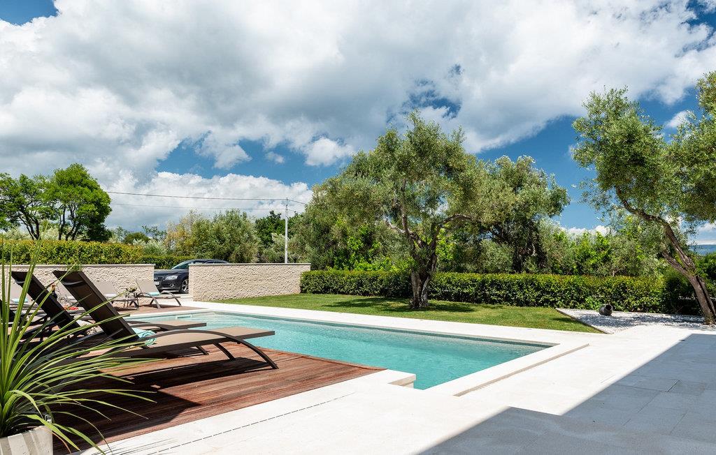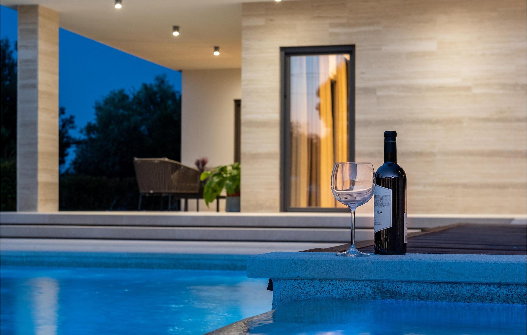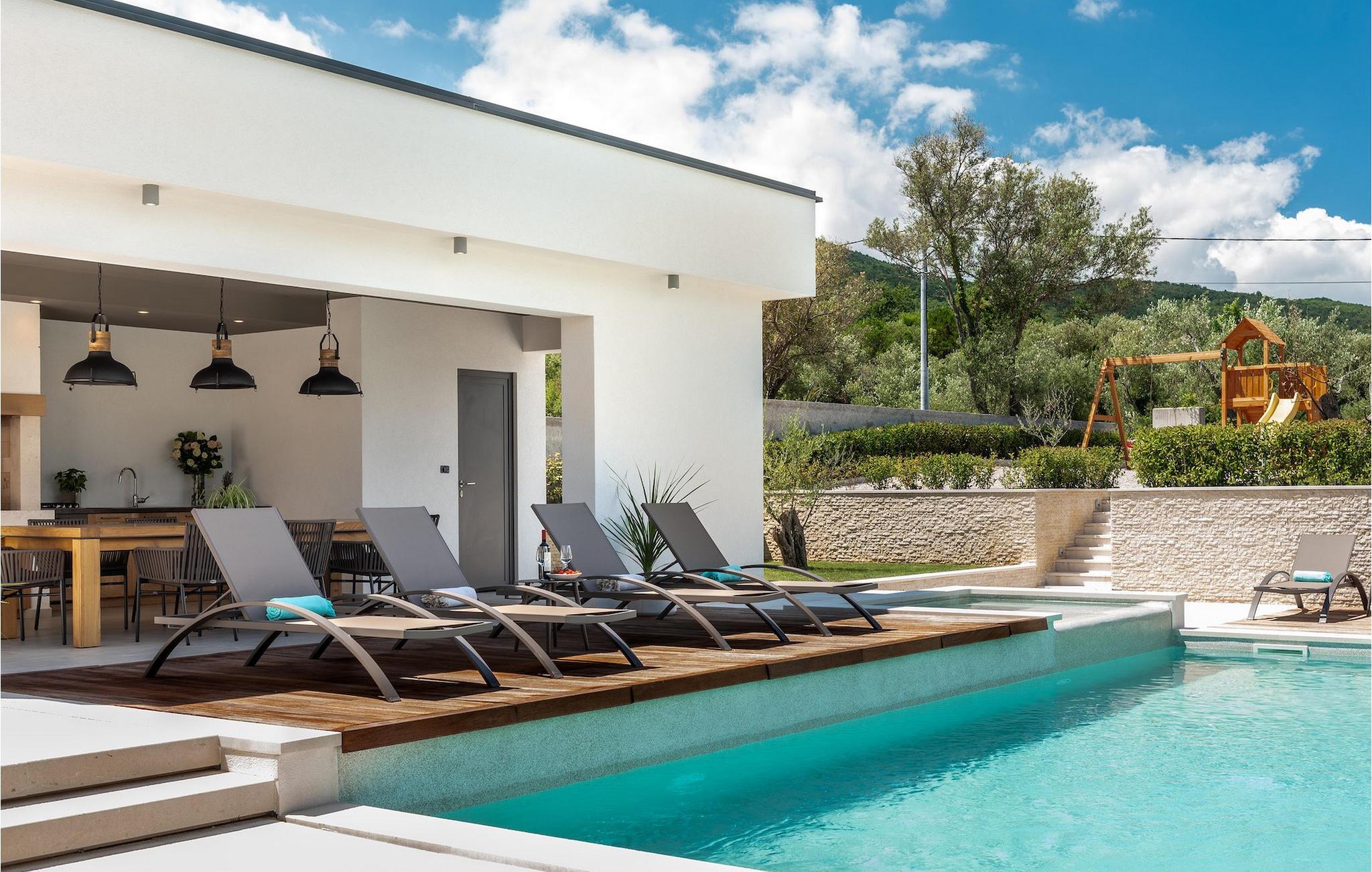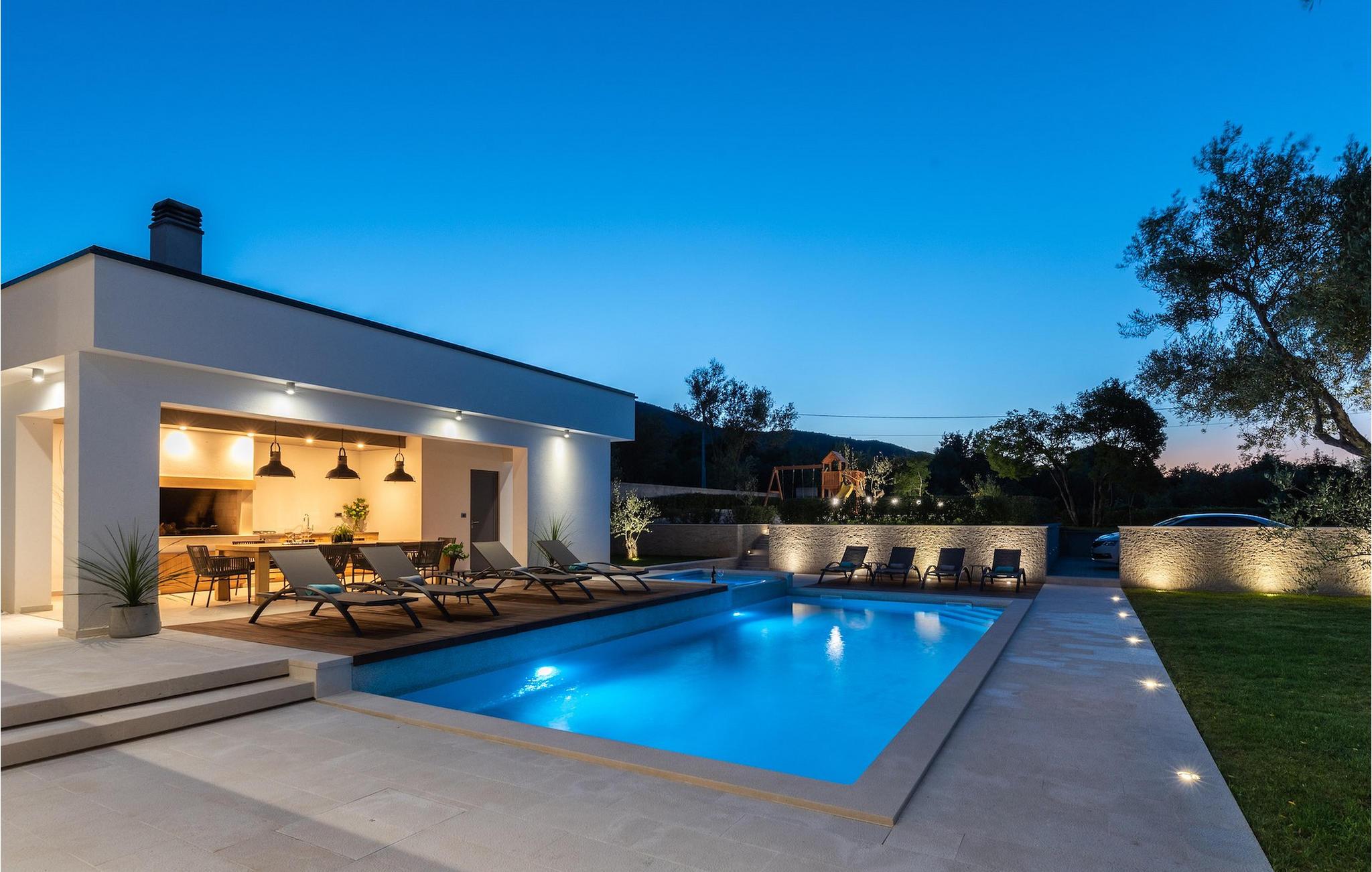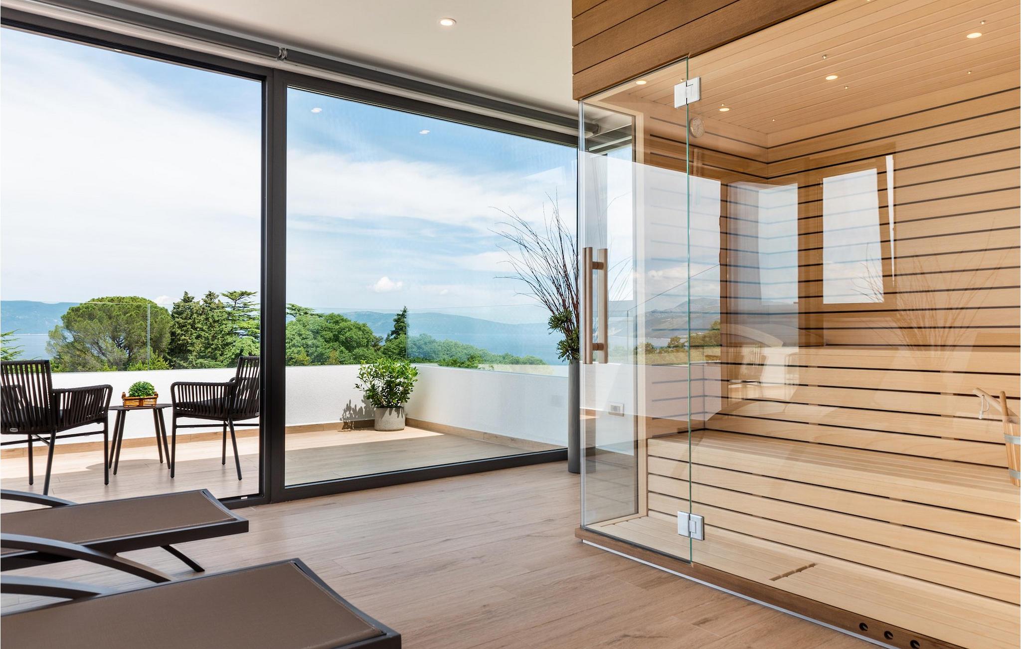 Har du udsøgt smag og leder du efter en luksusvilla? Villa Laurea ligger tæt på havet og har en stor privat pool, en sauna og en fænomenal havudsigt. I den private pool kan du slappe af og forfriske dig selv eller nyde solen på liggestolene. Der er et udendørs køkken med overdækket spiseplads, hvor du kan tilberede og nyde velsmagende måltider med familie og venner. Ved siden af villaen er der også et overdækket loungeområde, hvor du kan nyde din første morgenkaffe eller slappe af i skyggen om dagen, mens vinden bærer duften af middelhavsgrønt. Hvis du rejser med børn, vil du værdsætte fordelene ved villaen. Børn kan lege ubekymret i den helt indhegnede have med legeplads. Villaens interiør er moderne, lyst og luftigt med naturlige farver. Stueetagen har en rummelig stue, spisestue og køkken, samt et soveværelse med eget badeværelse og direkte adgang til gårdhave og pool. På første sal er der yderligere tre soveværelser med private badeværelser og et legerum til børn. På loftet finder du en sauna med bruser og en balkon med smuk udsigt over omgivelserne og havet.Villa Laurea ligger på østkysten af halvøen Istrien i den lille landsby Drenje. Den smukke østkyst i Istrien fra Plomin-bugten til Opatija-rivieraen er en af de smukkeste kyster ved Adriaterhavet. Det er specielt på grund af dets mange bugter og skjulte strande, men også på grund af delfinerne, der lever i dette område. Besøg de nærliggende øer såsom øen Losinj, Cres og Krk og nyd duften af Middelhavet. For alle elskere af aktiv ferie er østkysten ideel. Her er de bedste cykelruter, der forbinder østkysten med det istriske bagland. På den nordlige del af halvøen ligger naturparken Ucka, hvor du kan vandre, cykle og dyrke andre udendørs sportsgrene. Den fremragende beliggenhed af Villa Laurea byder på mange muligheder for dagsture. Besøg landskabet i Istrien, hvor du vil finde adskillige middelalderbyer på bakkerne på bakkerne og førsteklasses traditionelle restauranter, der serverer lokale specialiteter. Besøg også halvøens vestkyst og dens turistperler som Pula, Rovinj og Porec. Glem ikke at besøge Brijuni National Park, en gruppe af øer i syd kendt for sine smukke strande og arkæologiske steder.