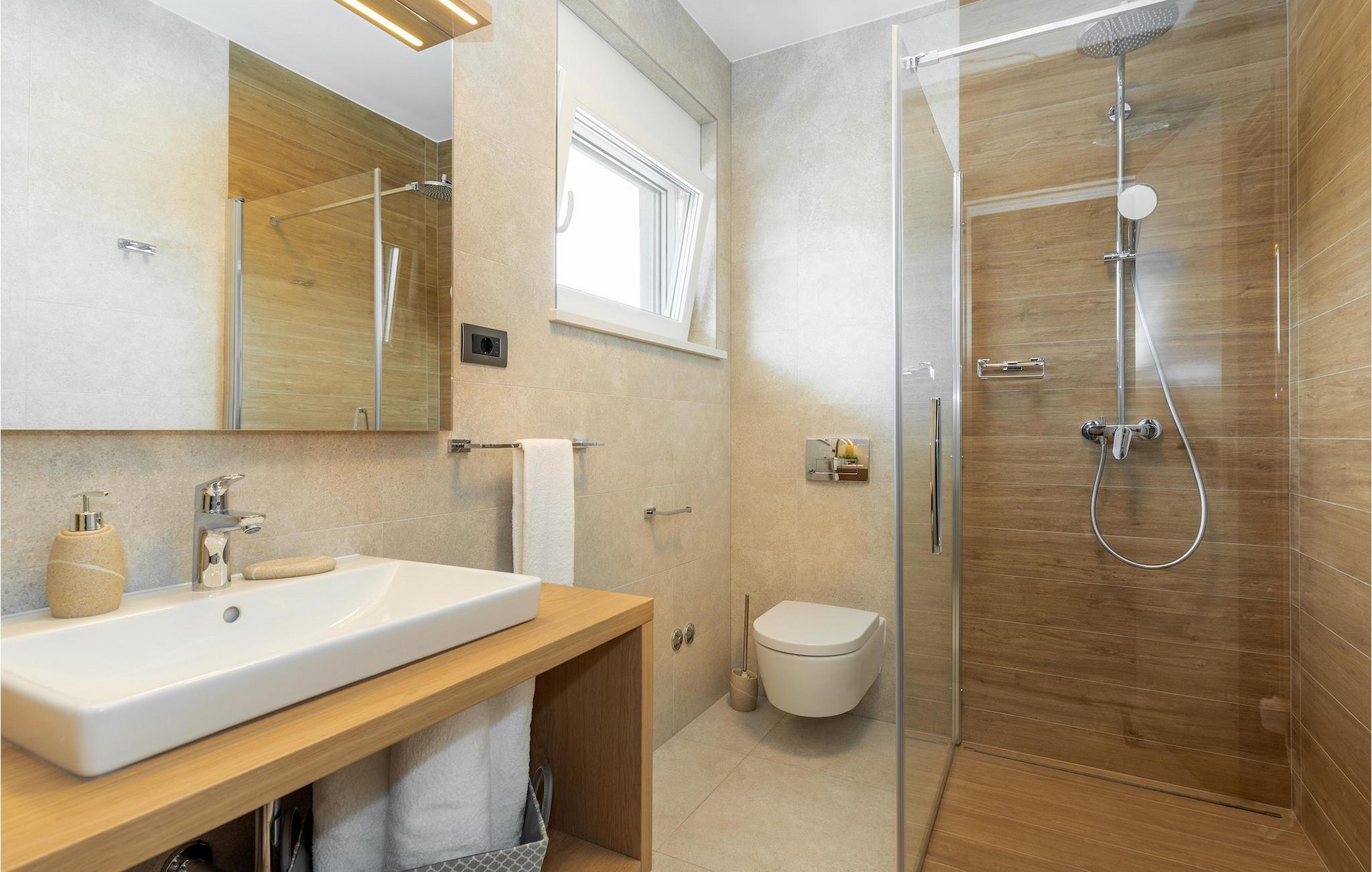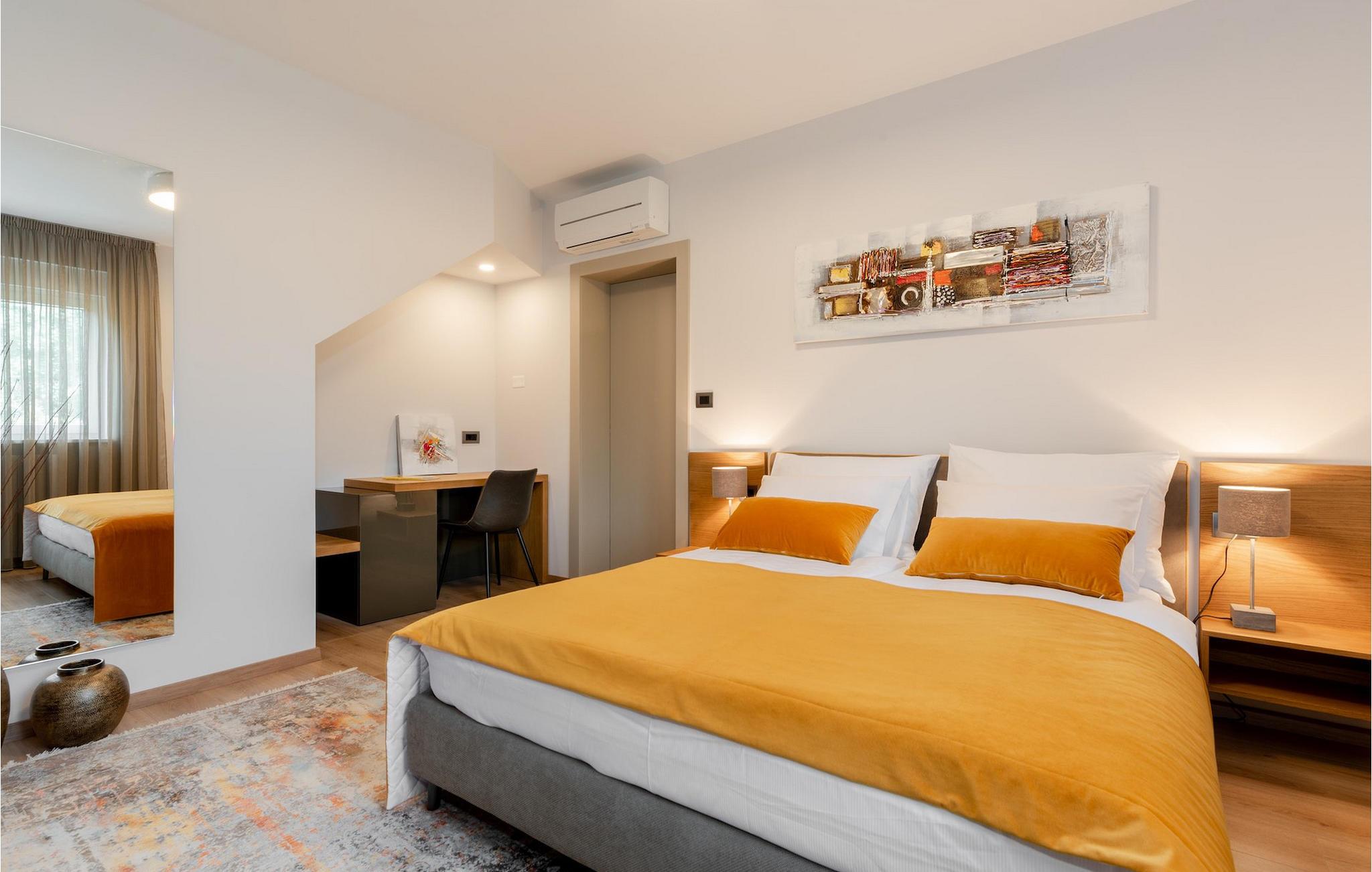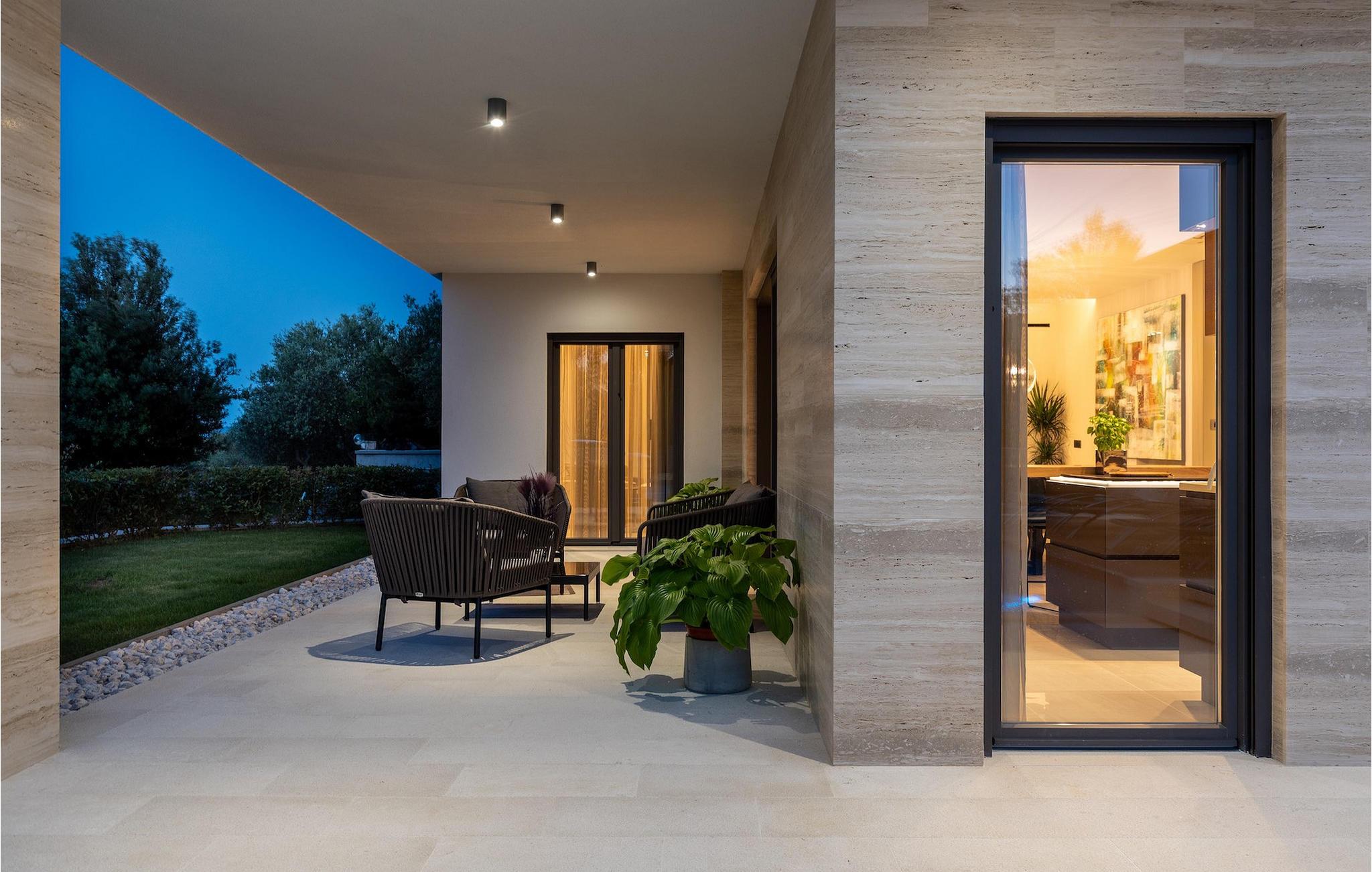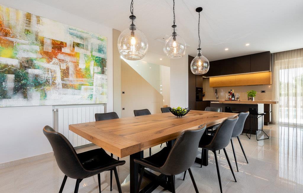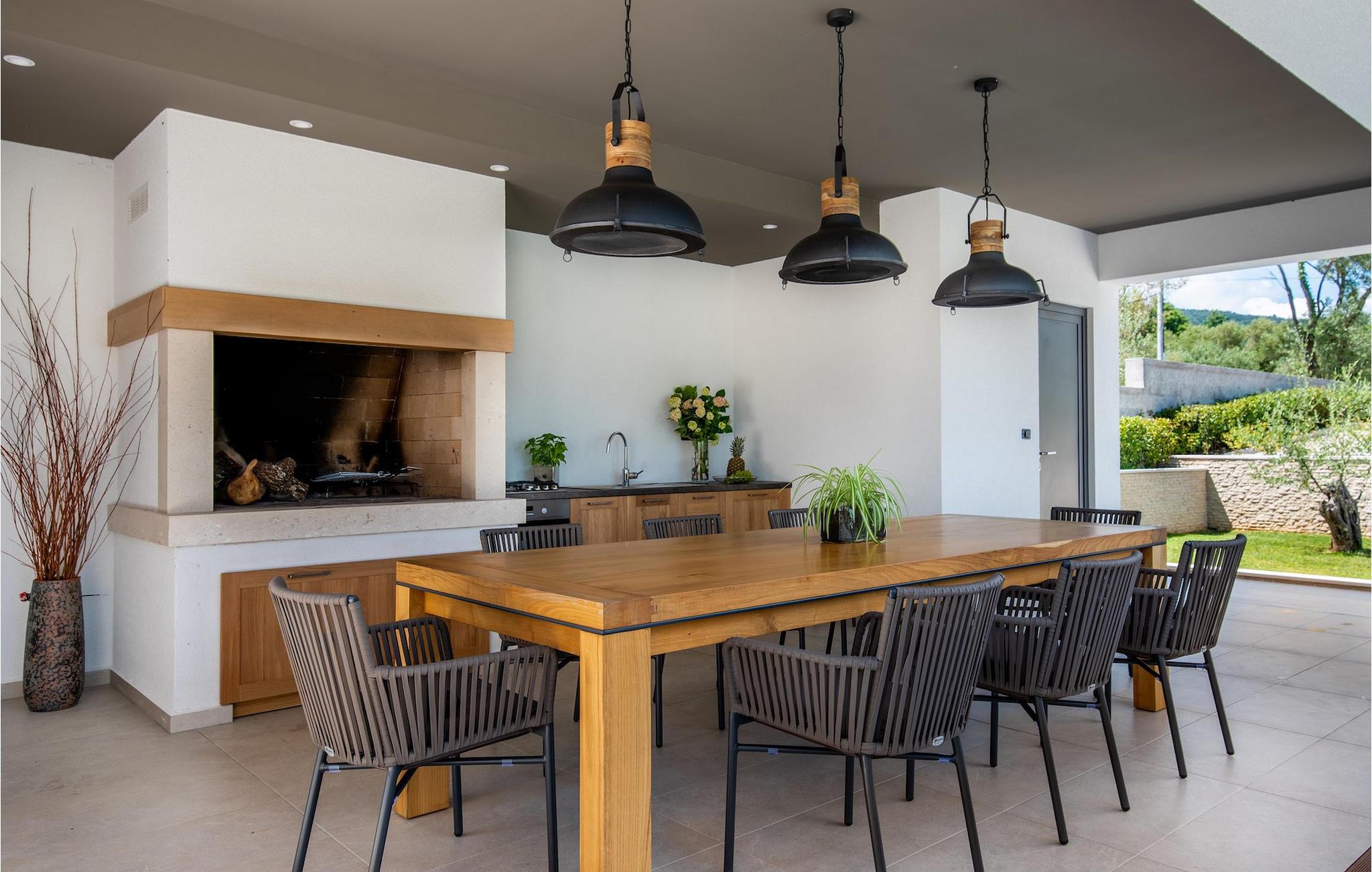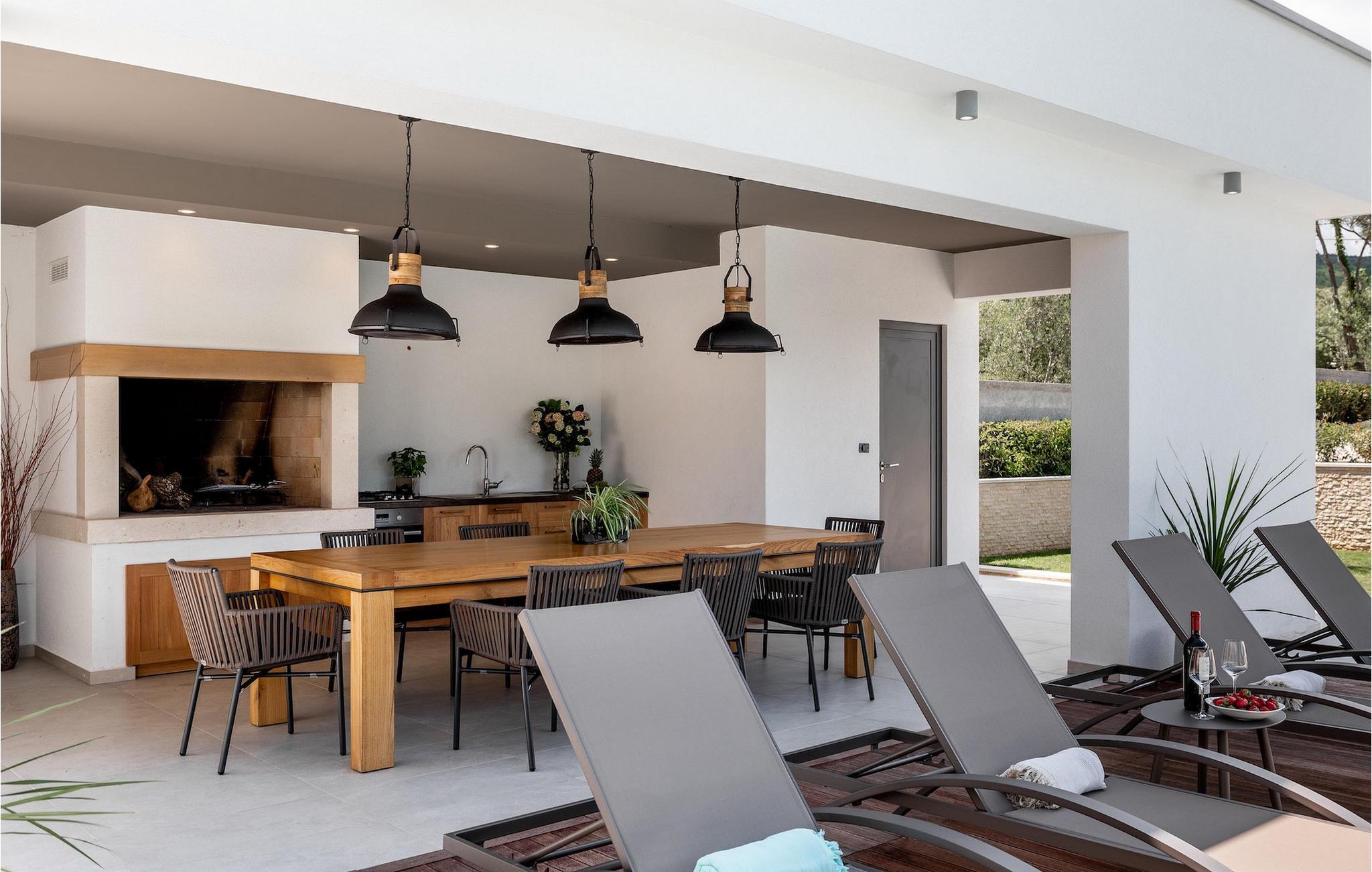 Har du udsøgt smag og leder du efter en luksusvilla? Villa Laurea ligger tæt på havet og har en stor privat pool, en sauna og en fænomenal havudsigt. I den private pool kan du slappe af og forfriske dig selv eller nyde solen på liggestolene. Der er et udendørs køkken med overdækket spiseplads, hvor du kan tilberede og nyde velsmagende måltider med familie og venner. Ved siden af villaen er der også et overdækket loungeområde, hvor du kan nyde din første morgenkaffe eller slappe af i skyggen om dagen, mens vinden bærer duften af middelhavsgrønt. Hvis du rejser med børn, vil du værdsætte fordelene ved villaen. Børn kan lege ubekymret i den helt indhegnede have med legeplads. Villaens interiør er moderne, lyst og luftigt med naturlige farver. Stueetagen har en rummelig stue, spisestue og køkken, samt et soveværelse med eget badeværelse og direkte adgang til gårdhave og pool. På første sal er der yderligere tre soveværelser med private badeværelser og et legerum til børn. På loftet finder du en sauna med bruser og en balkon med smuk udsigt over omgivelserne og havet.Villa Laurea ligger på østkysten af halvøen Istrien i den lille landsby Drenje. Den smukke østkyst i Istrien fra Plomin-bugten til Opatija-rivieraen er en af de smukkeste kyster ved Adriaterhavet. Det er specielt på grund af dets mange bugter og skjulte strande, men også på grund af delfinerne, der lever i dette område. Besøg de nærliggende øer såsom øen Losinj, Cres og Krk og nyd duften af Middelhavet. For alle elskere af aktiv ferie er østkysten ideel. Her er de bedste cykelruter, der forbinder østkysten med det istriske bagland. På den nordlige del af halvøen ligger naturparken Ucka, hvor du kan vandre, cykle og dyrke andre udendørs sportsgrene. Den fremragende beliggenhed af Villa Laurea byder på mange muligheder for dagsture. Besøg landskabet i Istrien, hvor du vil finde adskillige middelalderbyer på bakkerne på bakkerne og førsteklasses traditionelle restauranter, der serverer lokale specialiteter. Besøg også halvøens vestkyst og dens turistperler som Pula, Rovinj og Porec. Glem ikke at besøge Brijuni National Park, en gruppe af øer i syd kendt for sine smukke strande og arkæologiske steder.