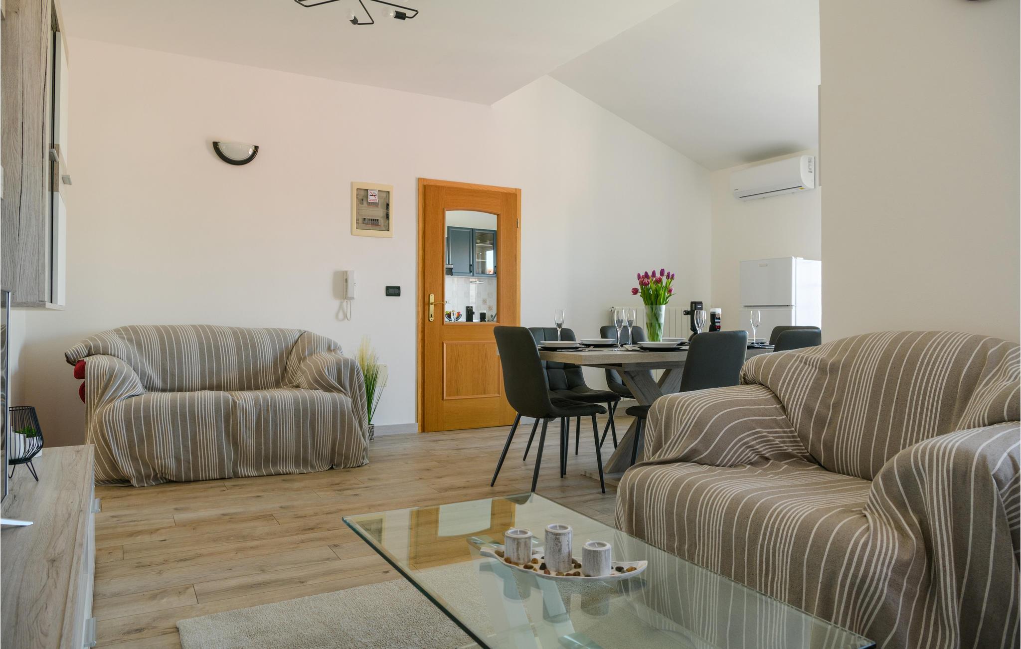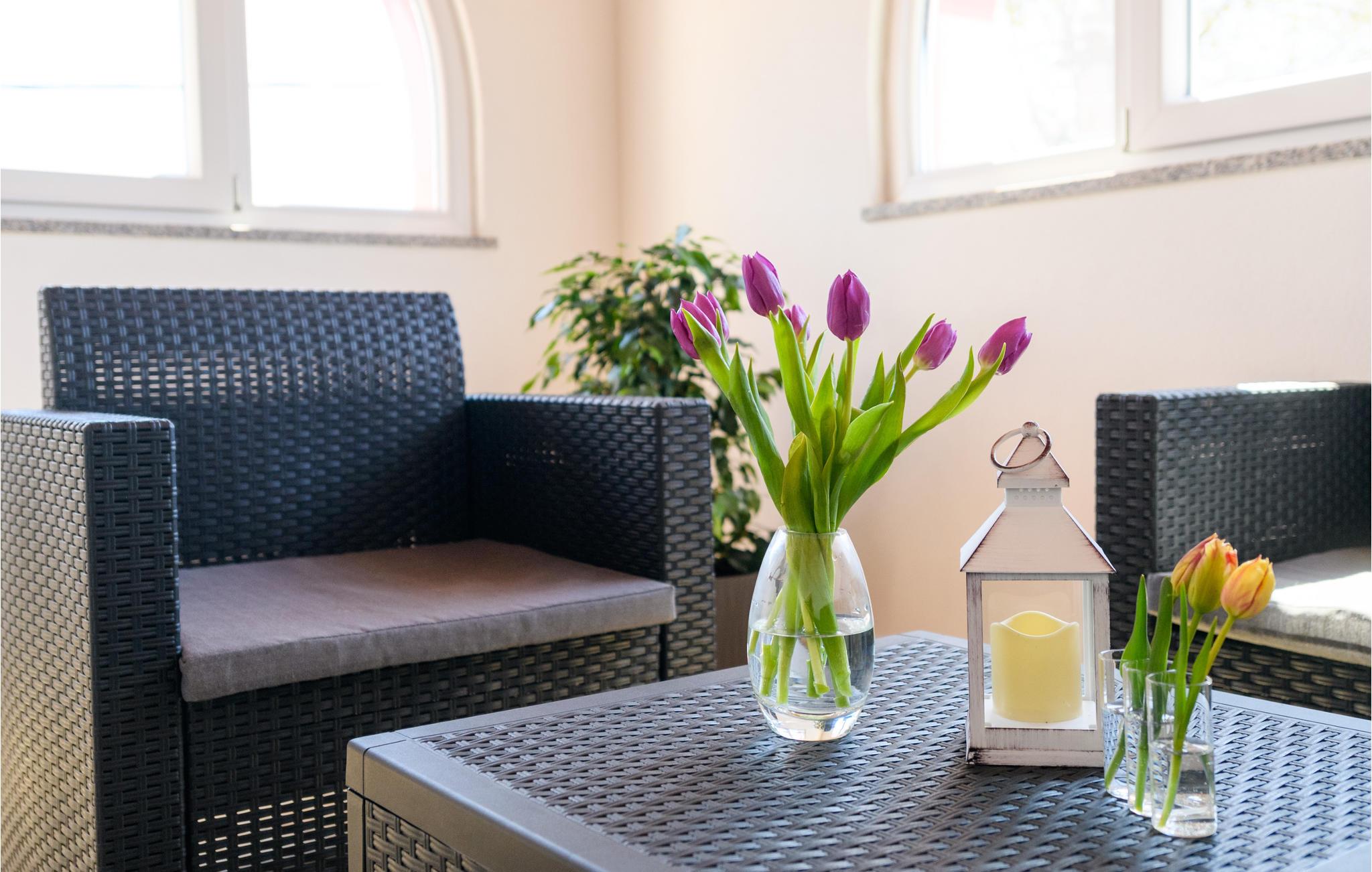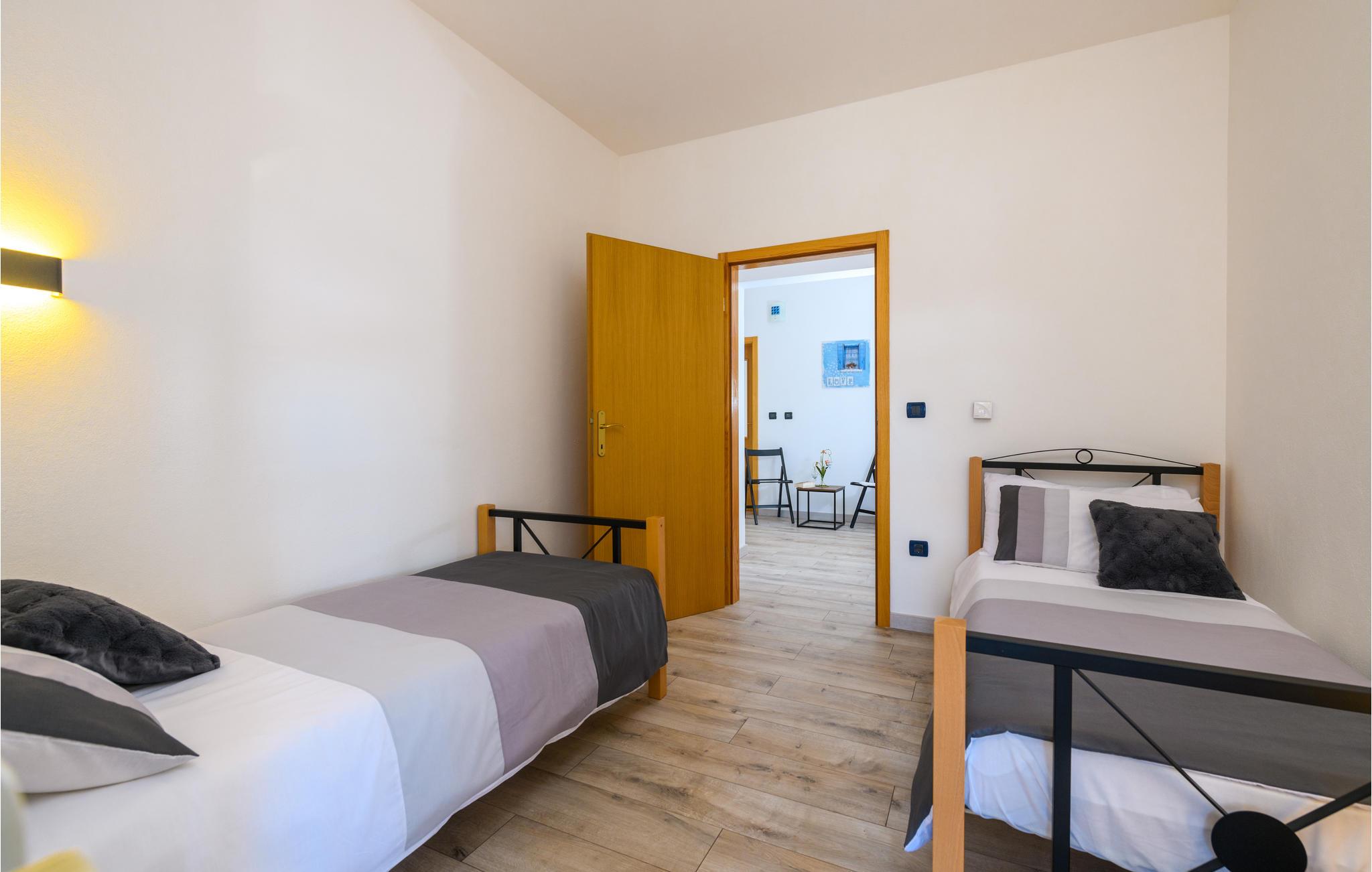 Dette dejlige og komfortable feriehus med swimmingpool der står i haven hvor palmerne svajer i vinden, ligger i den lille by Kapelica ikke langt fra Labin. I stueplan er der et lille køkken og en rummelig stue med åben kamin. På den anden side af en skydedør finder I endnu et soveværelse. På øverste etage er der fire soveværelser, køkken, spise- og opholdsstue. Fra to soveværelser er der udgang til altan. På siden af huset ligger et lille hus, som af og til bebos af husets ejer. Rabacs nærmeste strande, som regnes blandt Istriens skønneste, nås på bare ti minutter i bil. Fra Rabac kan I tage på tur i båd til Kvarnerøerne eller besøge den smukek gamle bydel i Labin.