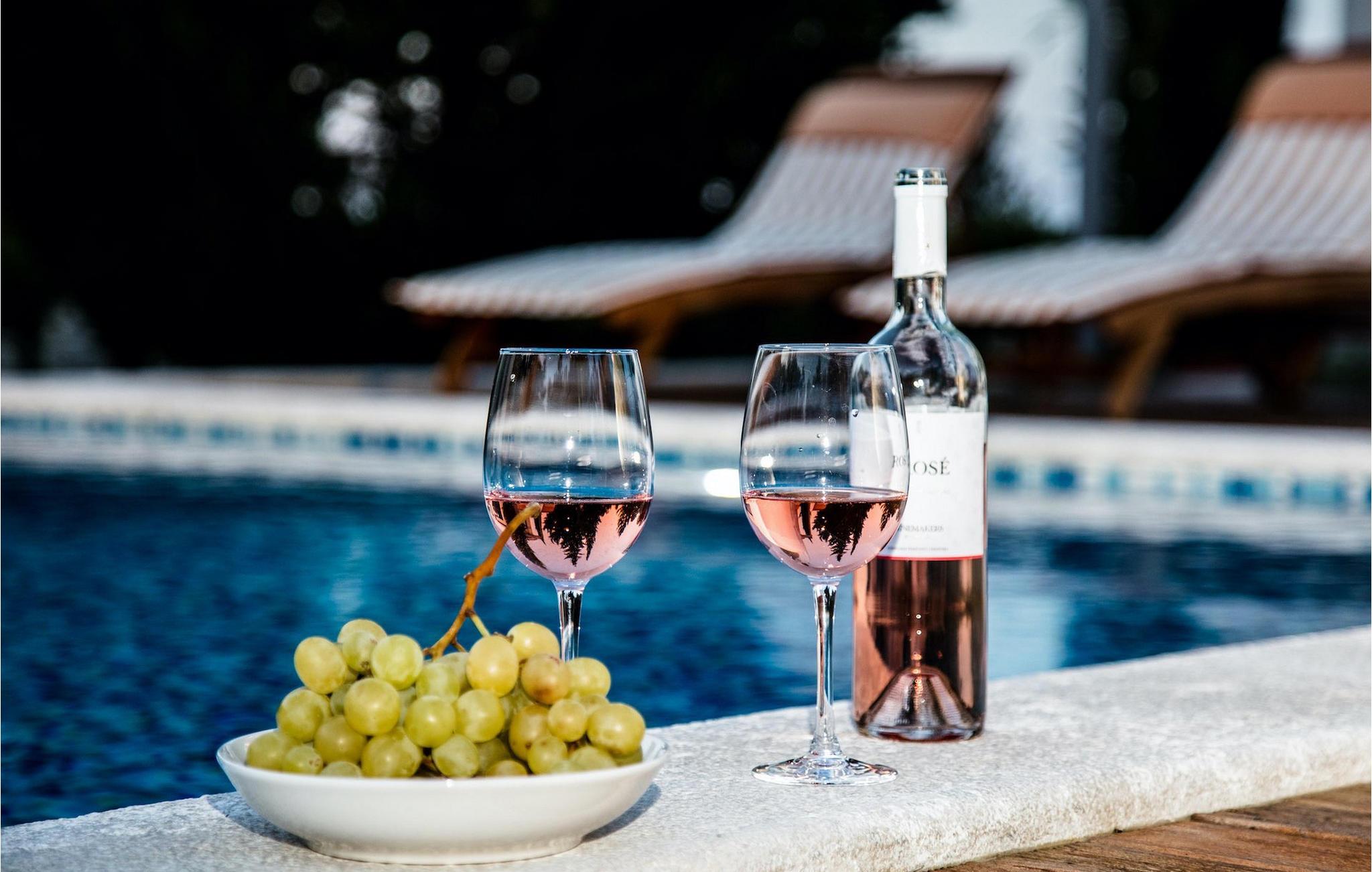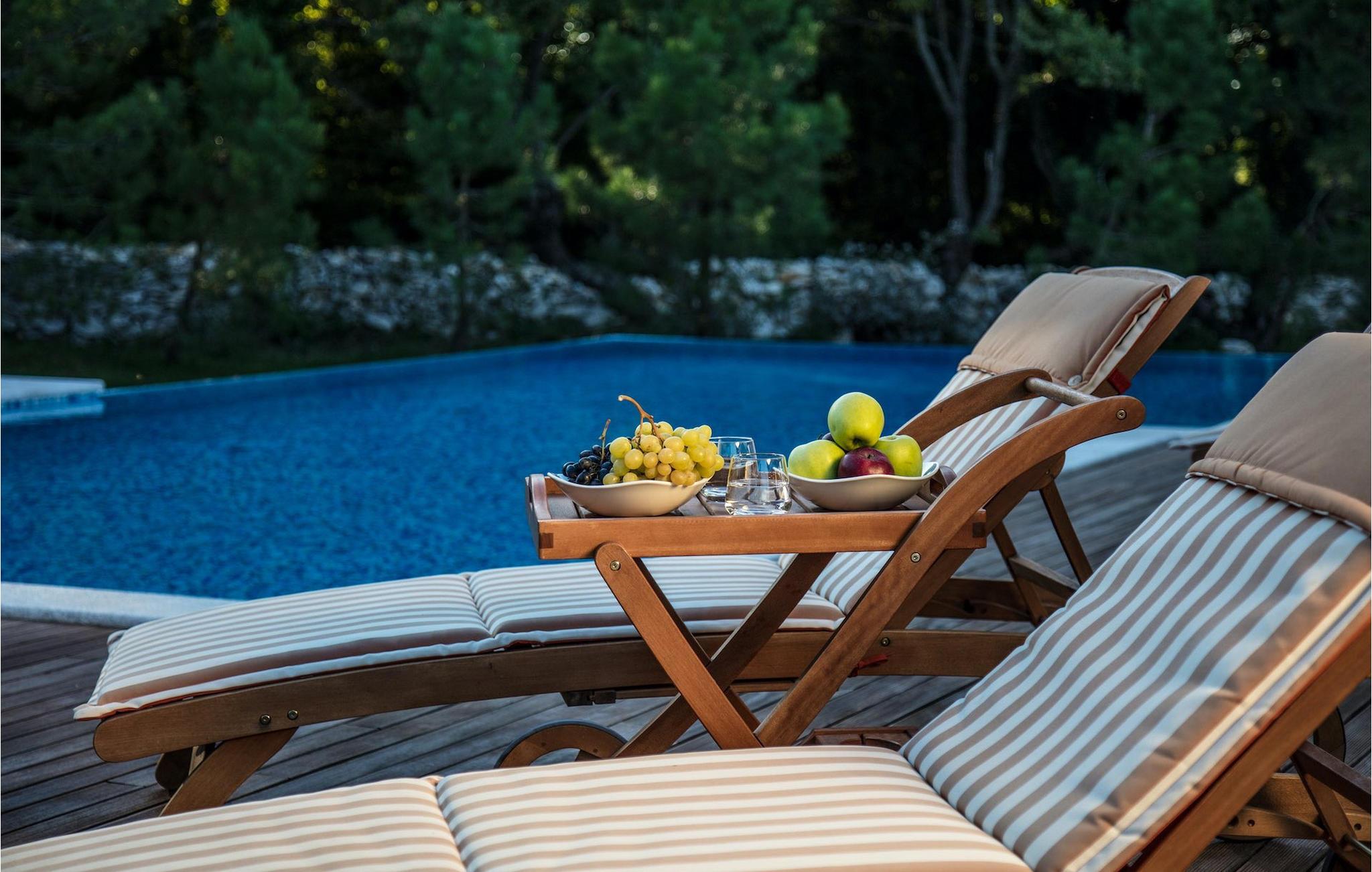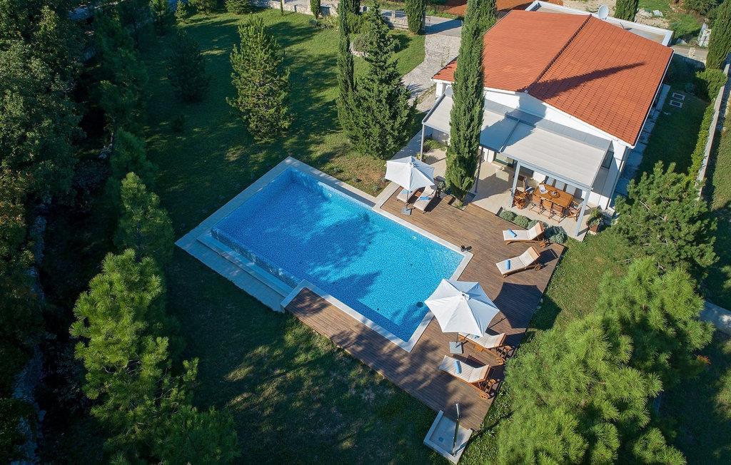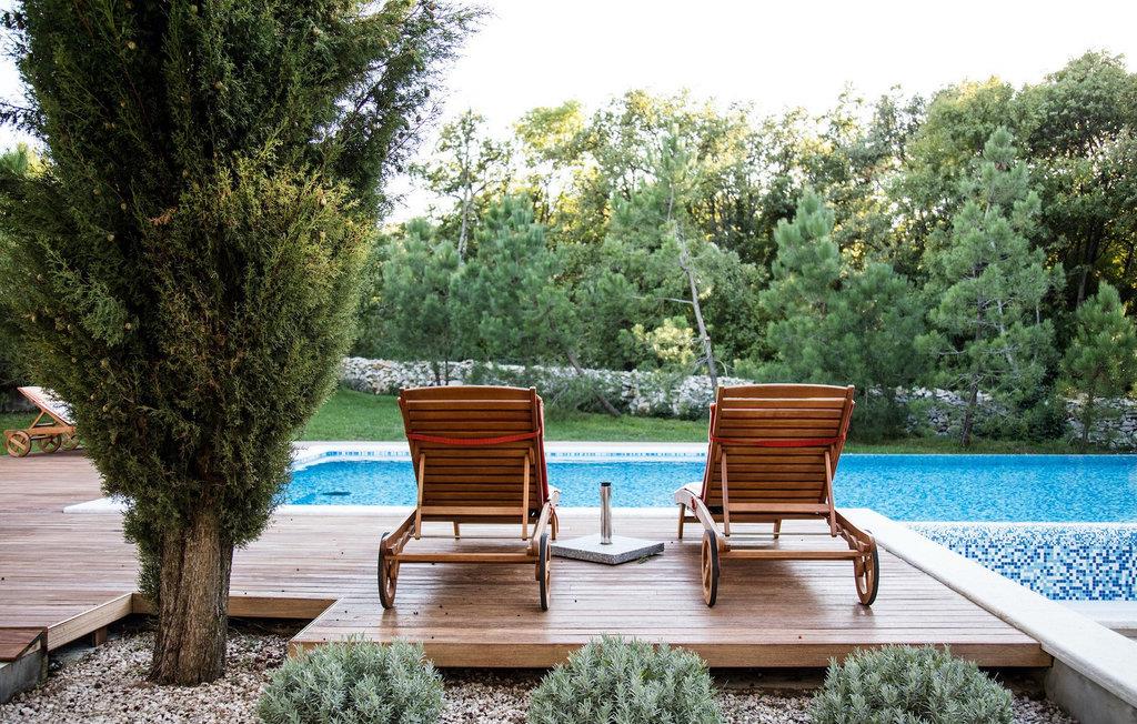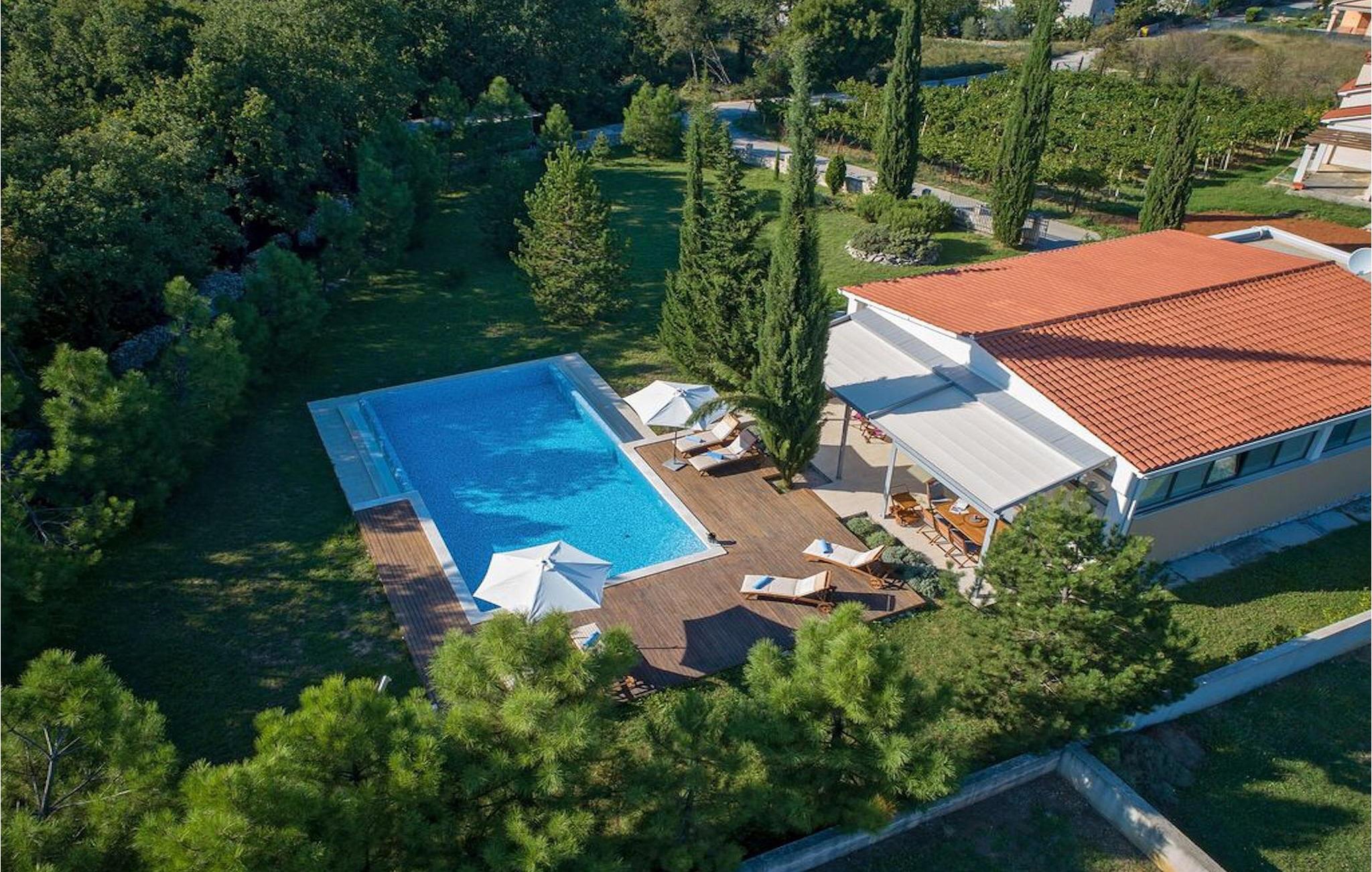 Der Pool der Villa schaut auf einen Wald, der die Villa von einer Seite umgibt und Gemütlichkeit und Komfort bietet. Ein Essbereich im Freien mit Grill ist ebenso vorhanden wie auch zwei umschlossene Parkplätze.